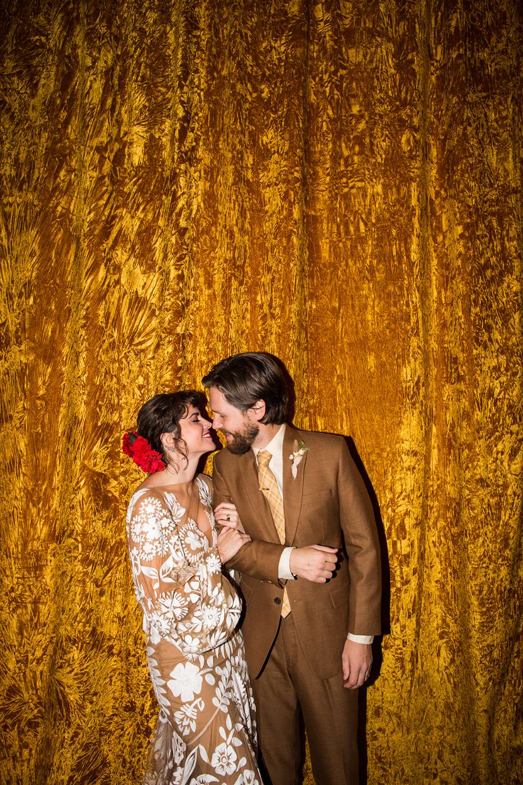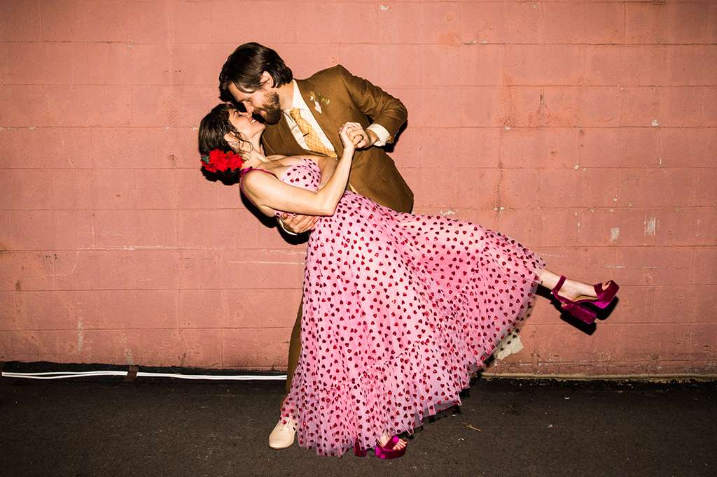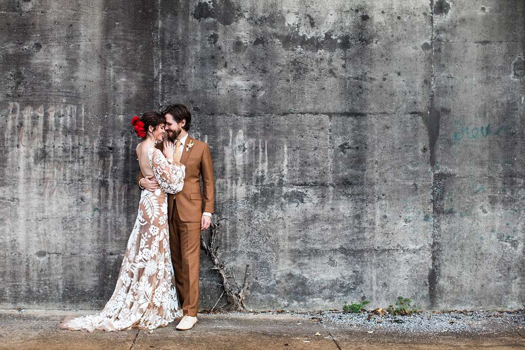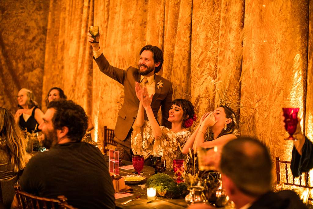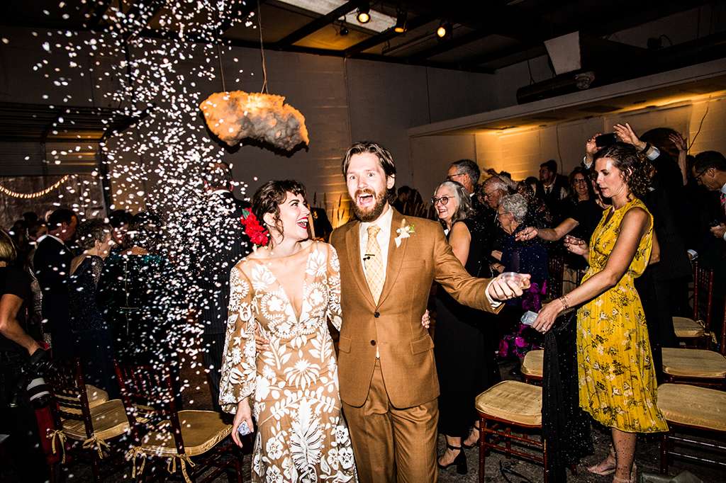 They held their ceremony and reception at the same venue – Spark Vintage Warehouse in Nashville, Tennessee but divided the space in a way that made it feel like the ceremony and reception were in two different worlds. “We swathed the entire reception space in curtains. “We had our hearts set on a very specific crushed velvet curtain, but no rental companies in town had anything close to what we were picturing. Bless our wedding planners, they never gave up and found a way to commission custom draperies in the exact ‘so bad it’s rad’ mustard velvet of our dreams. That rental was one of our biggest expenses but it was so amazingly vibey.”