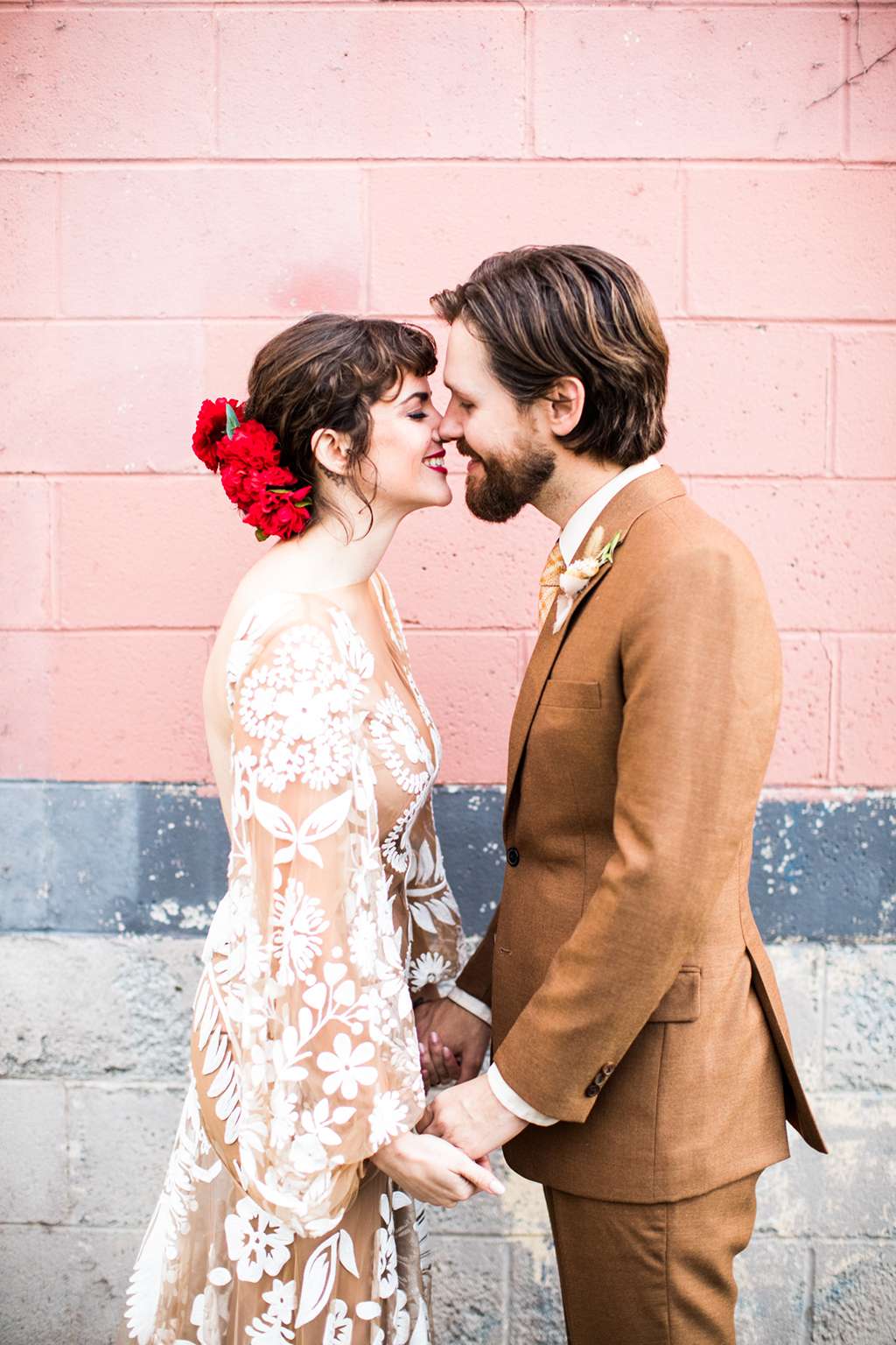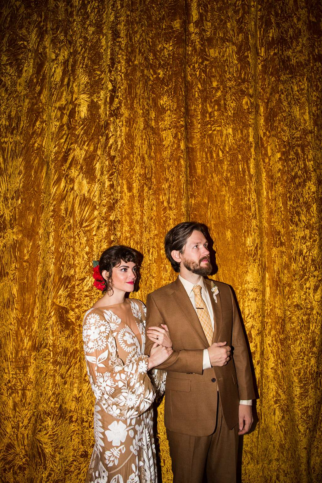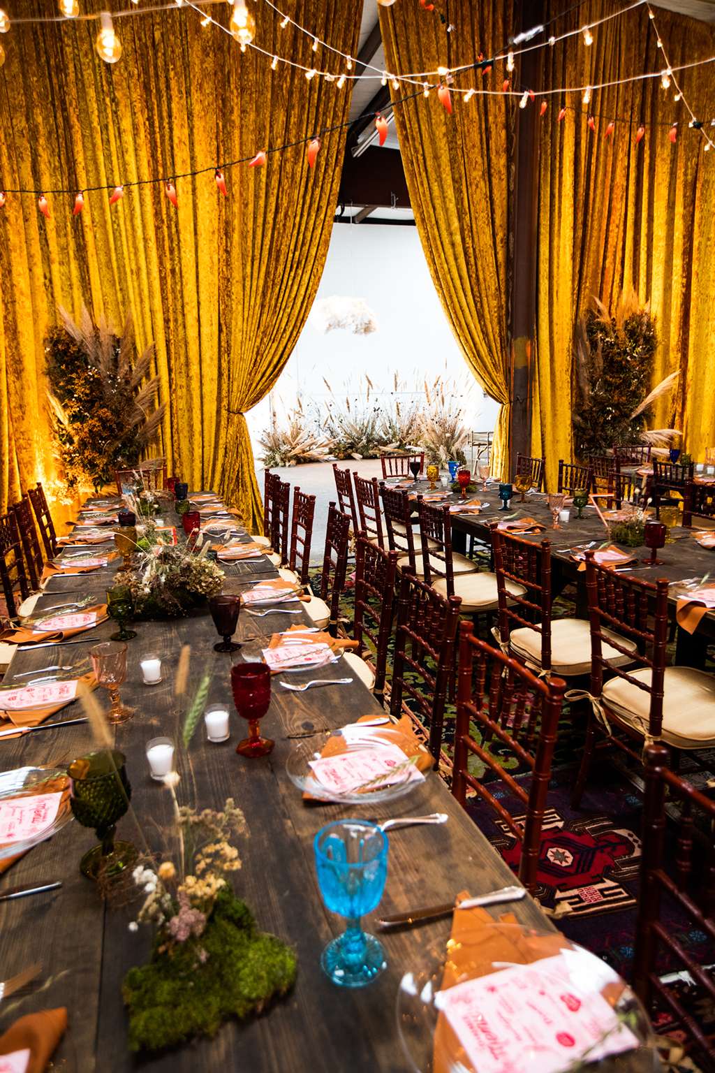 They held their ceremony and reception at the same venue – Spark Vintage Warehouse in Nashville, Tennessee but divided the space in a way that made it feel like the ceremony and reception were in two different worlds. “We swathed the entire reception space in curtains. “We had our hearts set on a very specific crushed velvet curtain, but no rental companies in town had anything close to what we were picturing. Bless our wedding planners, they never gave up and found a way to commission custom draperies in the exact ‘so bad it’s rad’ mustard velvet of our dreams. That rental was one of our biggest expenses but it was so amazingly vibey.”