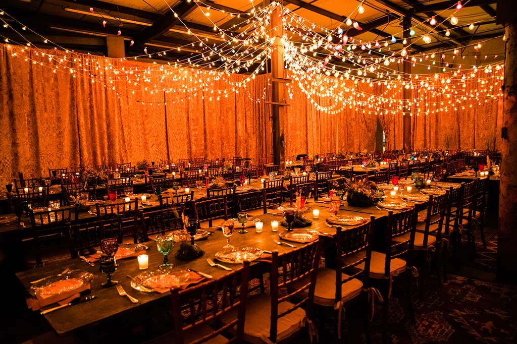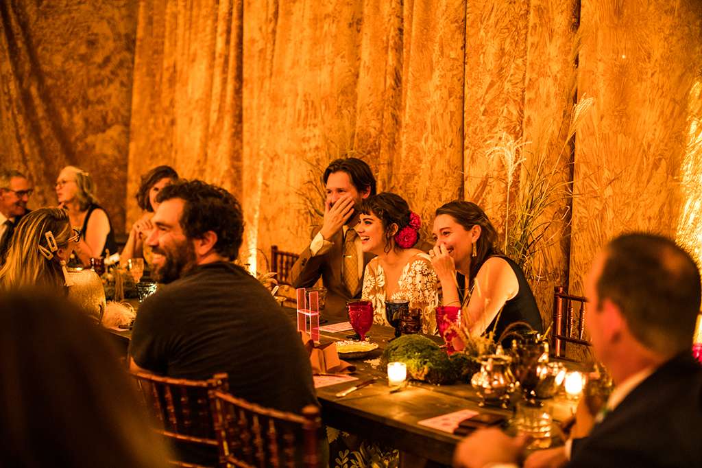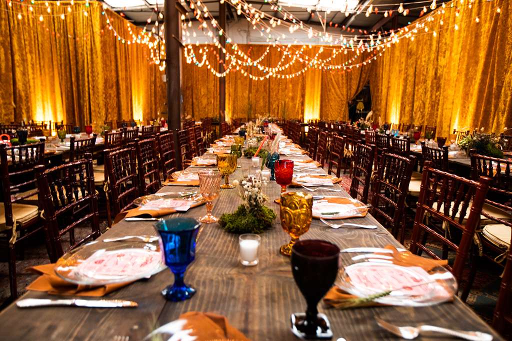 What do you get when the band leader for Kacey Musgraves and a Nashville artist put on a prairie inspired wedding in a vintage rental warehouse? Throw in a tequila shots during the ceremony, a country western two-step band, an aura photographer and a custom dinner tent made from crushed velvet mustard draping and you have a Midnight in Paris inspired wedding dreamland.