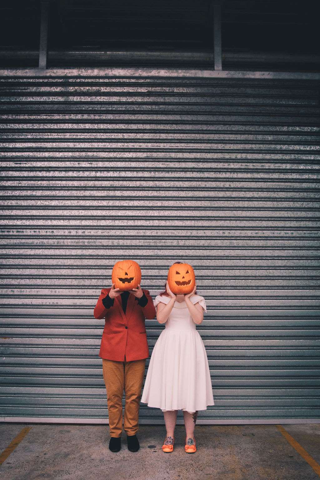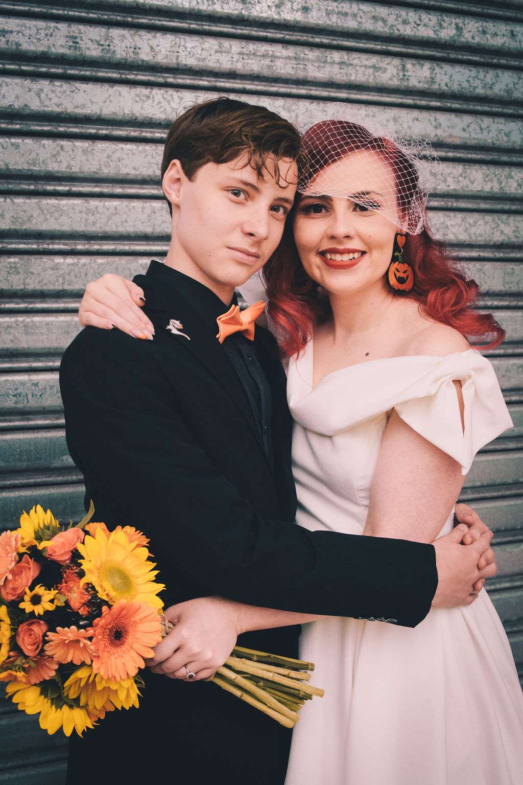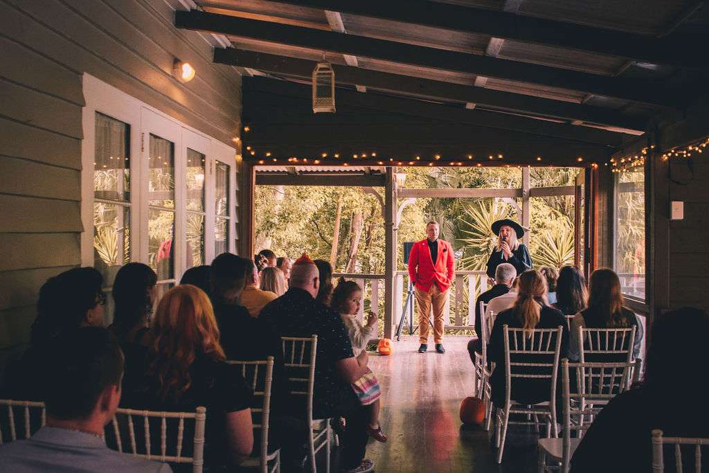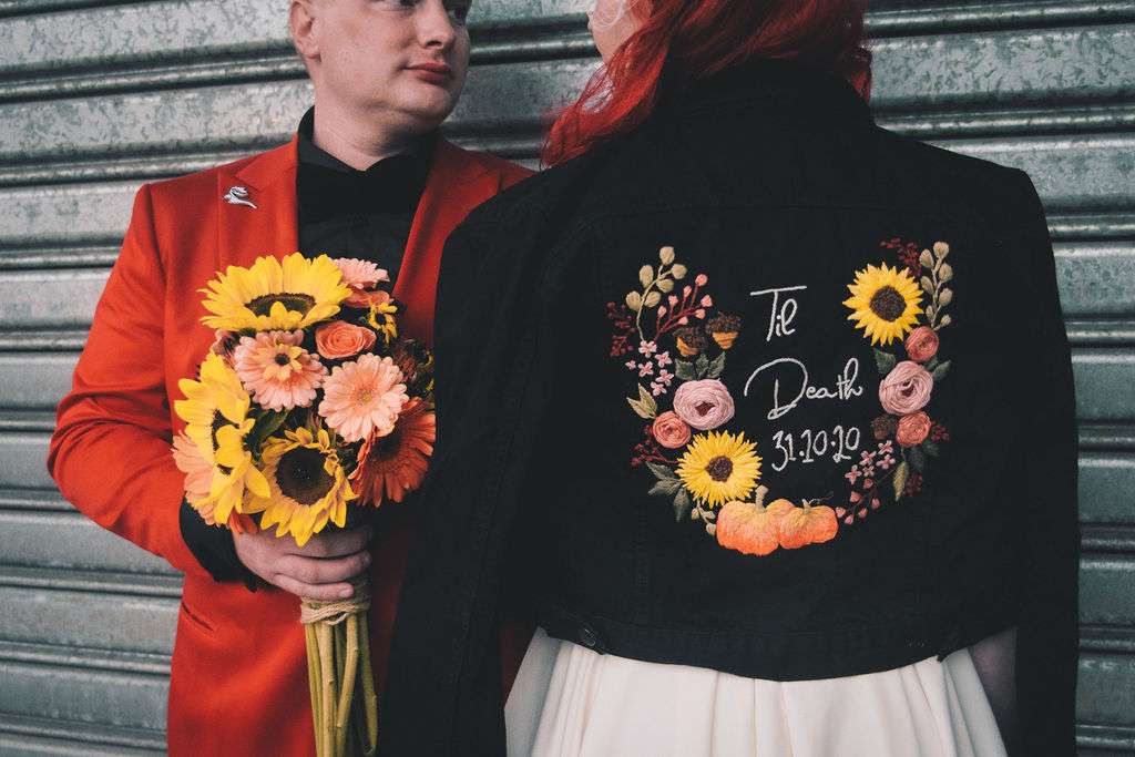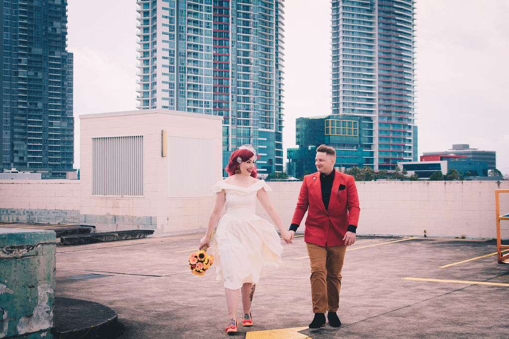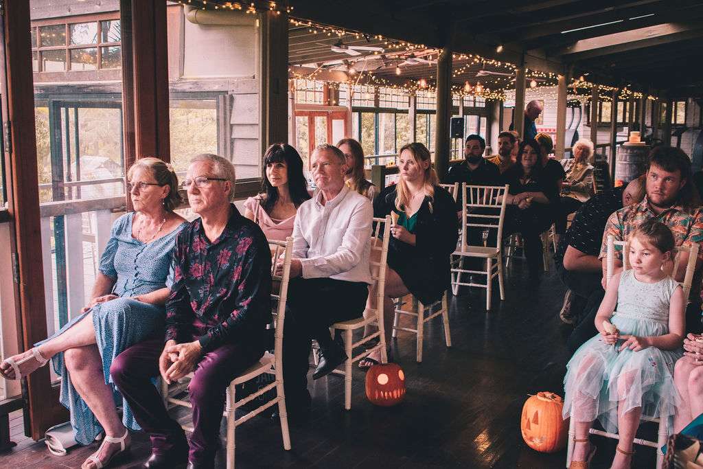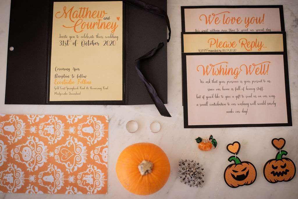 The chose Eco Studio Village in Mudgeeraba, Queensland as their venue and did all the decorating themselves. They bought flowers from the supermarket where Matt works and his cousin made the cake. The stationery was all homemade by the bride using her iPad and Procreate and the music was provided by the bride and her son, who spent hours and hours perfecting playlists! It was the perfect mix of emo love songs, 90s pop bangers and songs from their youth. And, of course, Matt carved A LOT of pumpkins!