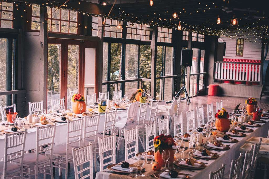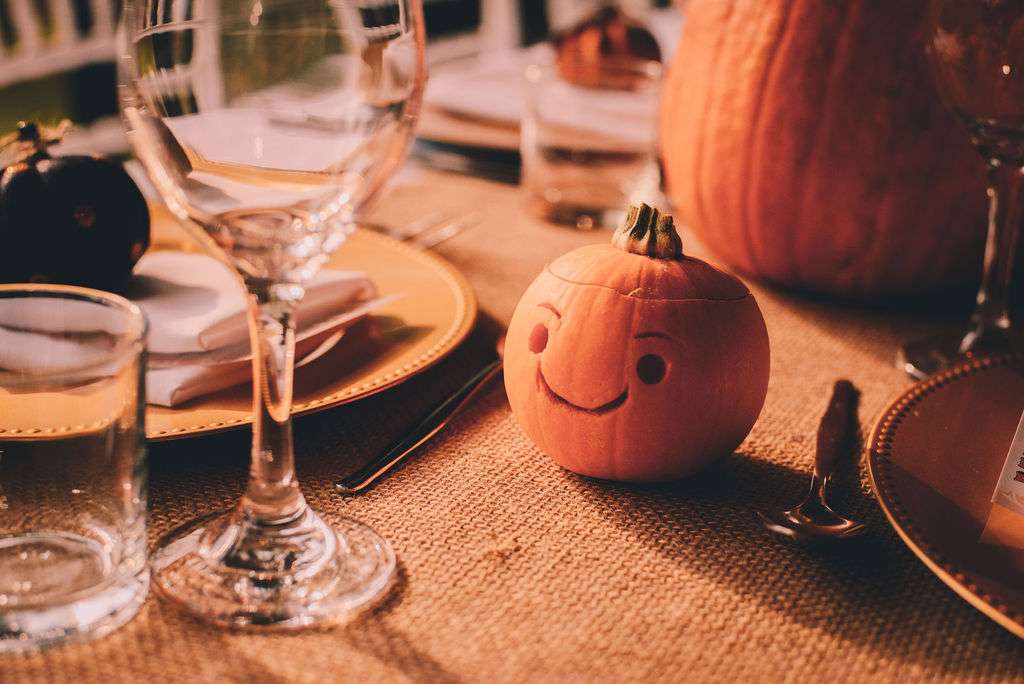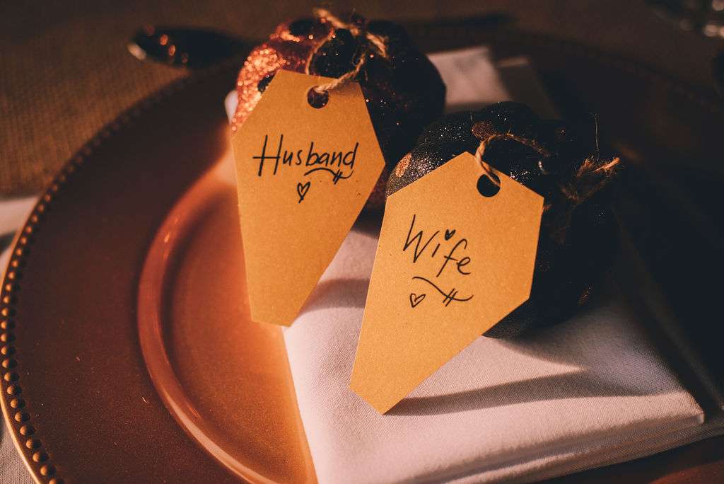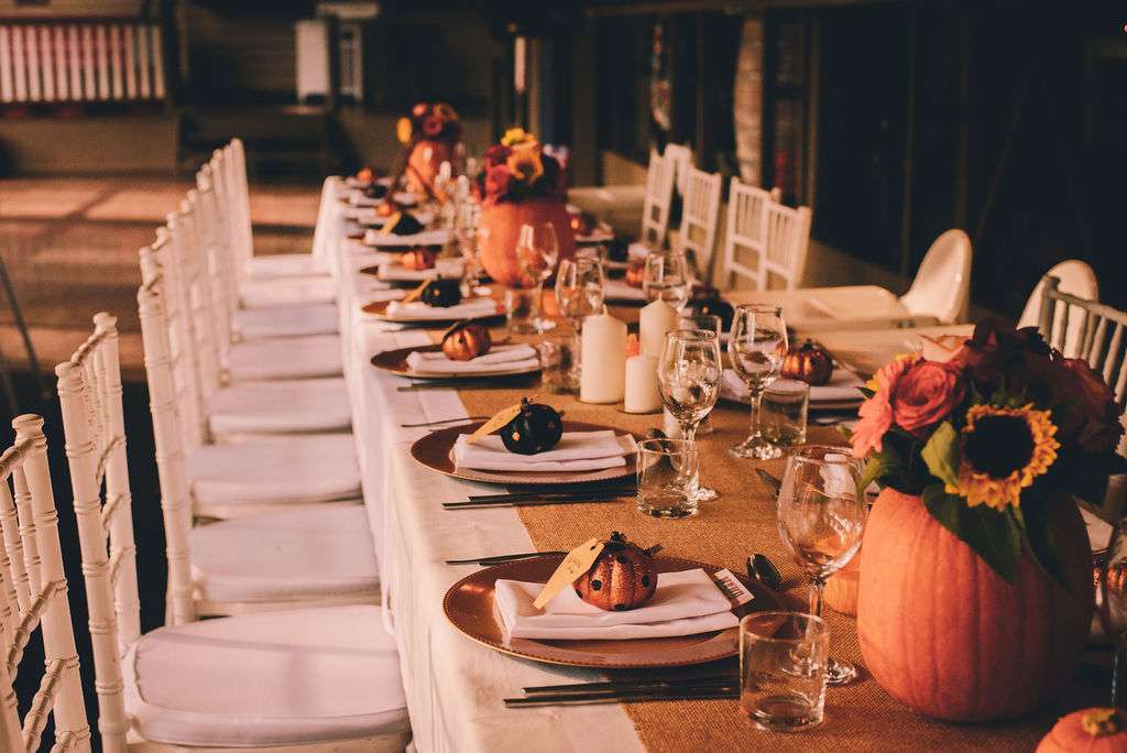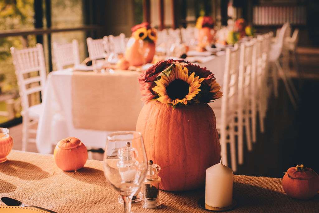 “The venue was beautiful”, Courtney said, “being rustic and in nature. The venue and fairy lights really did all the work! We used pumpkins for vases for our table arrangements. Matt also carved teeny tiny pumpkins for all the tables and large jack-o-lanterns to place around. It would not be Halloween our party without pumpkins!”