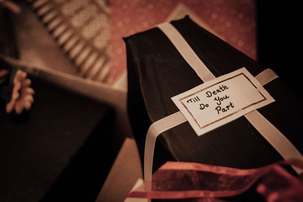 “We also had cute handmade coffin shaped name tags and glitter pumpkins for all our guests. Matt and I crafted a vintage suitcase for our wishing well and Matt hand painted Jack Skellington stripes on the outside to make it more suited to us, we also lined the inside with deep red velvet.”