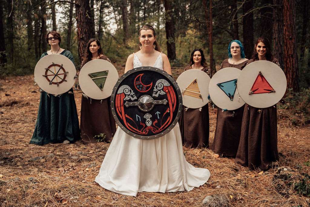 Their Big Day ceremony was as far from a modern, traditional wedding ceremony as they could get. Their officiant was a Druid. The shield-maidens wielded their soulful shields with pride, and they had a drummer pounding the wedding party in with a powerful beat. In a further break from tradition, Fae was given away by the bridal party as a surprise. They also used their bridal party to represent the five elements (fire, air, earth, water and spirit), and burned the blood collected during their private ceremony over a bonfire. Fae and Ryan exchanged swords; one to pass on to their firstborn and the other being the symbol of protection for their family.