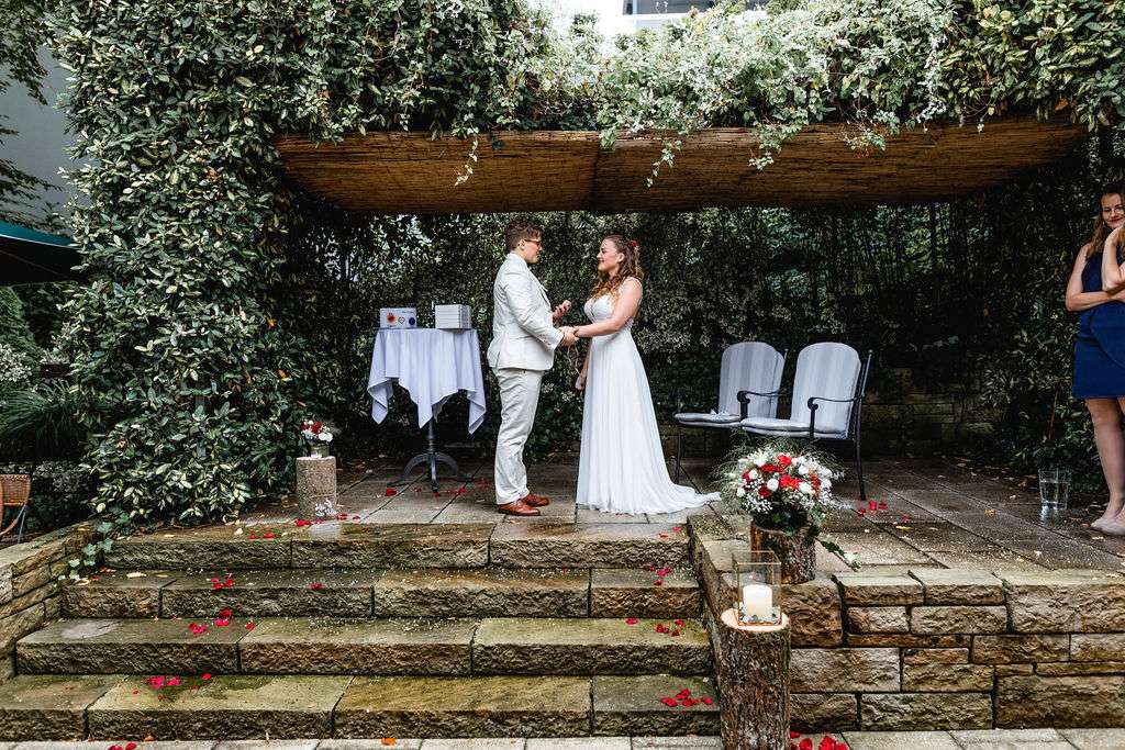 “Make You Feel my Love by Adele was then played and we said our vows, written on rainbow cards. At the end we exchanged rings, threw our cards in the air and gave each other a really long and hot kiss!”