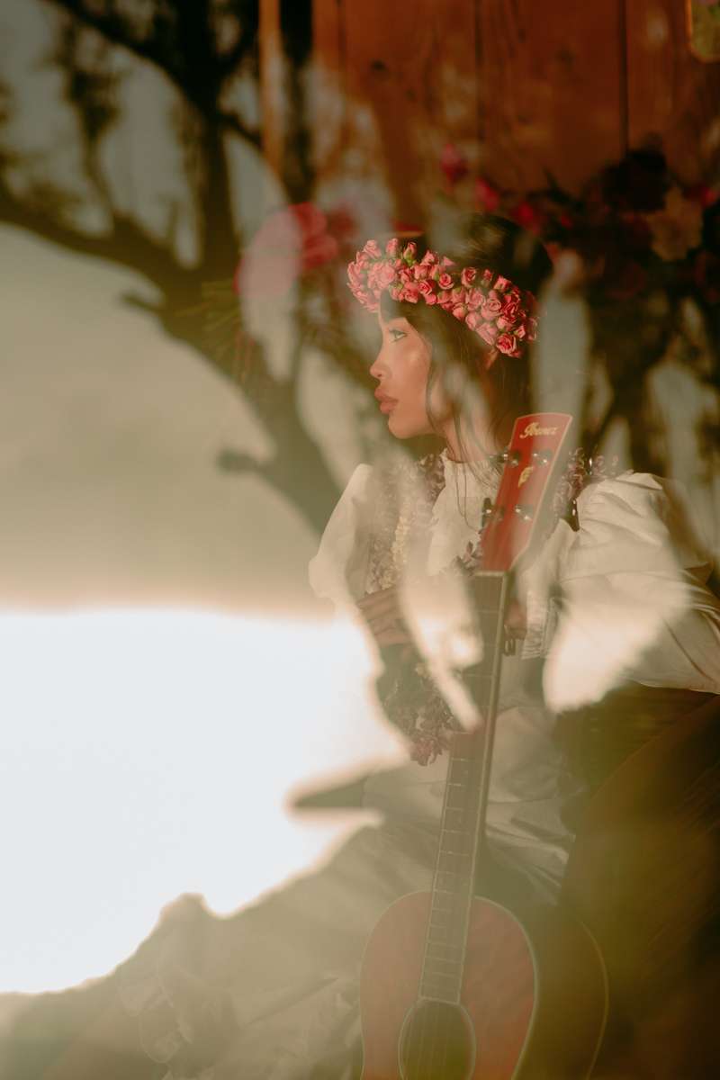 “For this reason, we choose to shoot at Camp Palehua, a 1600 acre conservation and agricultural land located on the southern slopes of the Wai’anae Mountains. When you drive up you are welcomed by roaming livestock and rolling clouds. This was the creative canvas that we were able to paint on. It doesn’t take much to make this space beautiful, but we decided to still add in colourful floral arrangements of local tropical flowers that mimicked the flowers seen on Pā’ū Riders (female horseback riders).”
