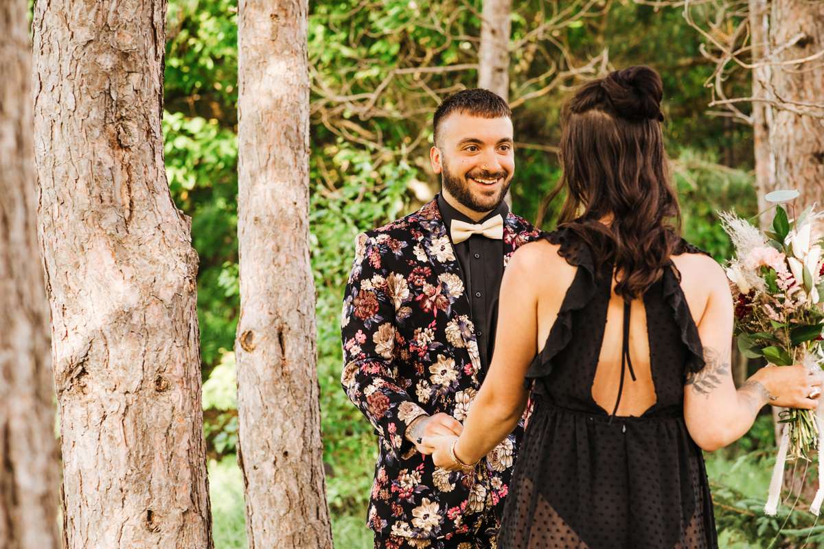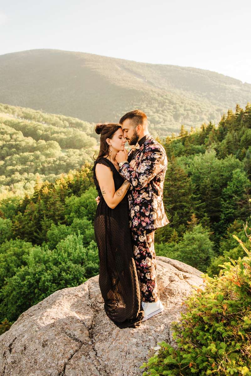 Sarah and Chris had the most amazing elopement at Artists Bluff in New Hampshire last summer, and despite all the challenges that 2020 threw their way, they worked their personal styles into the most fun, laid-back and truly perfect-for-them day. Sarah wore a sheer black Lulu’s dress, Chris had a floral suit which he found on Amazon and they rocked matching Vans.