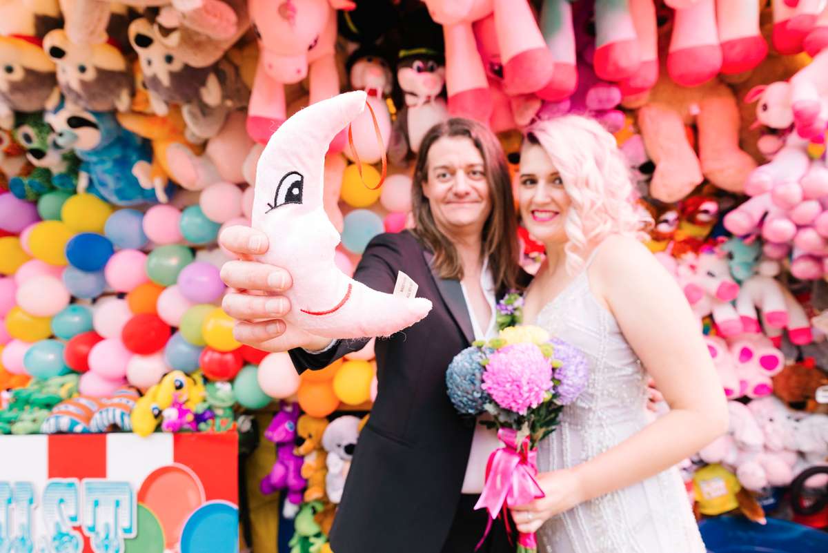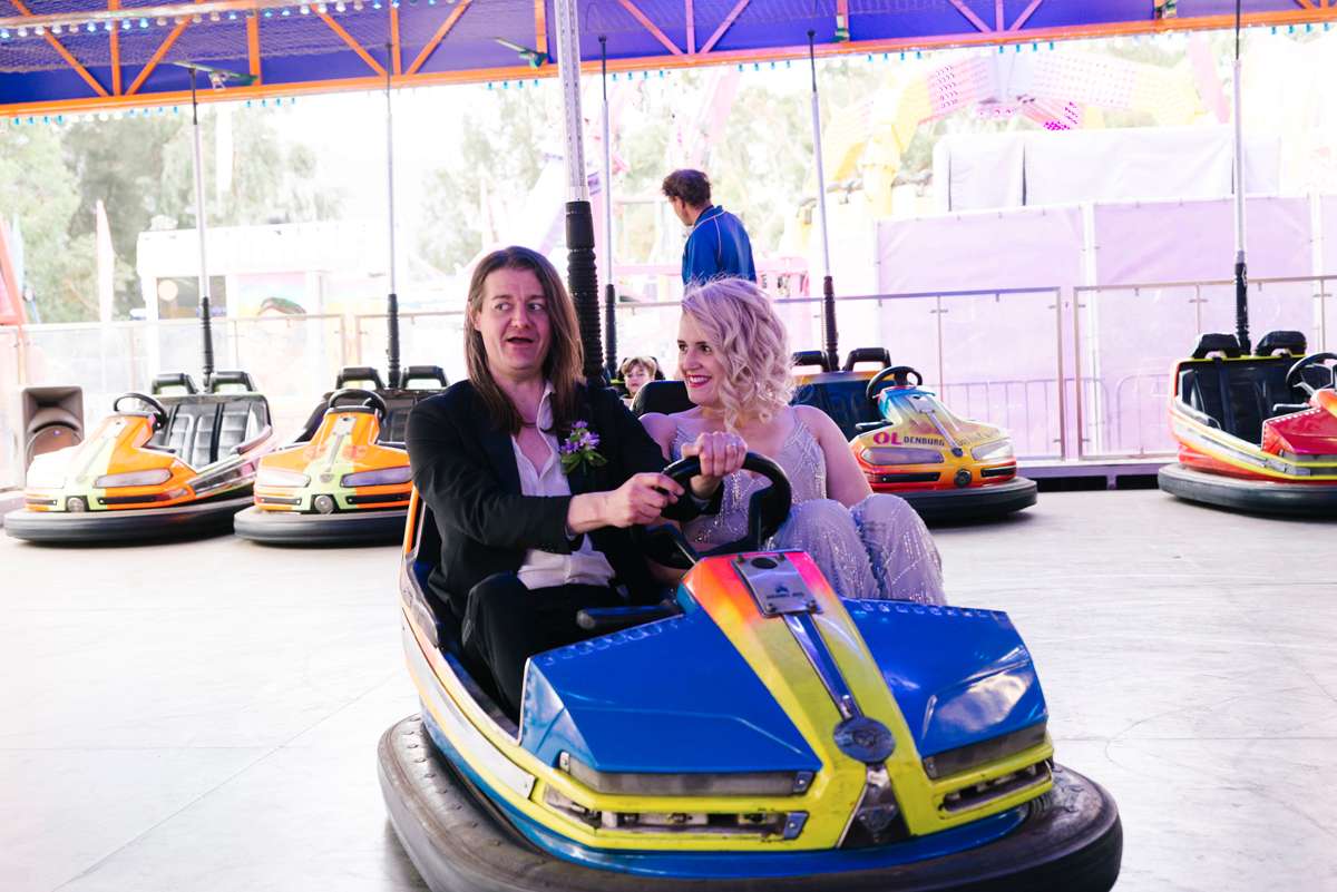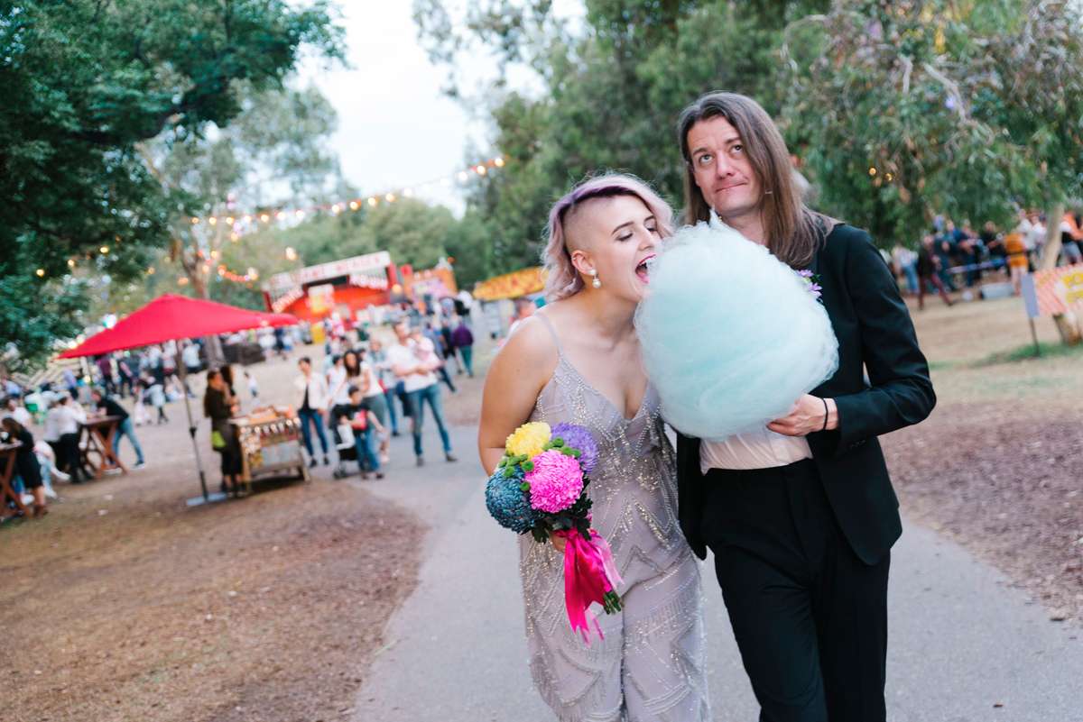 Nothing about this wedding was traditional – from the bride’s ASOS jumpsuit and hot pink shoes, to the photos at the festival’s fun fair and the ceremony which took place on a stage.