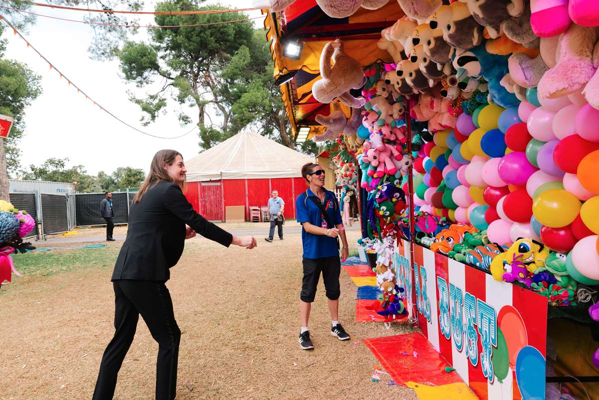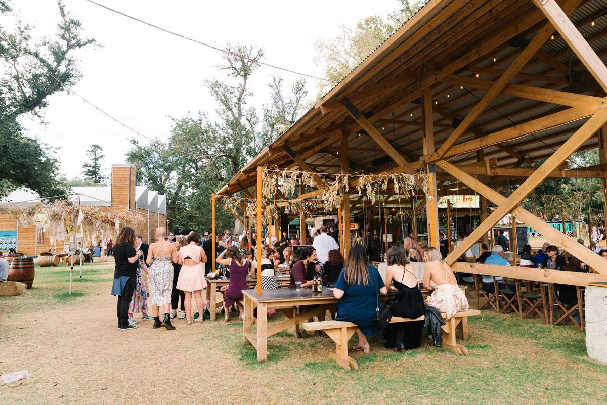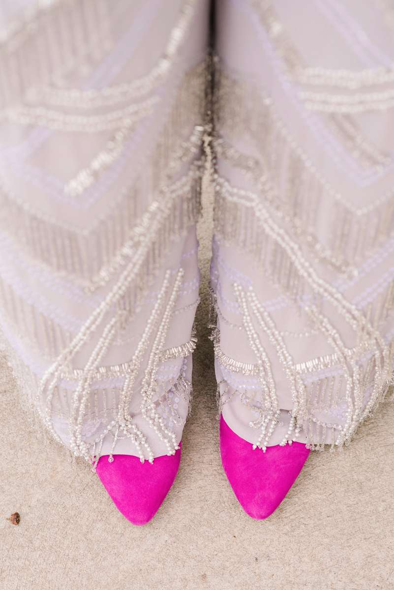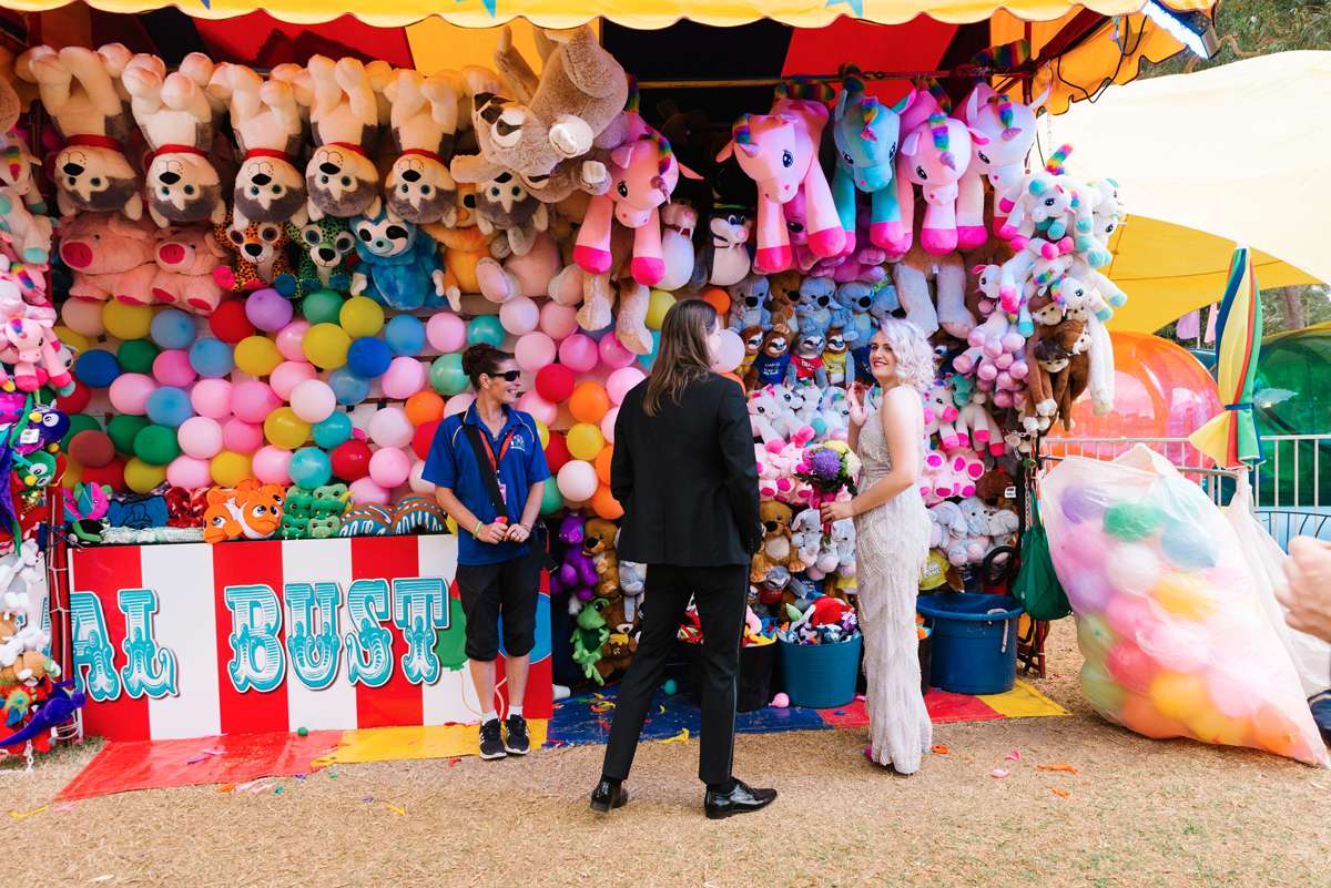 Nothing about this wedding was traditional – from the bride’s ASOS jumpsuit and hot pink shoes, to the photos at the festival’s fun fair and the ceremony which took place on a stage.
