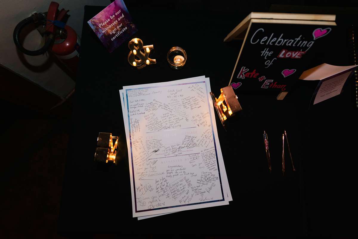 “The ceremony took place on the ‘stage’ of the venue, decorated simply by a large rug and some fairy lights. Our celebrant was Mark, the lead singer and keyboardist of Massaoke. We exchanged vows and rings, made by our friend Lee (partner of Neil the guitarist) who was in London and couldn’t be there. The rings made it ‘official’ to us as we didn’t have rings in Gibraltar and I never had an engagement ring.”