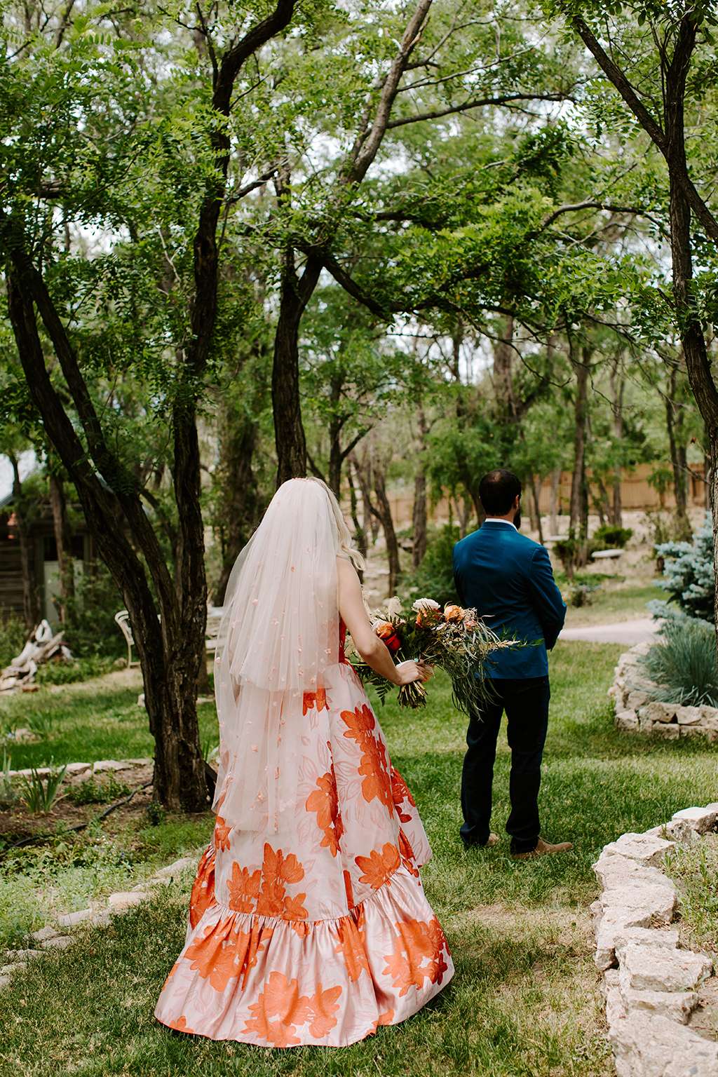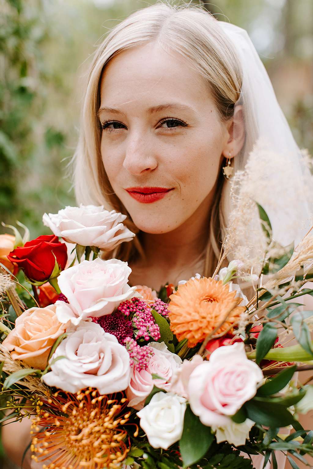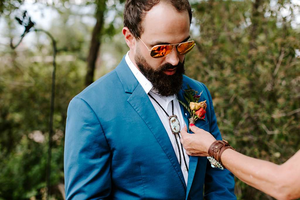 Ava wore the dress she had initially intended for her rehearsal dinner – a red, floral number by BHLDN. “As a graphic designer, I have always enjoyed colour, so this actually worked out perfectly. It was a warm summer’s day and it photographed beautifully with the flowers by Cosette’s Creations.” Nick wore a bolo tie in homage to Ava’s grandfather and his trusty Levi’s.