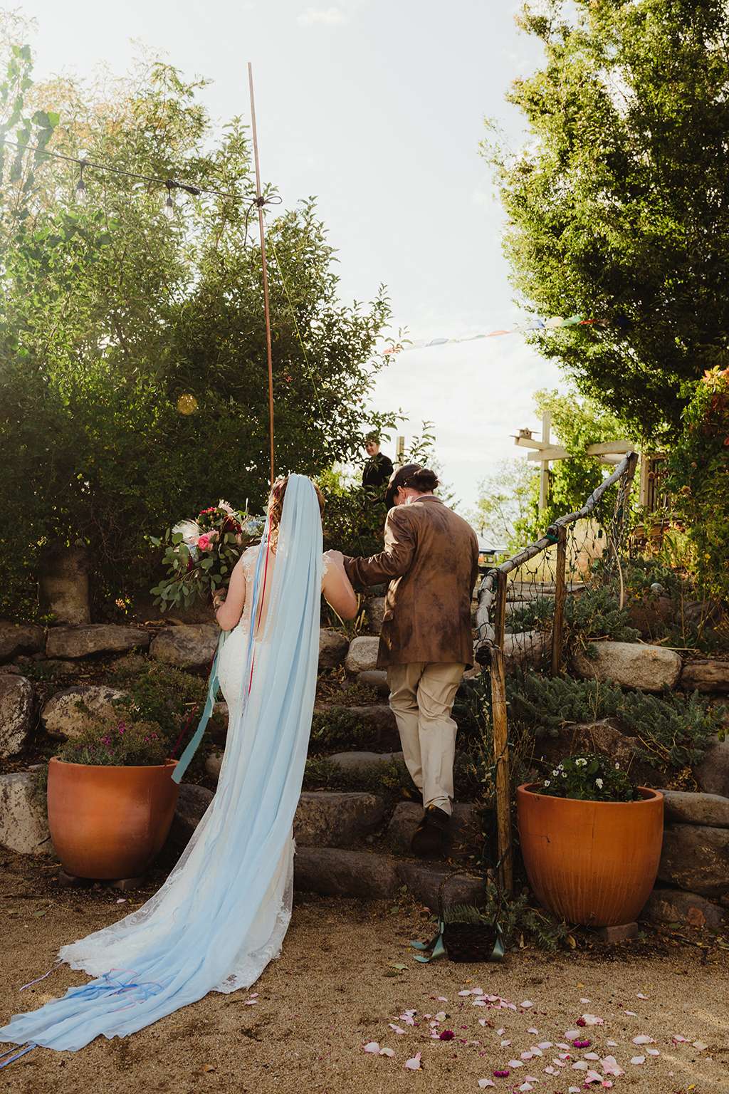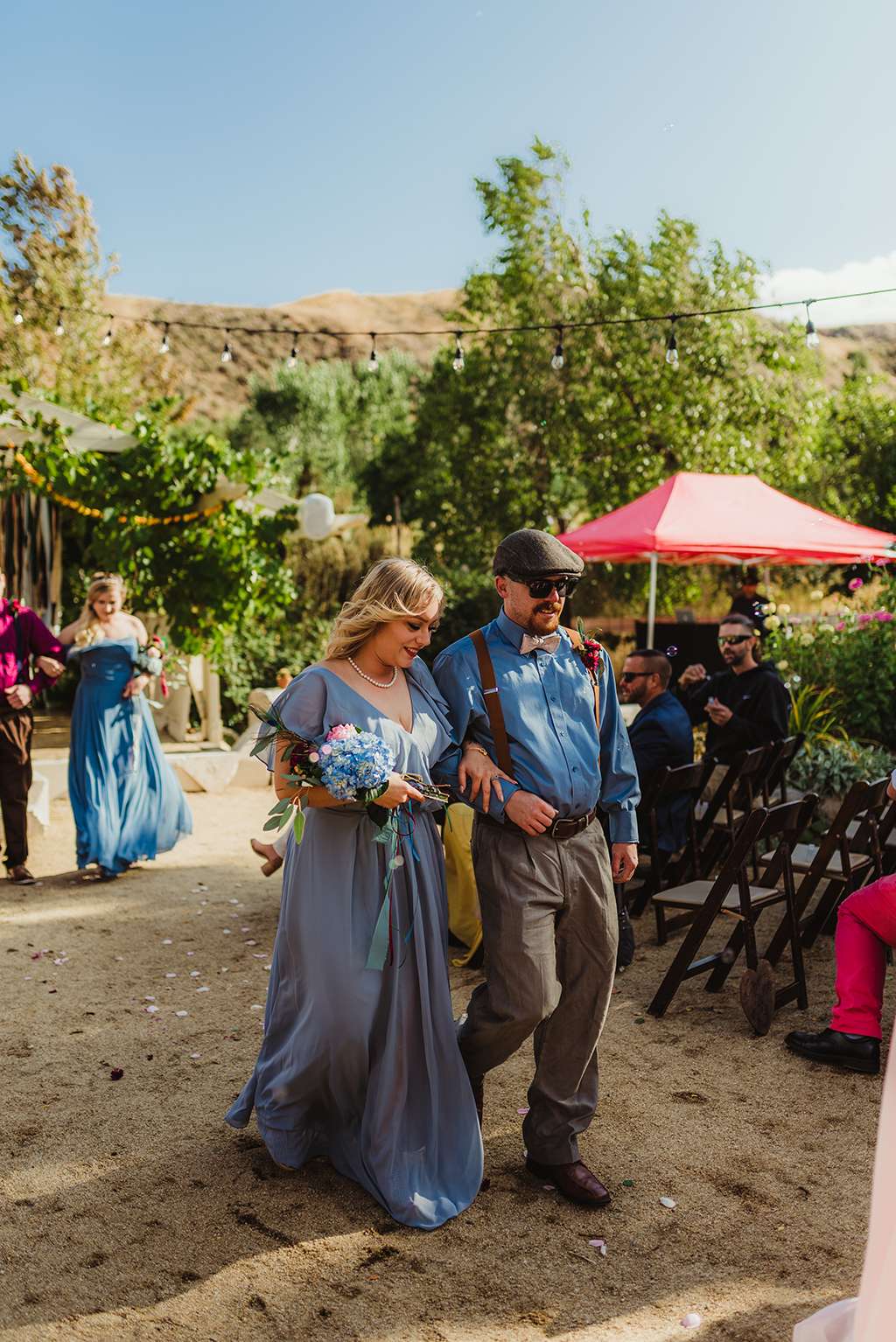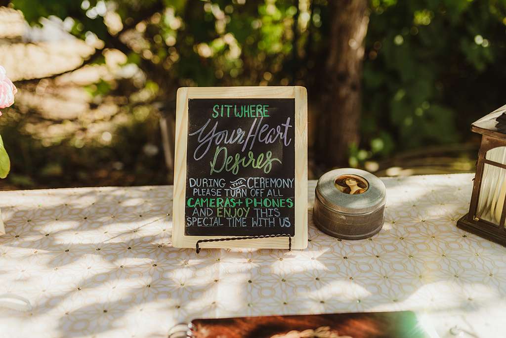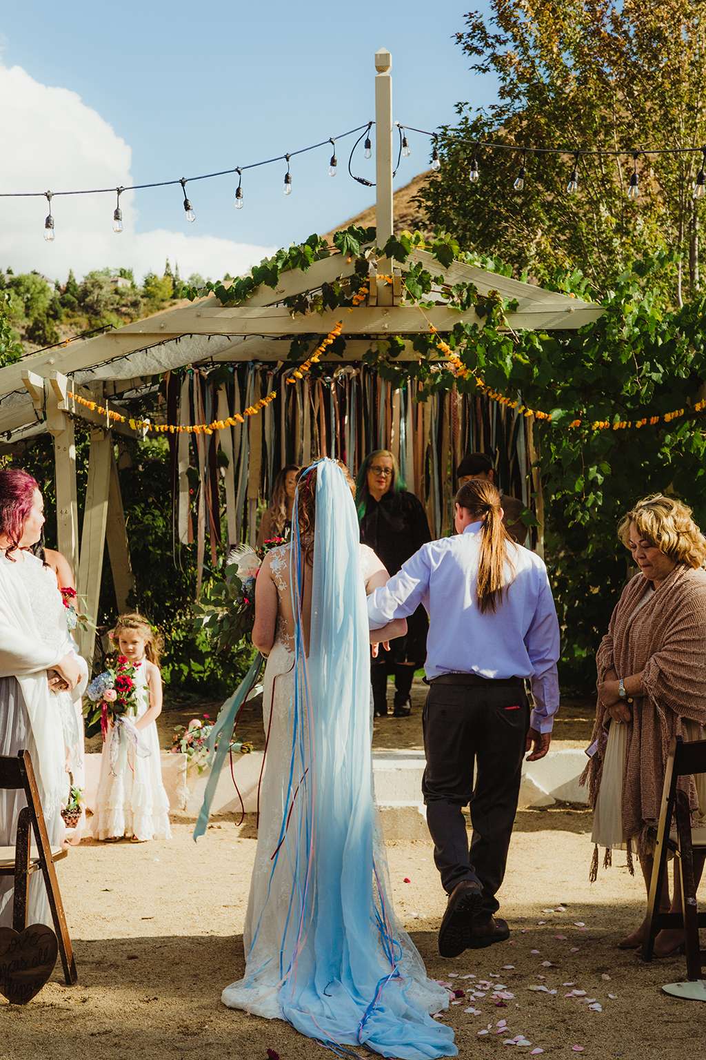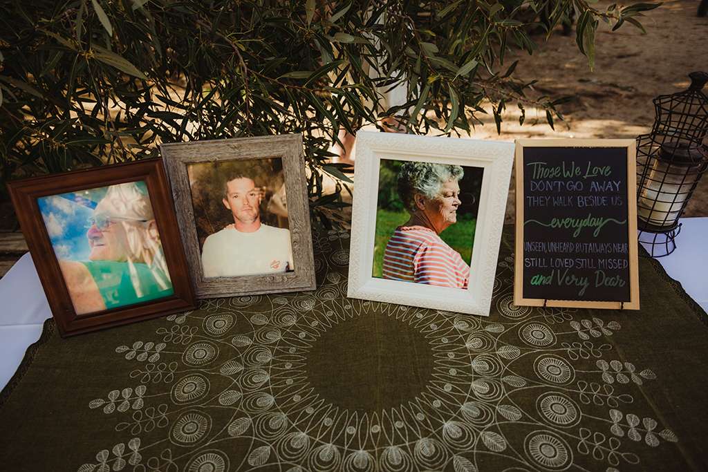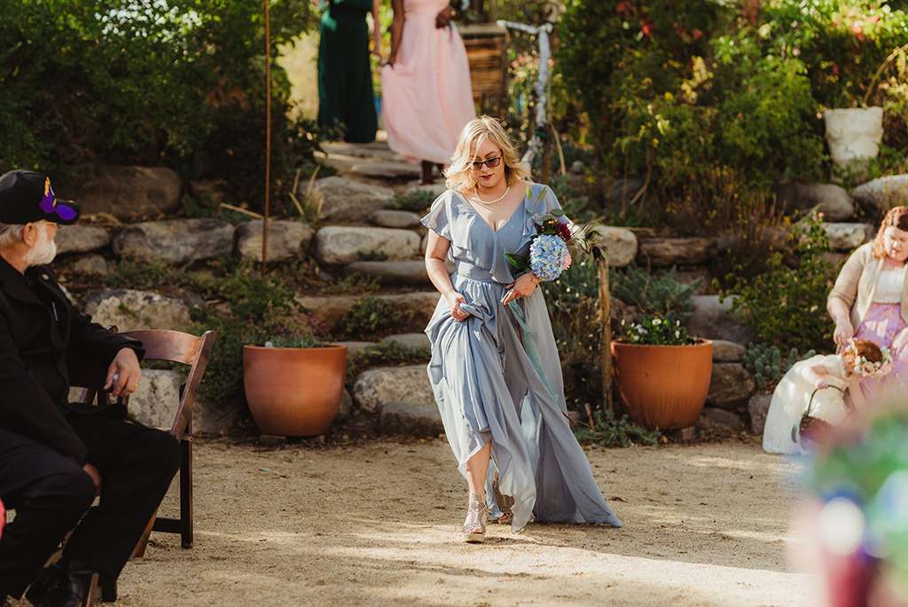 Each tablescape was a unique collection of found objects from thrift stores, and every decision for the wedding was handpicked by the bride with their guests’ comfort and needs in mind. She made all the backdrops and signage, all stationery and origami, even embroidering a pocket square for Ben’s suit. She made all the flower arrangements by buying wholesale from Fifty Flowers, and made memorial photo frames to hang from her bouquet. She even made her blue veil herself.
