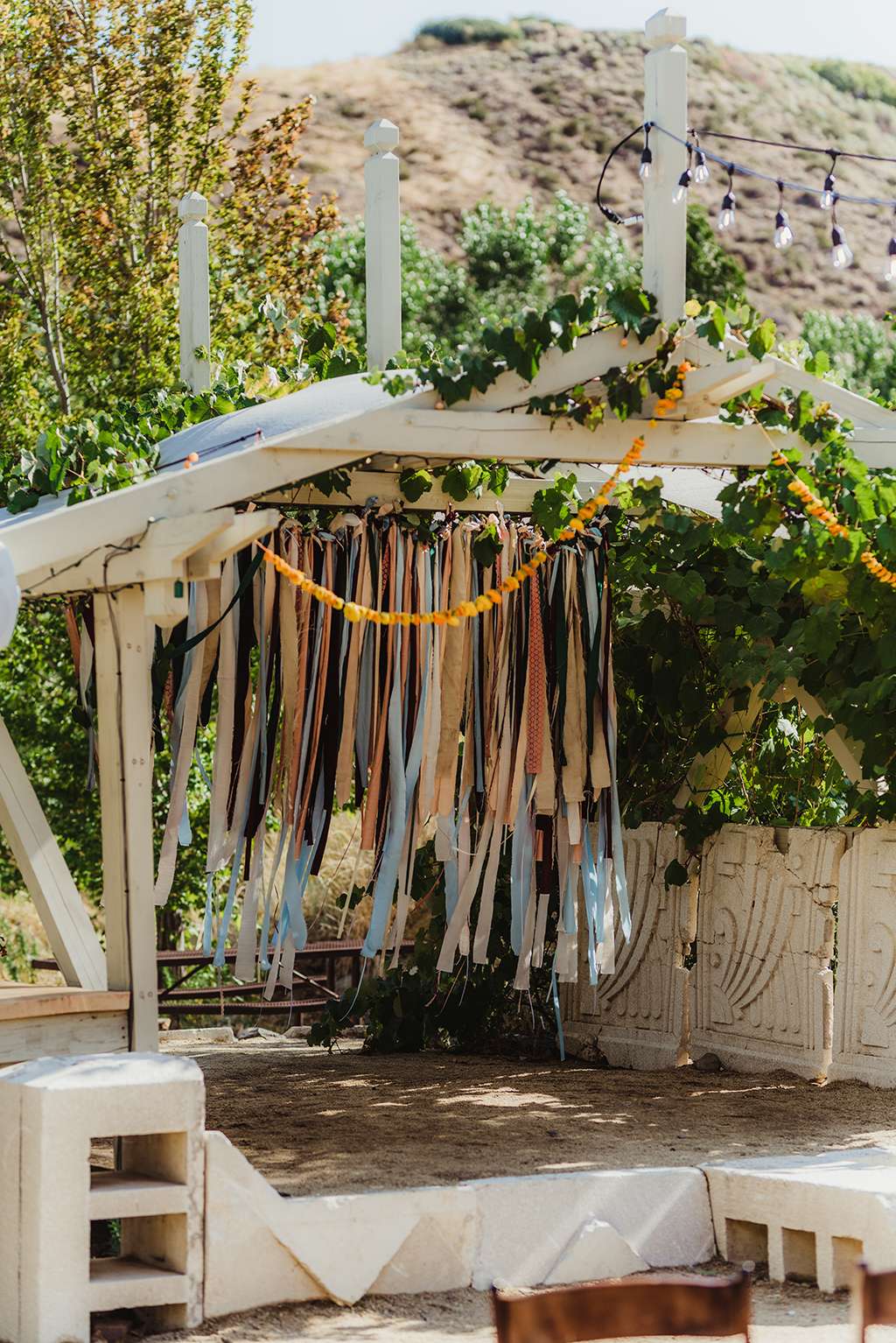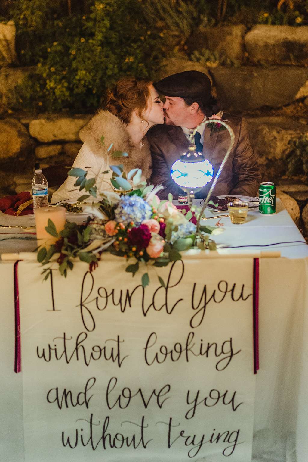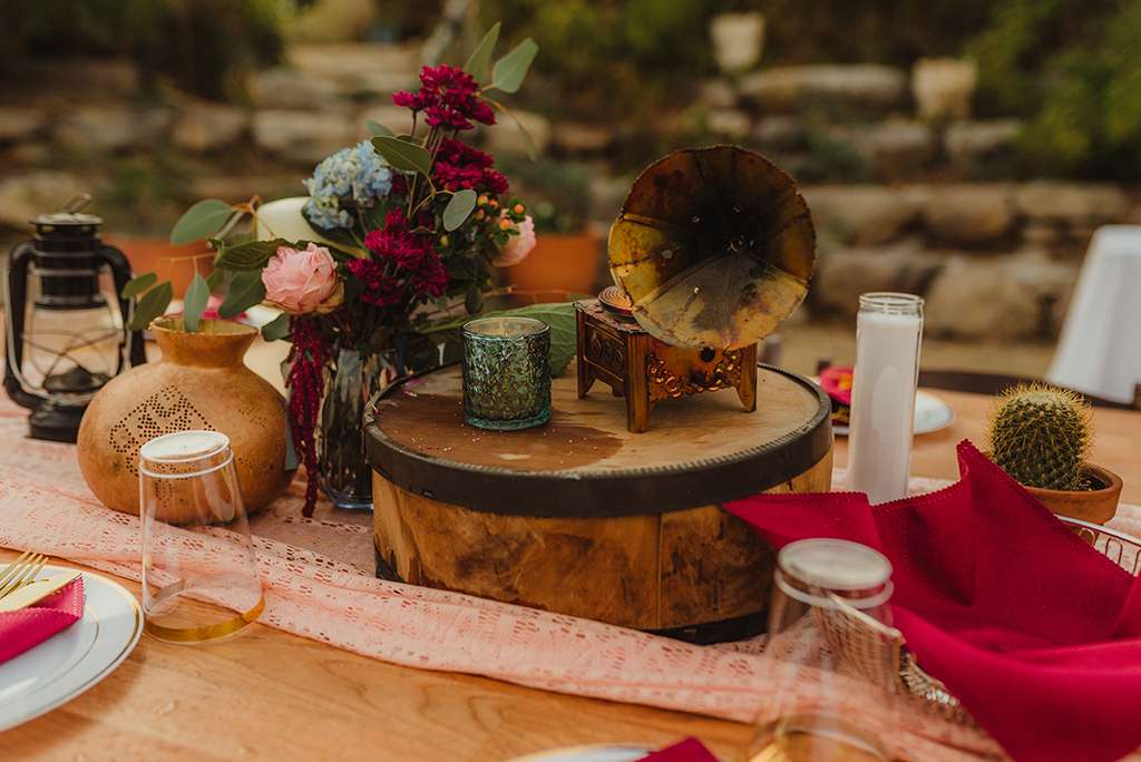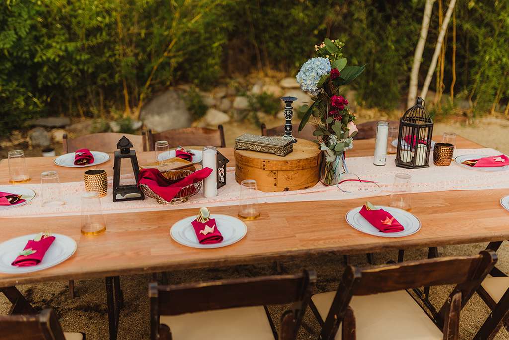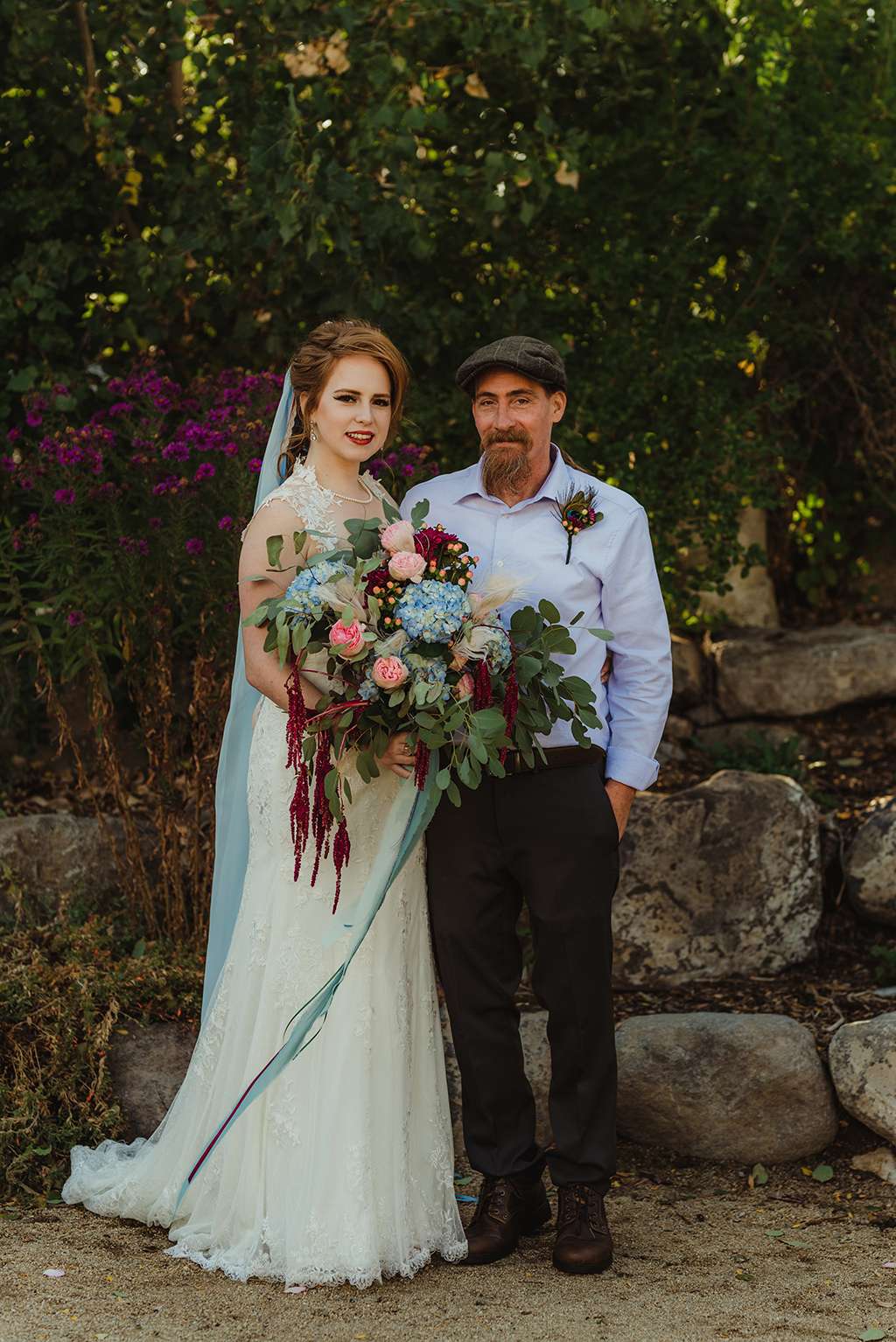 Each tablescape was a unique collection of found objects from thrift stores, and every decision for the wedding was handpicked by the bride with their guests’ comfort and needs in mind. She made all the backdrops and signage, all stationery and origami, even embroidering a pocket square for Ben’s suit. She made all the flower arrangements by buying wholesale from Fifty Flowers, and made memorial photo frames to hang from her bouquet. She even made her blue veil herself.
