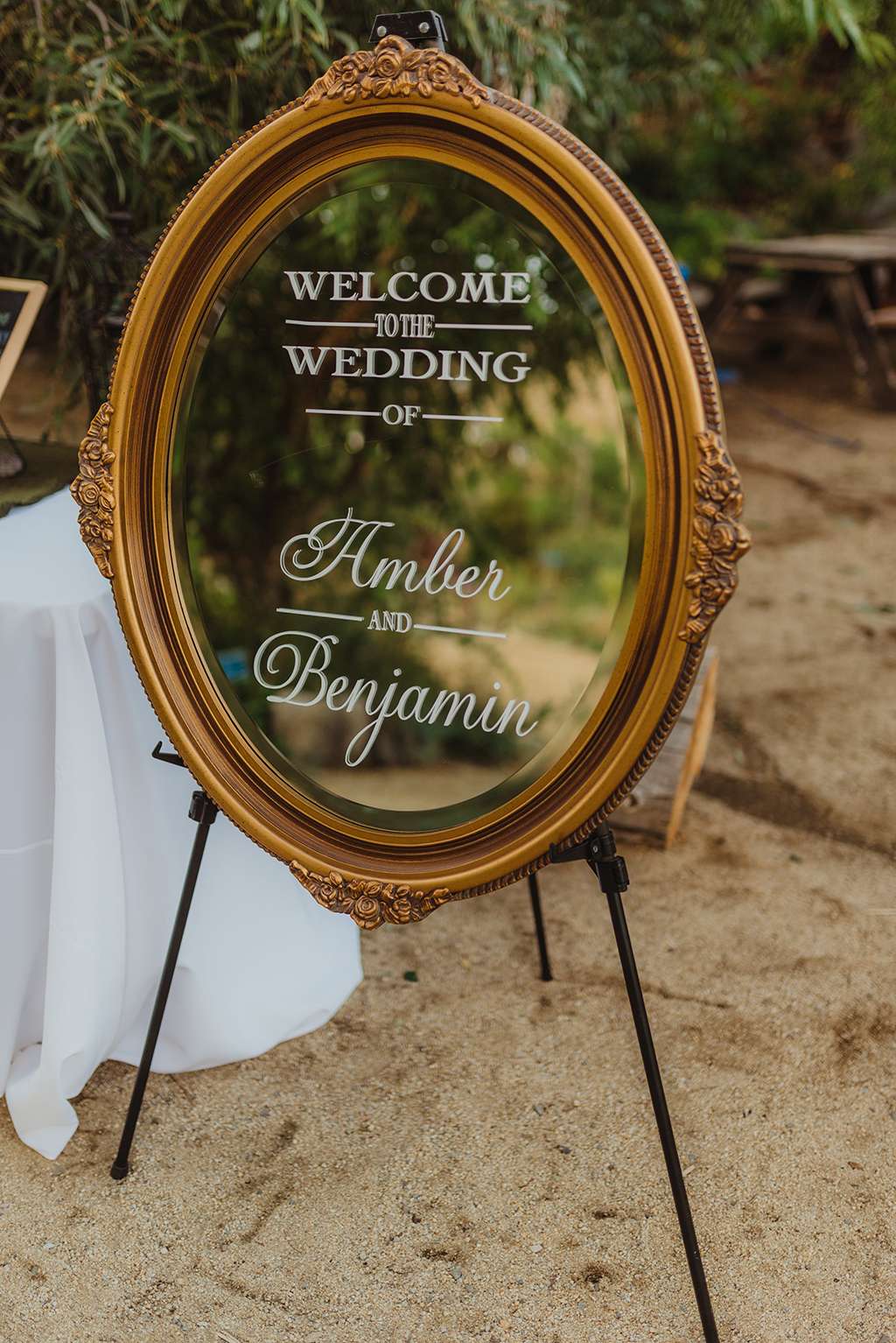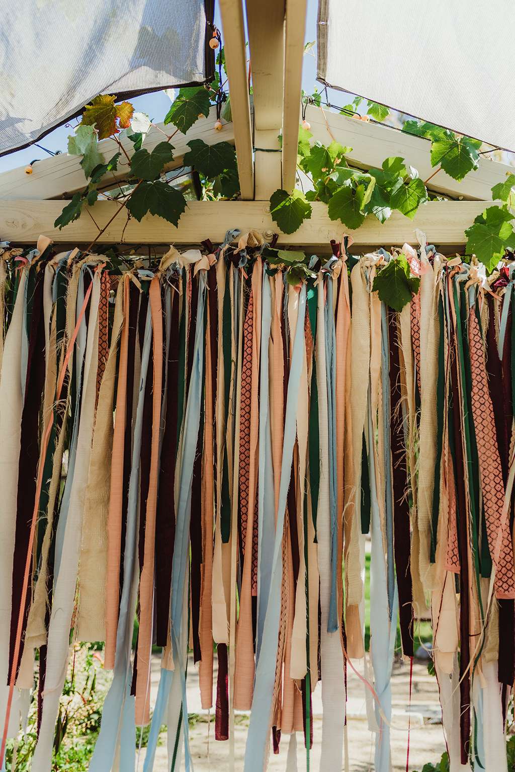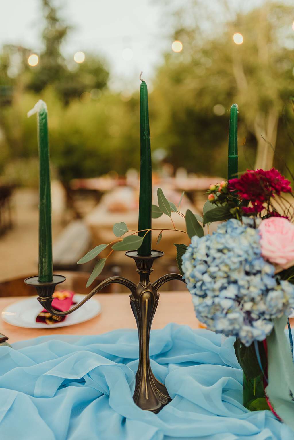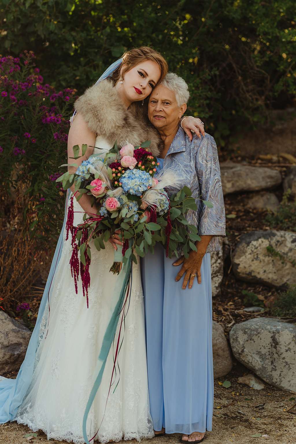 Each tablescape was a unique collection of found objects from thrift stores, and every decision for the wedding was handpicked by the bride with their guests’ comfort and needs in mind. She made all the backdrops and signage, all stationery and origami, even embroidering a pocket square for Ben’s suit. She made all the flower arrangements by buying wholesale from Fifty Flowers, and made memorial photo frames to hang from her bouquet. She even made her blue veil herself.