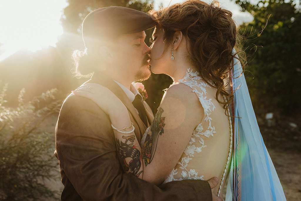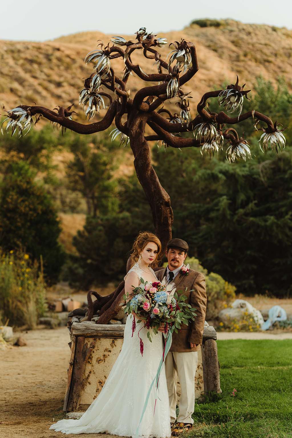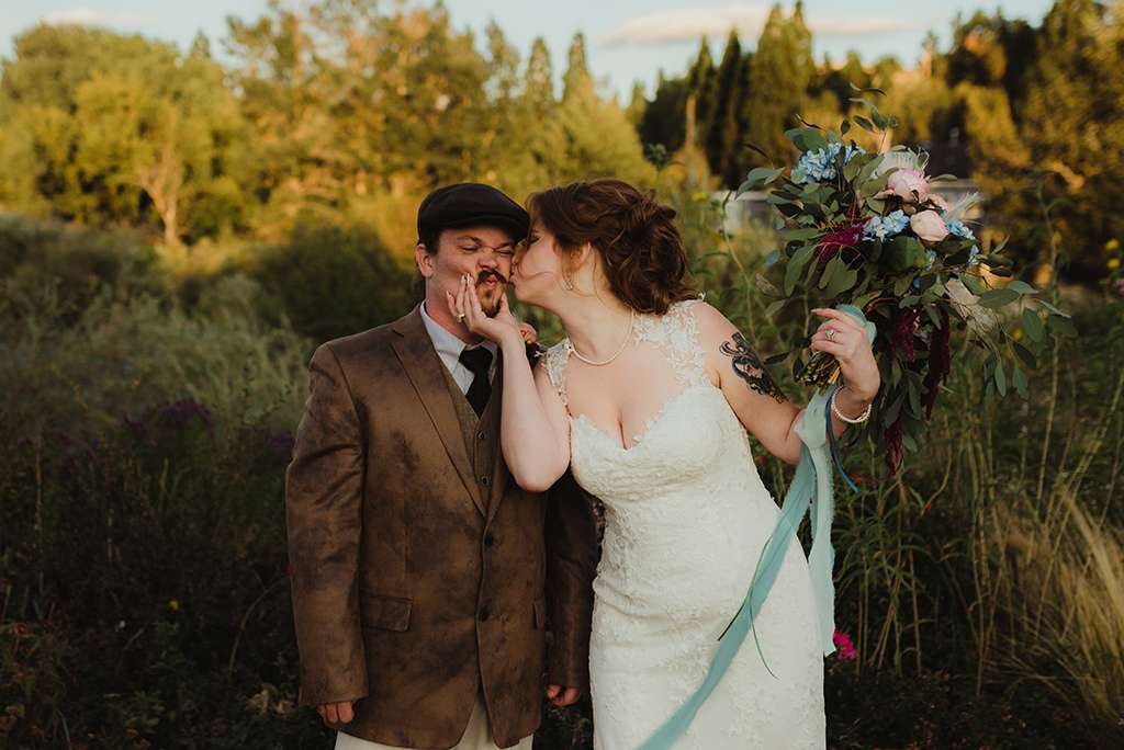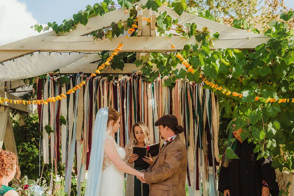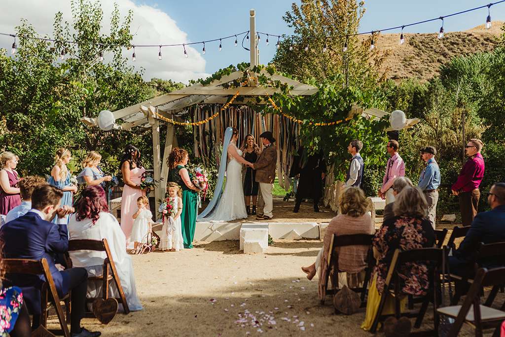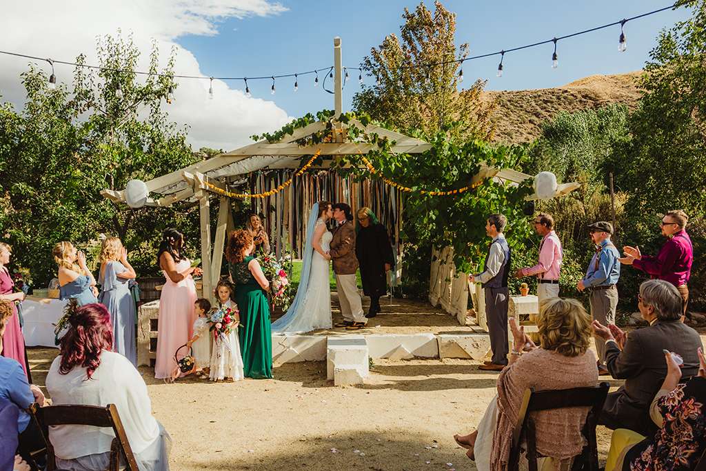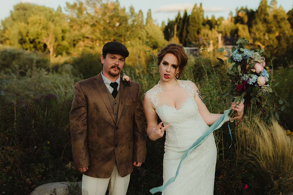 Amber and Ben’s eclectic and romantic September wedding was held at River School Farm in Reno, Nevada – a self-sustaining co-home community that was one of the most magical venues they were able to find. As a studio and tattoo artist, Amber was keen to put her own stamp on their day and also liked the idea of only having decor that could then be used in their new home, or items that could be used a piece of art.