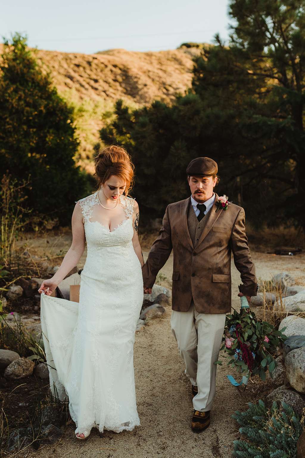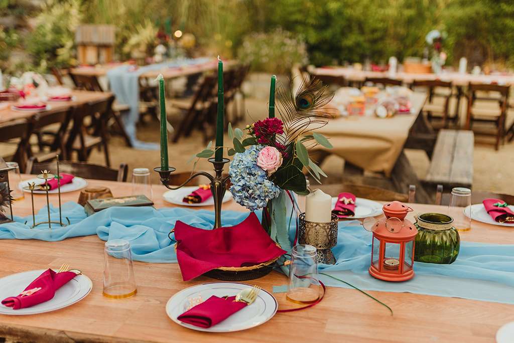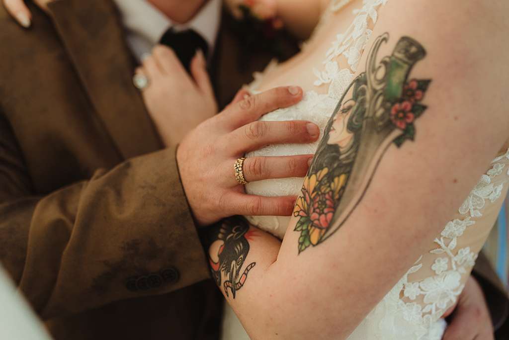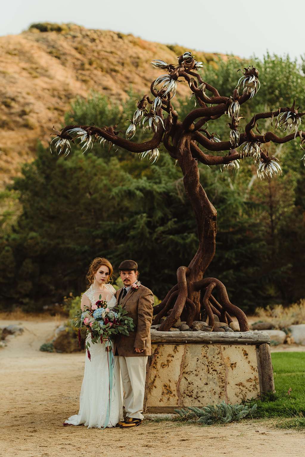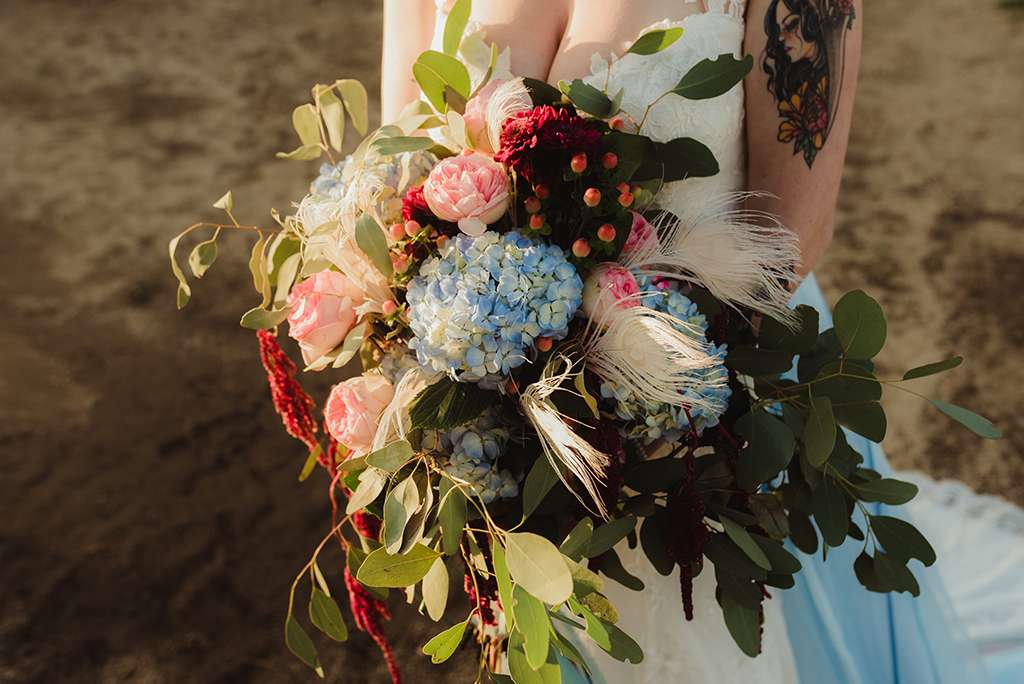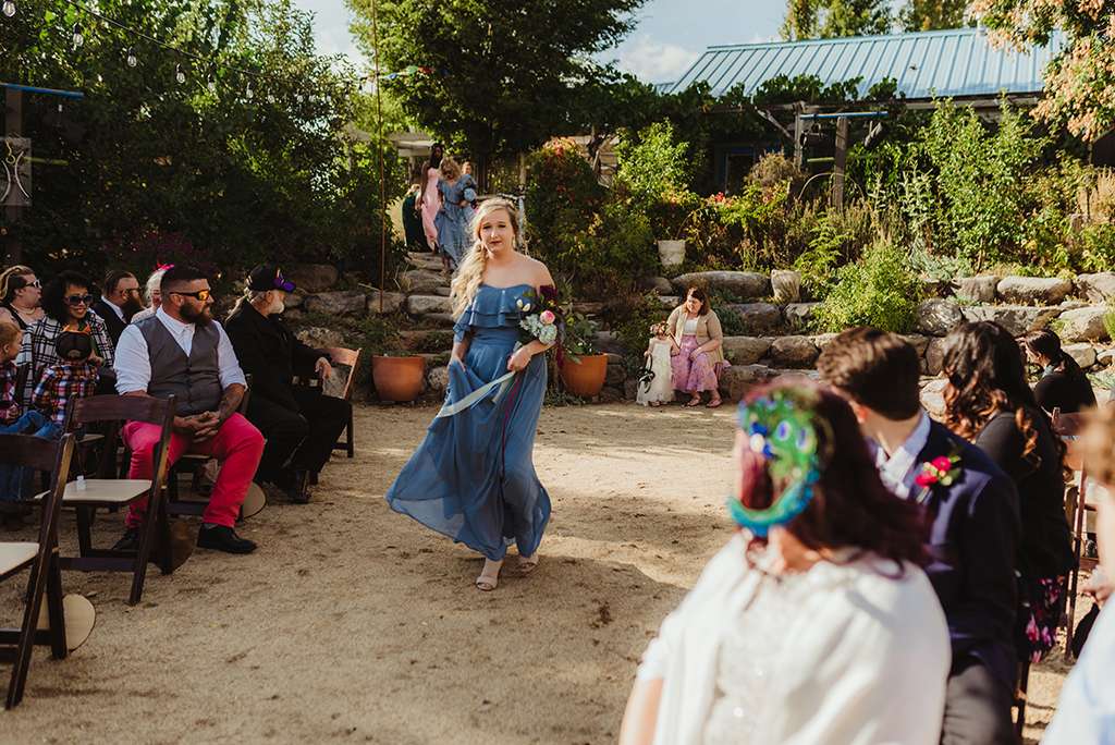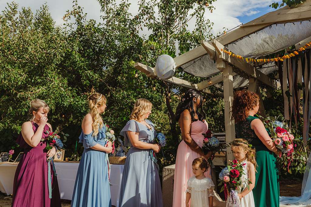 Amber and Ben’s eclectic and romantic September wedding was held at River School Farm in Reno, Nevada – a self-sustaining co-home community that was one of the most magical venues they were able to find. As a studio and tattoo artist, Amber was keen to put her own stamp on their day and also liked the idea of only having decor that could then be used in their new home, or items that could be used a piece of art.