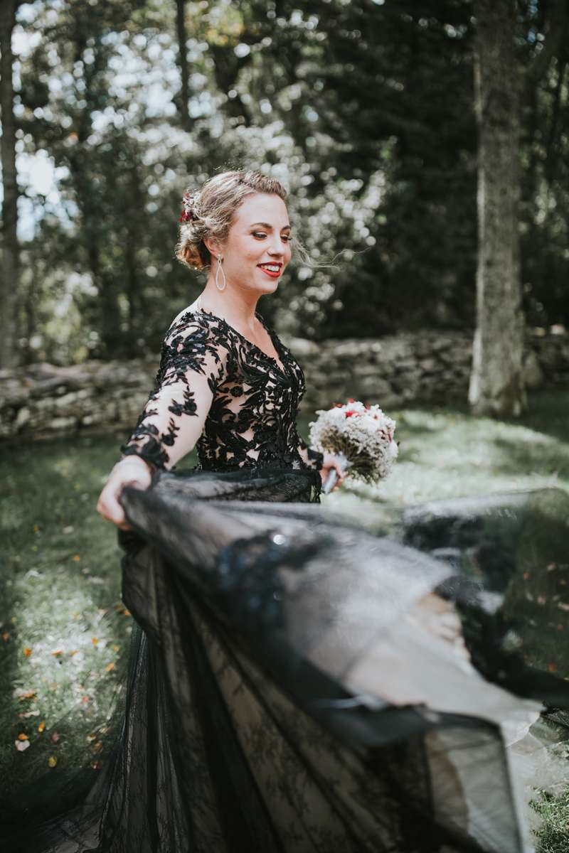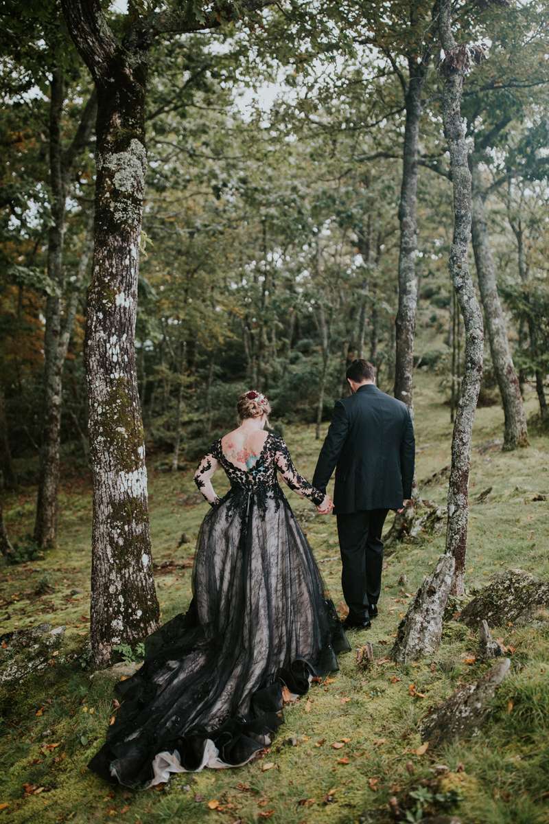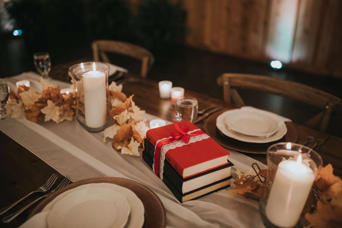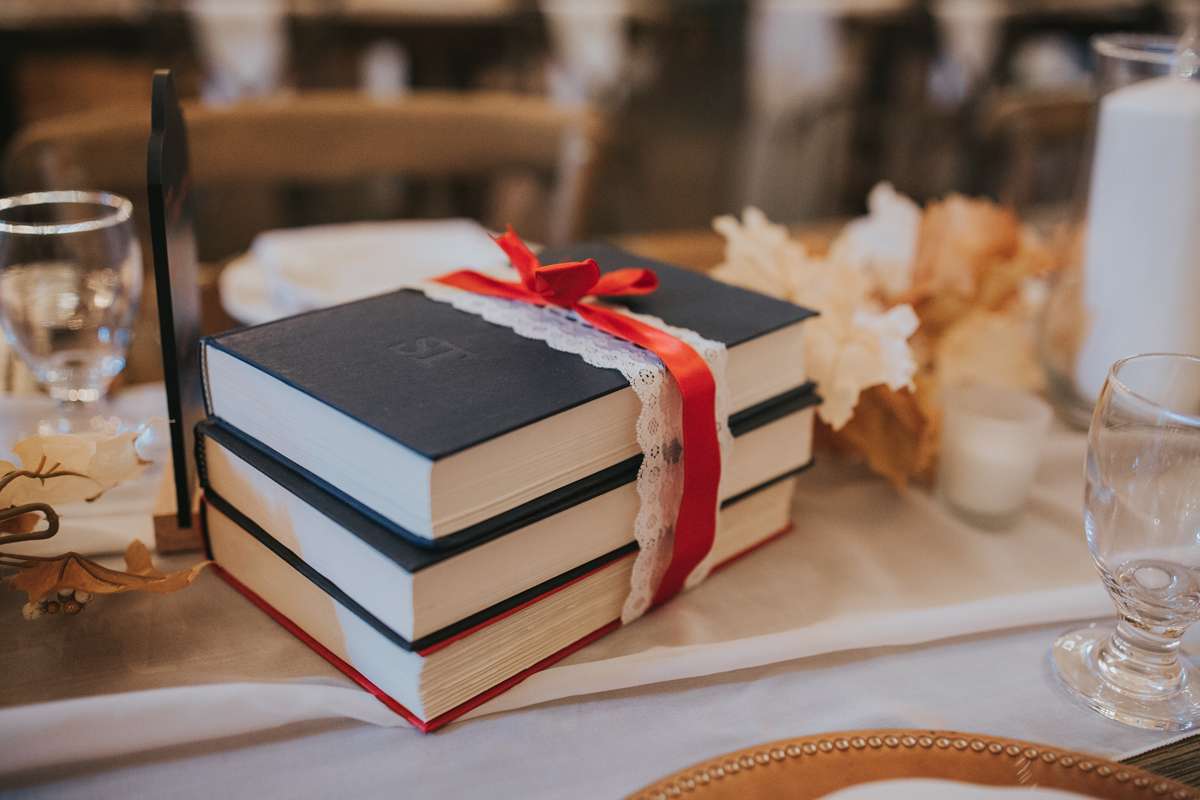 Shannon and Jerry both serve in the US Navy and met through their work. They wanted to keep their September wedding as quintessentially them as possible, even if aspects of the themes didn’t seem like they’d work together on paper. They included nods to their love of reading with the books as centrepieces and in lieu of bridesmaid bouquets, and the gothic/ autumnal element came through in Shannon’s choice of a black dress.