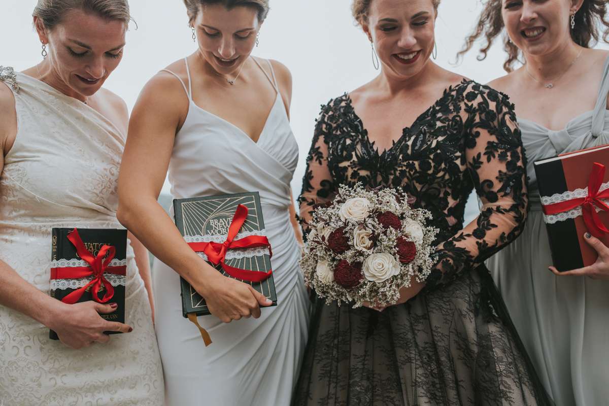 “I had my bridesmaids carry books because flowers die but words live on forever and reading is my favourite thing to do so they all chose books they either wanted me to read or that made them think of me. Their choices were Harry Potter, A Naval Officer’s Guide and A Brave New World.”