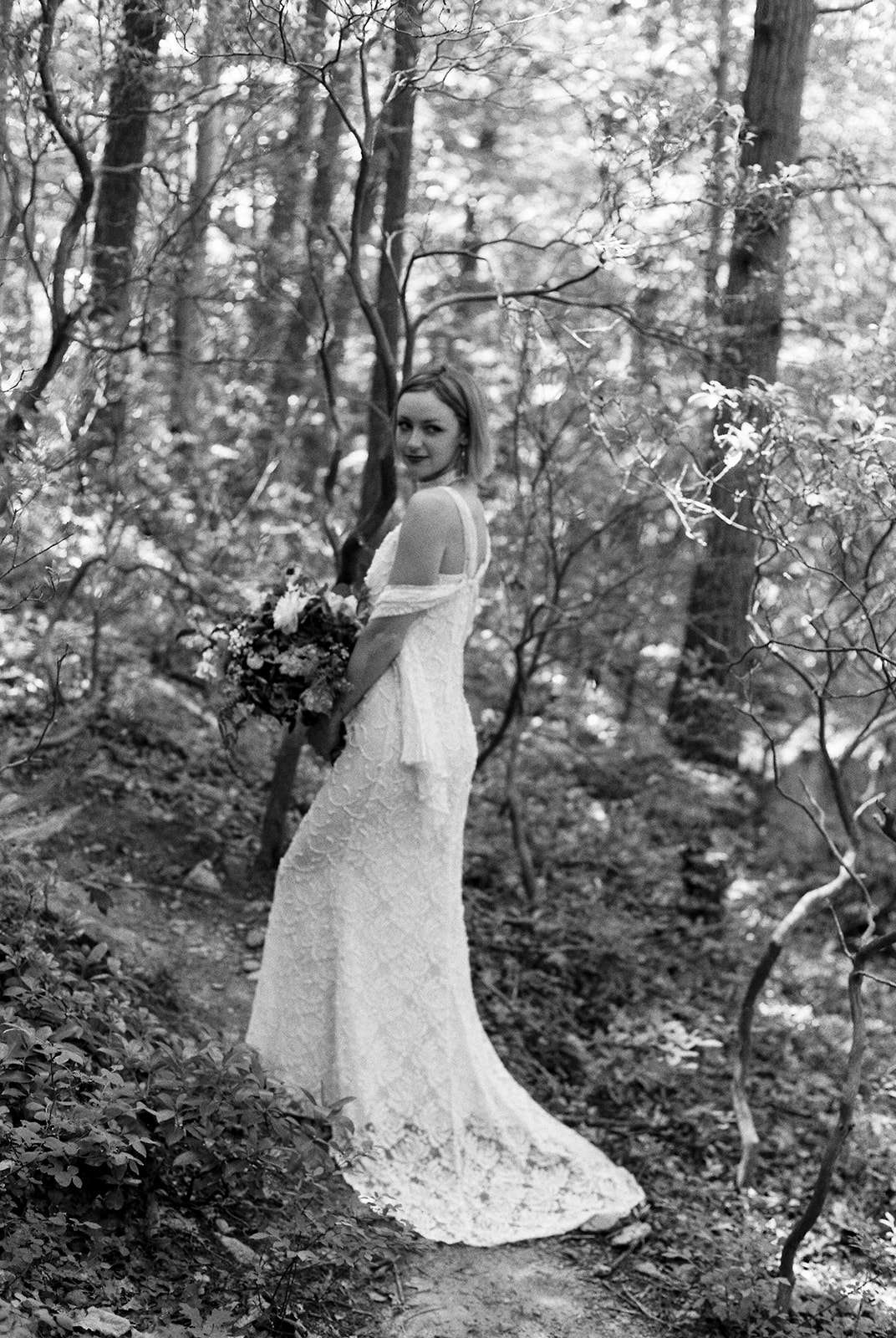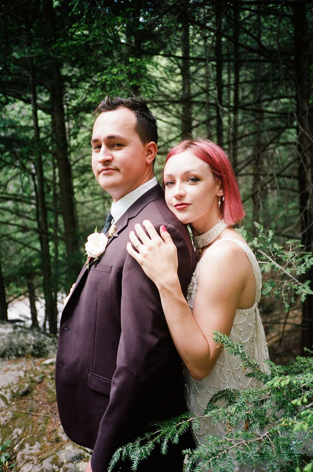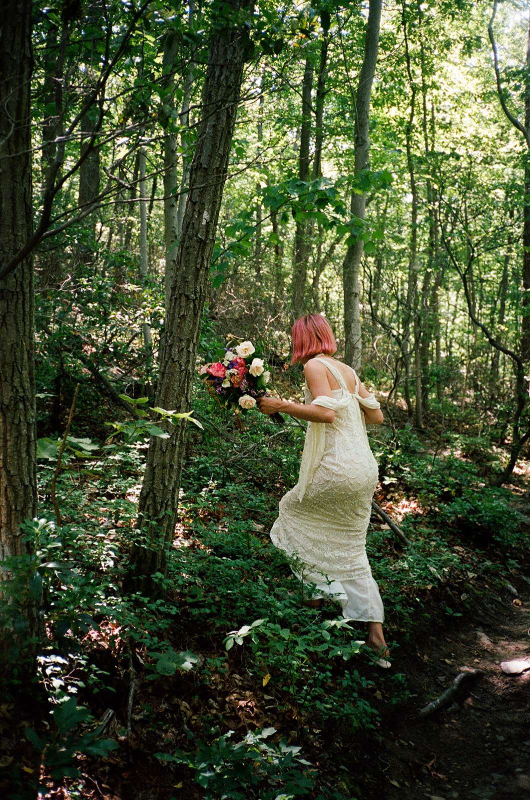 When a wedding photographer gets married, you know the pictures are going to be a big consideration. Peyton, who married Cullen in June, decided she wanted the day primarily shot on film and so they hired Coral Dove Photography to do the honours. They eloped in the woods in Maryland with a $2000 budget. The bride wore vintage dress she found on Facebook marketplace for $75 and carried a bouquet made from flowers from her grandmother’s garden.