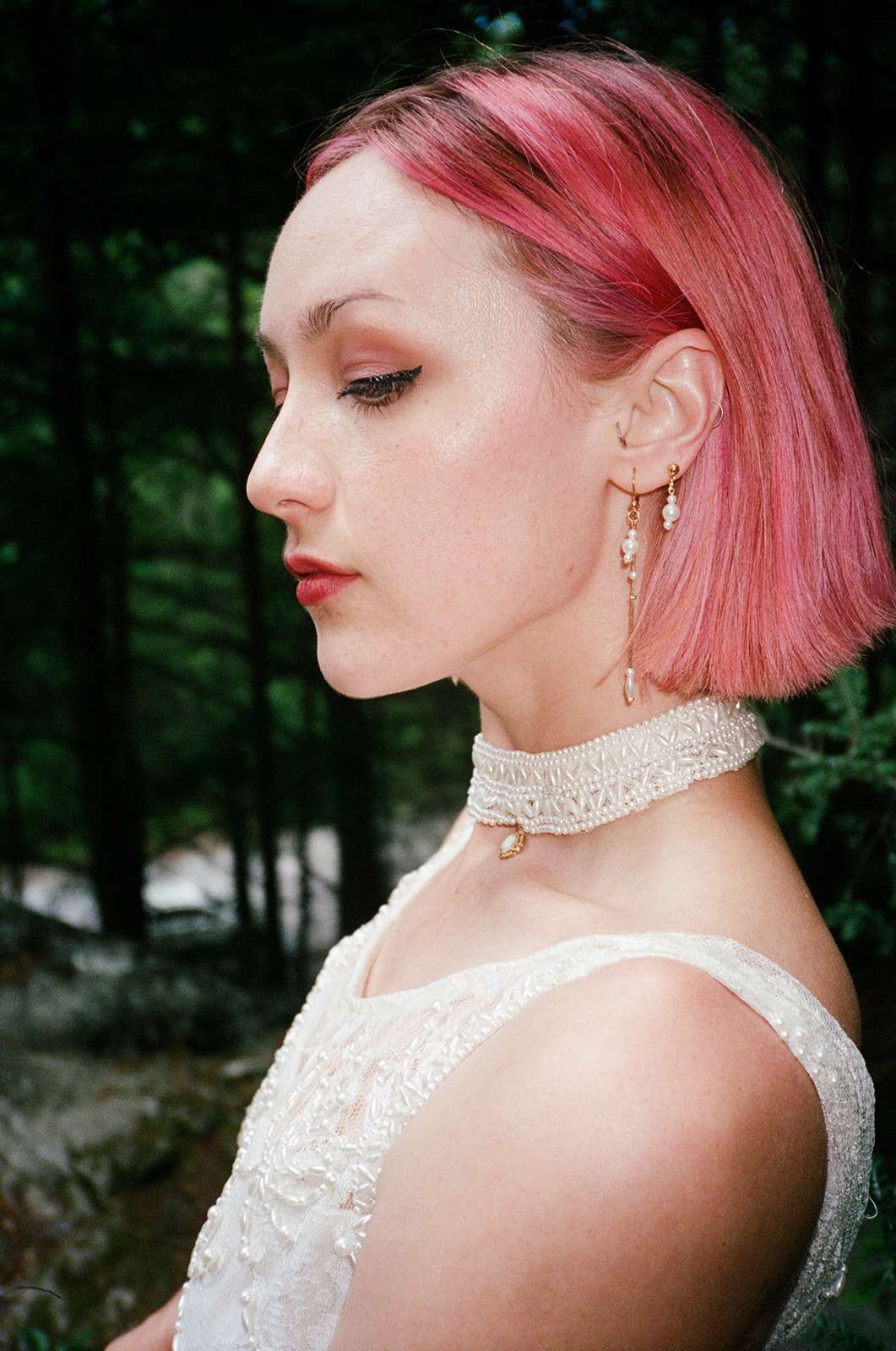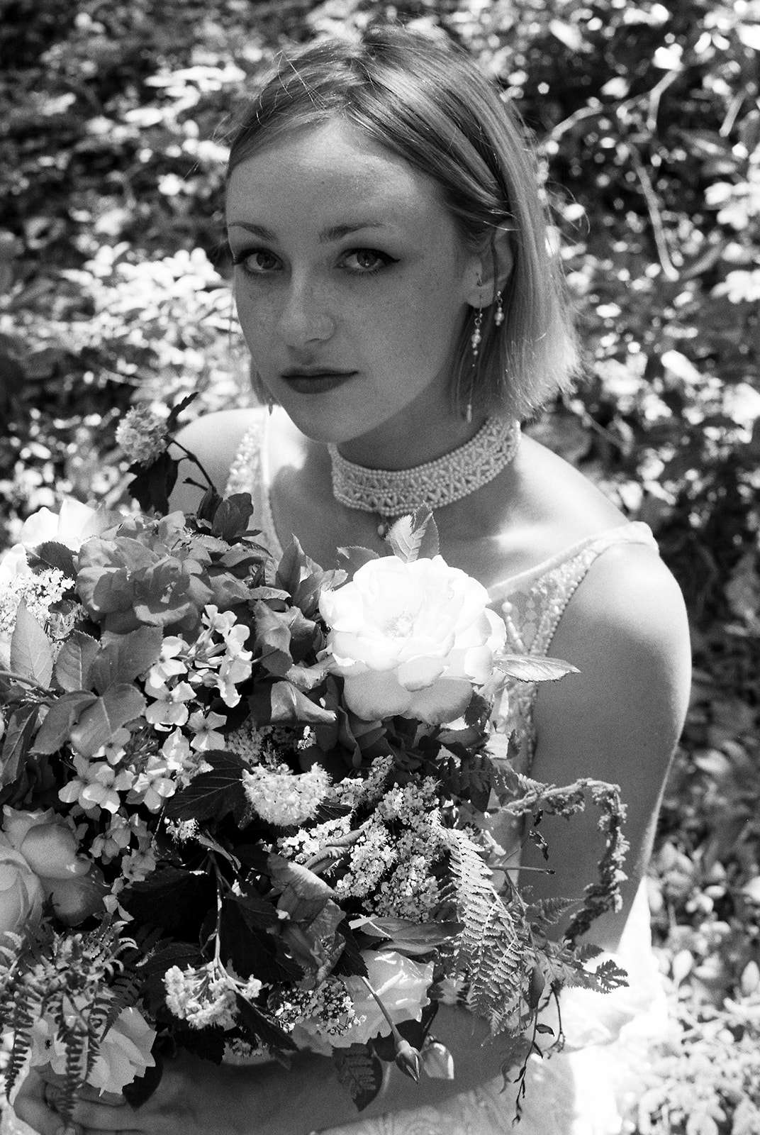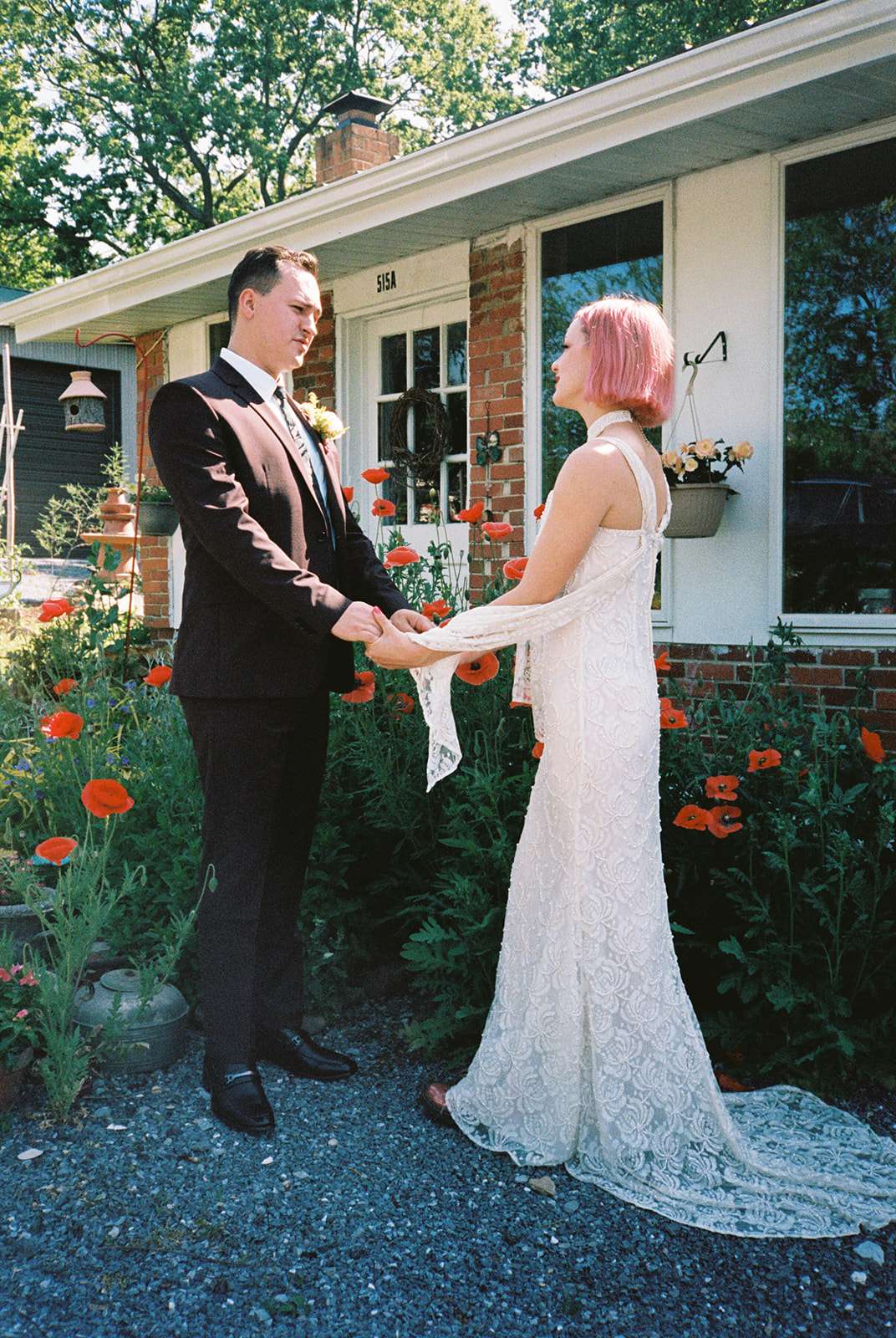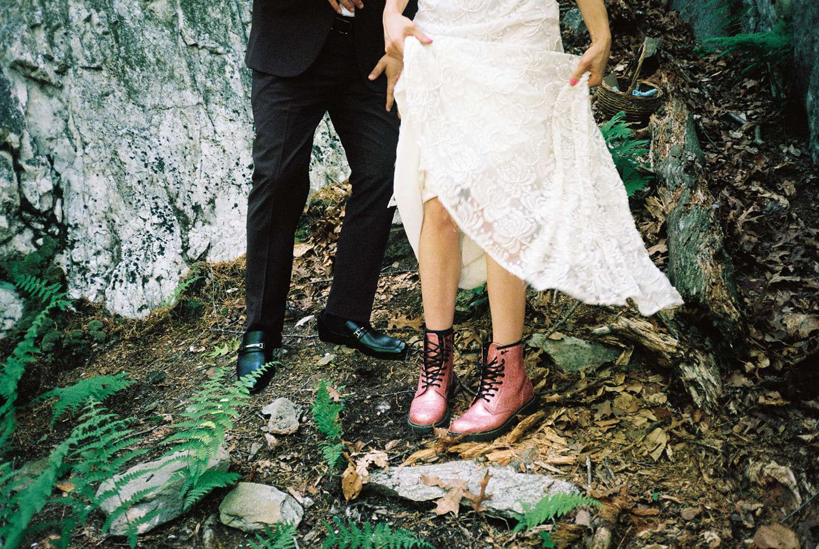 When a wedding photographer gets married, you know the pictures are going to be a big consideration. Peyton, who married Cullen in June, decided she wanted the day primarily shot on film and so they hired Coral Dove Photography to do the honours. They eloped in the woods in Maryland with a $2000 budget. The bride wore vintage dress she found on Facebook marketplace for $75 and carried a bouquet made from flowers from her grandmother’s garden.