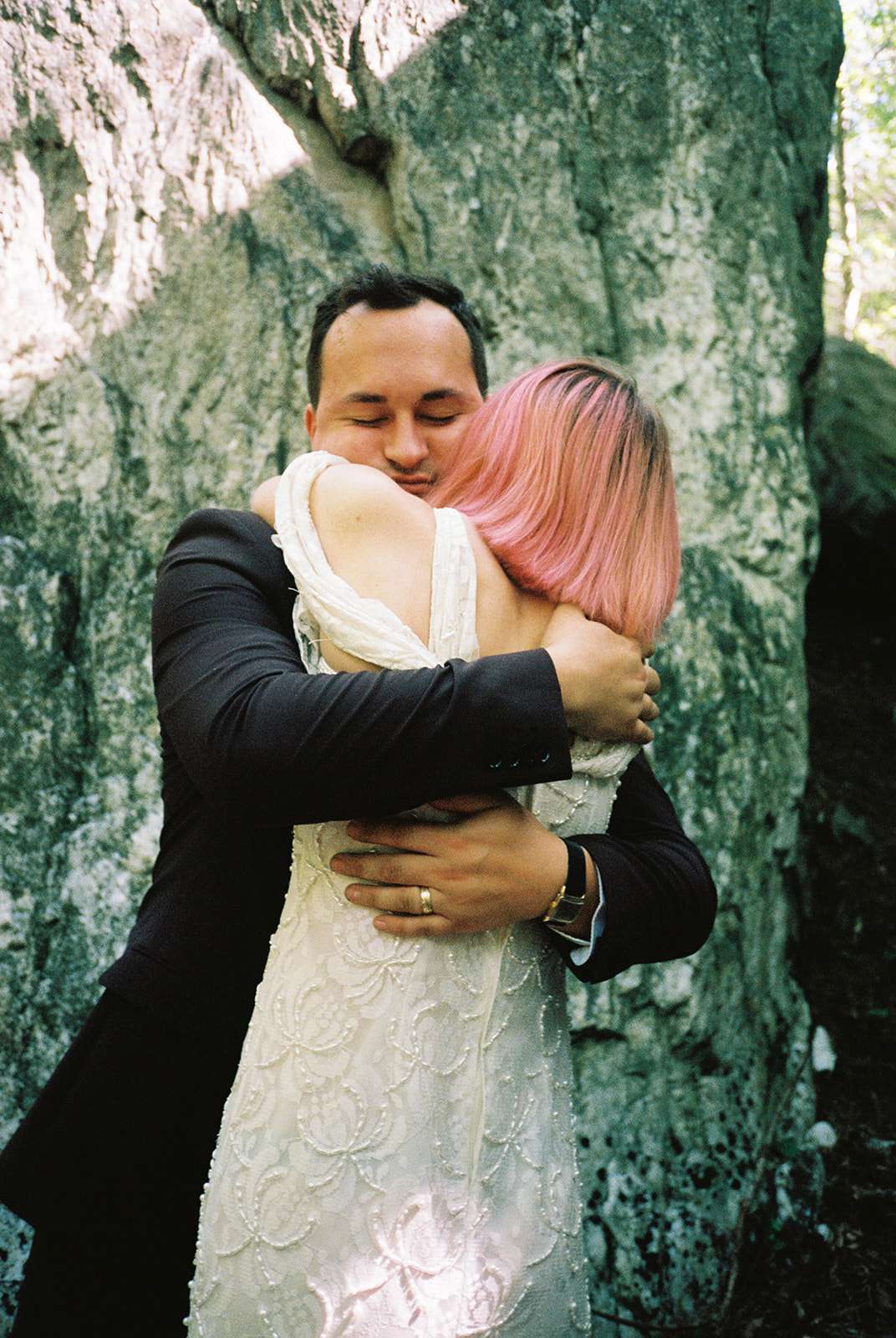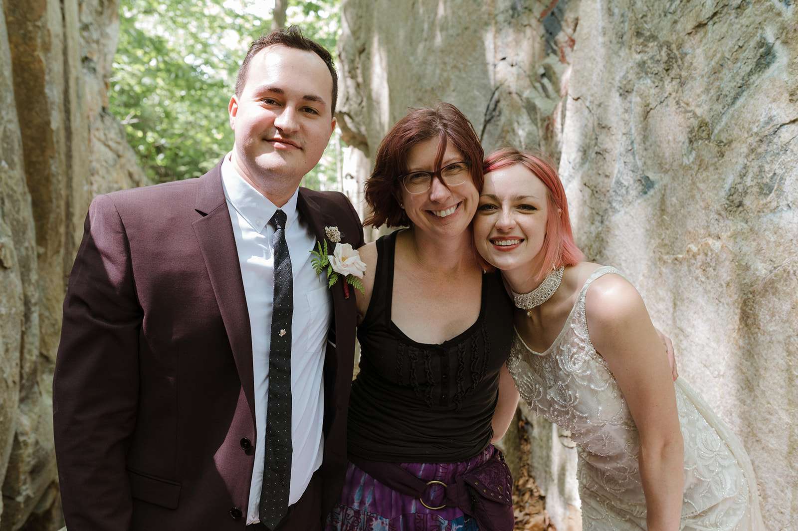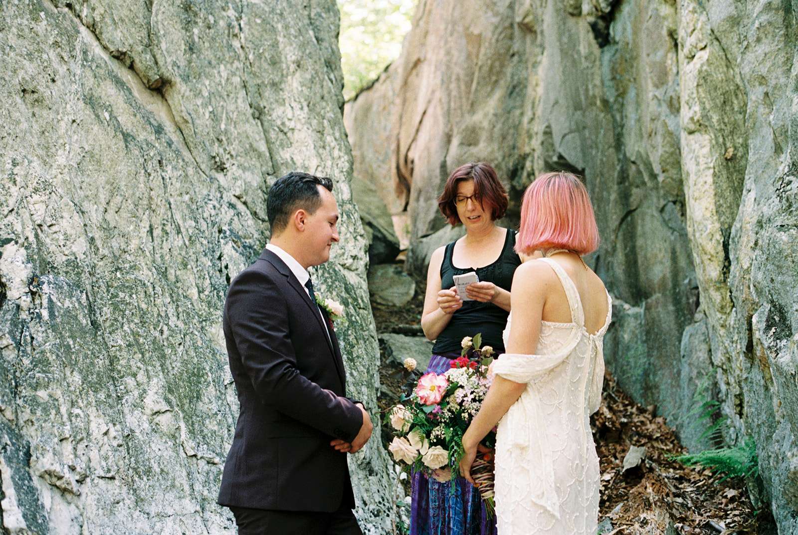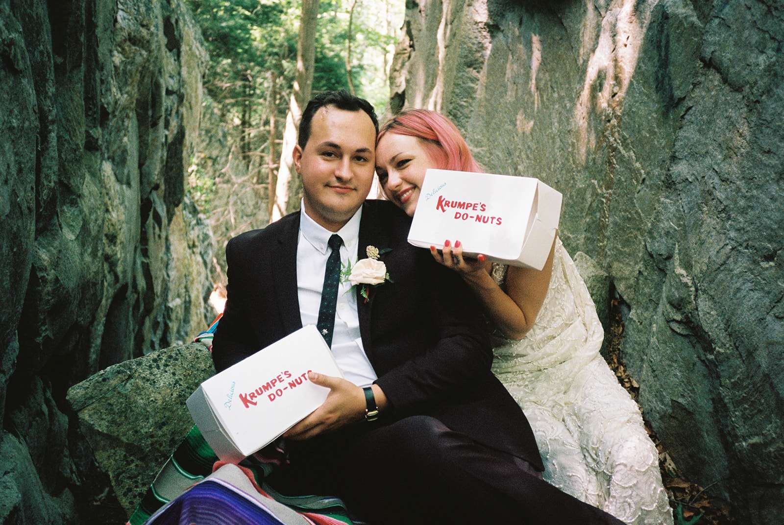 The day began with them getting ready together at home, they then drove to the mountains for their tiny elopement. They all hiked to a spot they picked out between two giant stones and had a hand fasting. They put together a terrarium using dirt from the ground to remember their ceremony followed by donuts and photos.