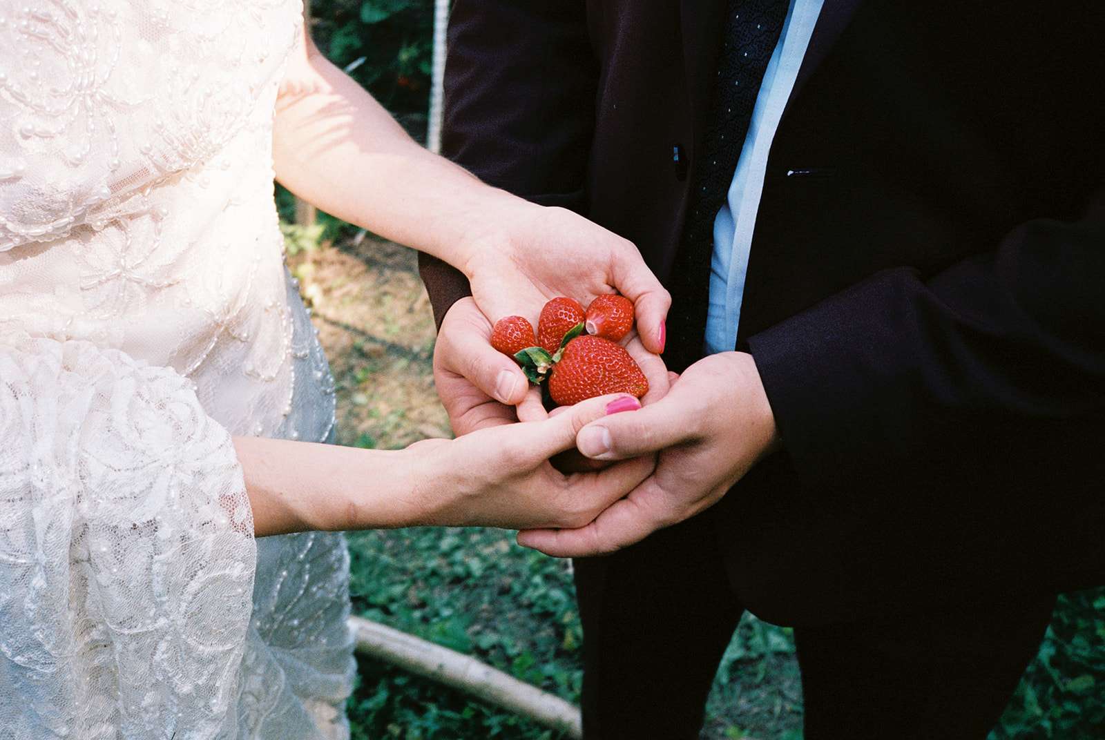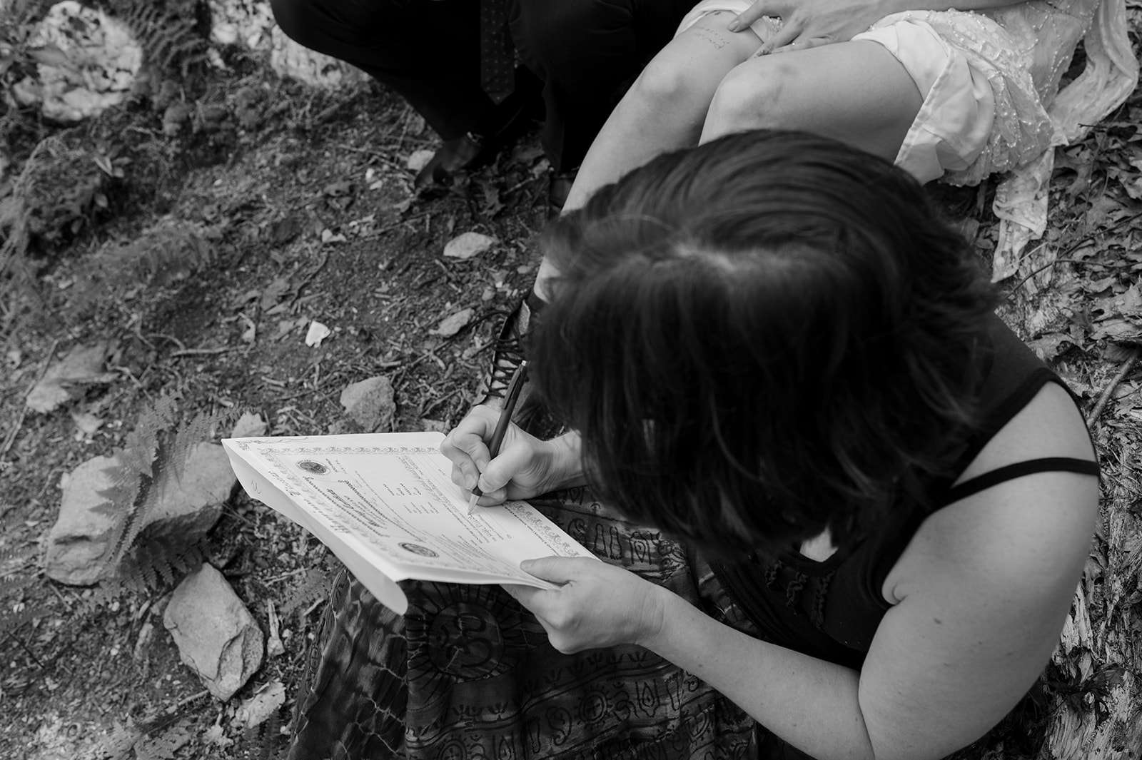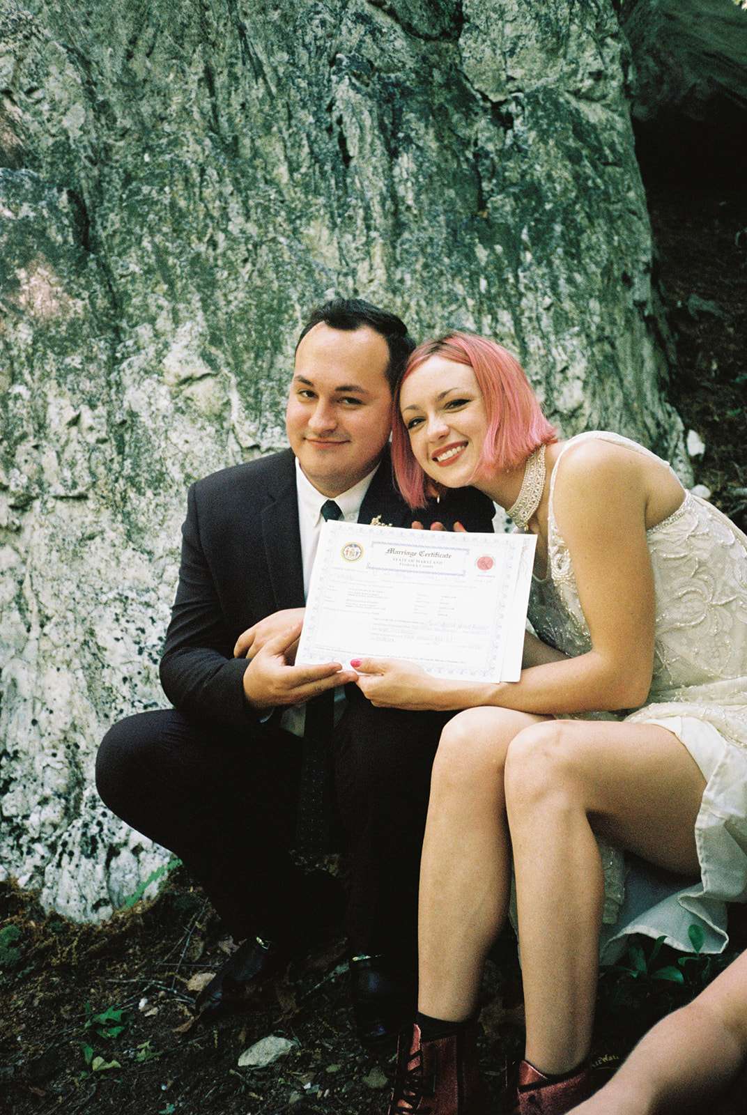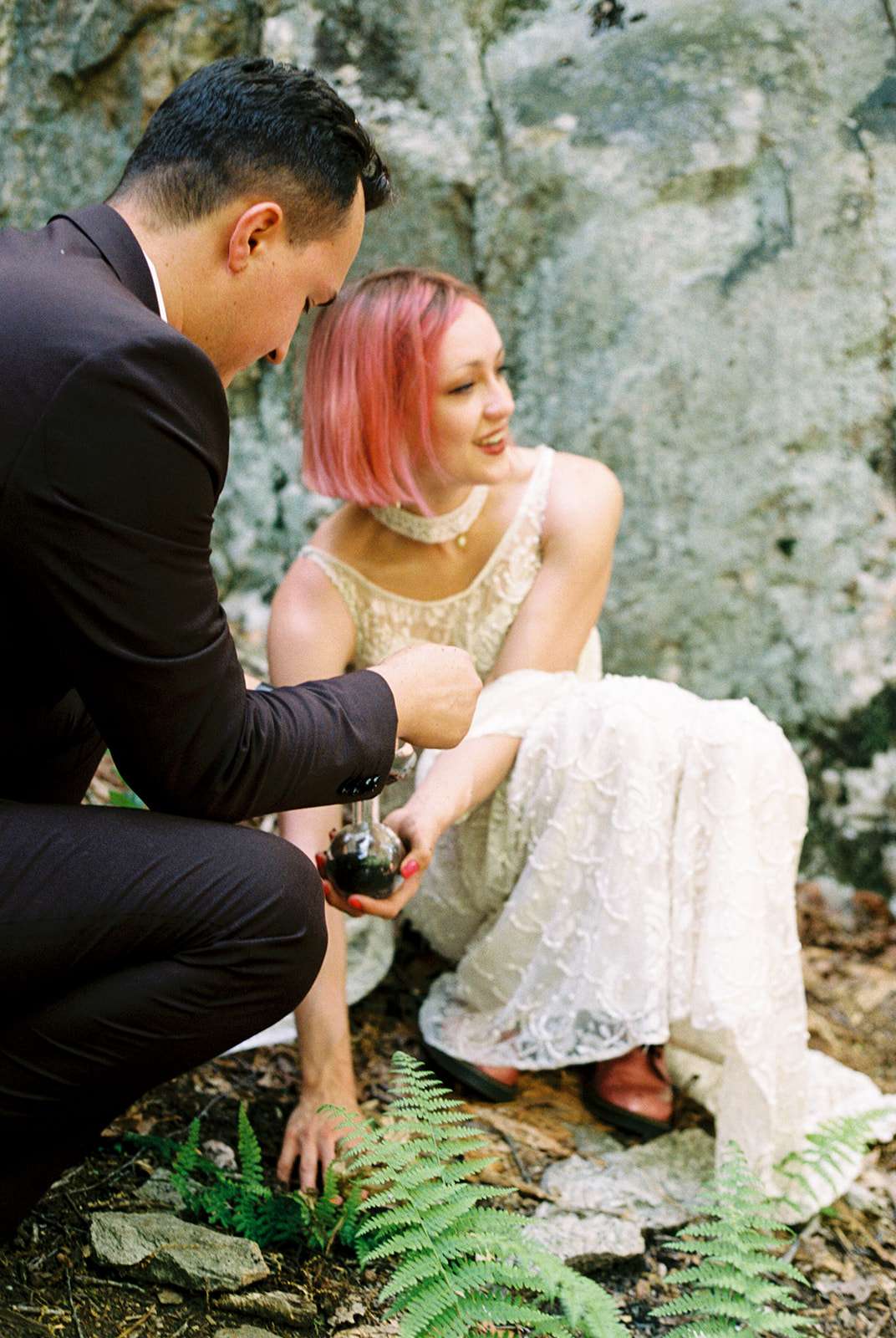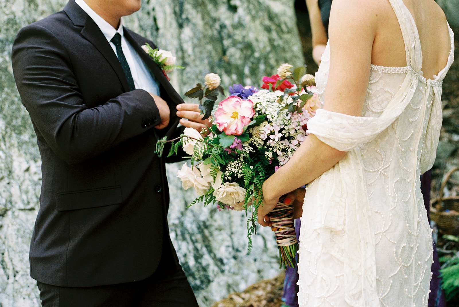 The day began with them getting ready together at home, they then drove to the mountains for their tiny elopement. They all hiked to a spot they picked out between two giant stones and had a hand fasting. They put together a terrarium using dirt from the ground to remember their ceremony followed by donuts and photos.