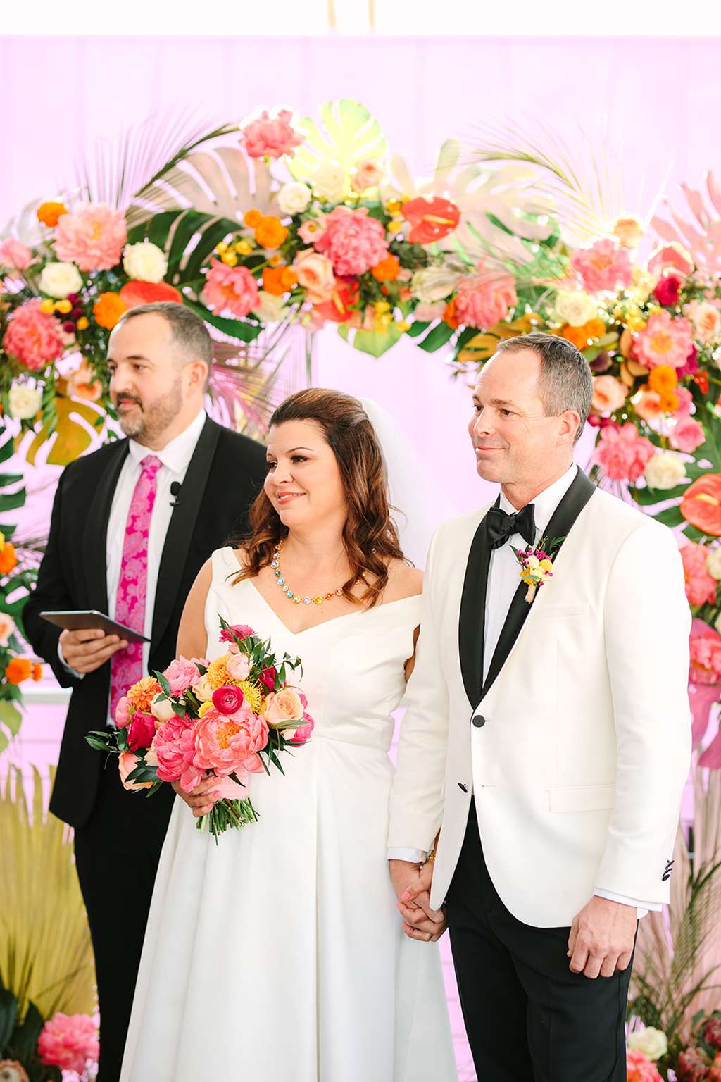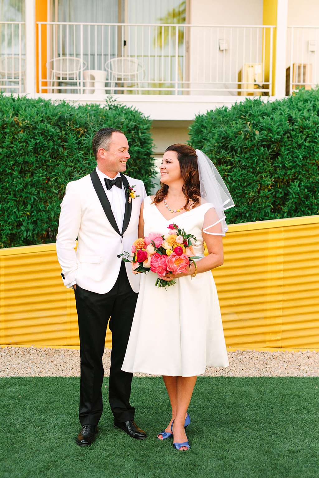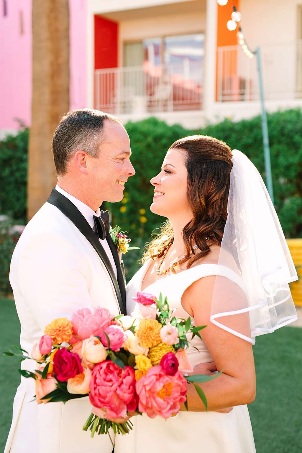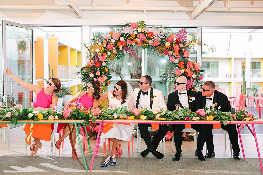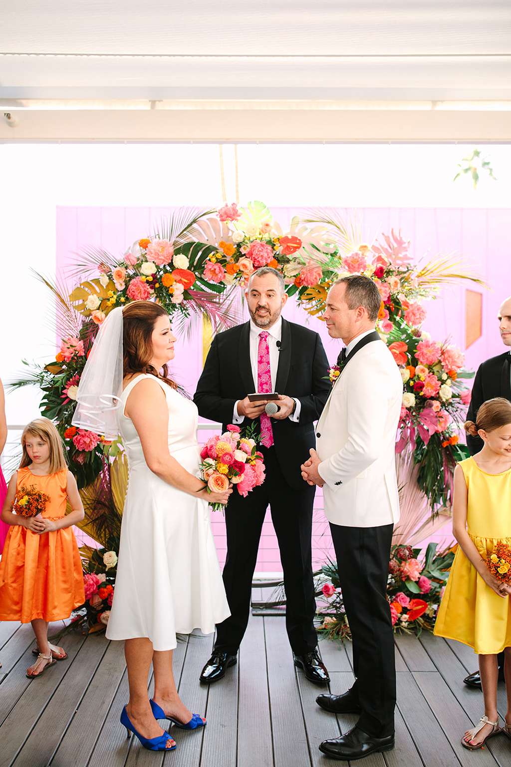 The couple went over budget on their florals, but felt they were worth every penny – and we agree! Joy of Bloom Florals brought all of the colour and all of the fun with their bouquets and arrangements. Aside from sunglasses as name cards for reception place names they were the only decor the couple pulled in – they let the ubiquitous decor at The Saguaro Hotel do the talking!