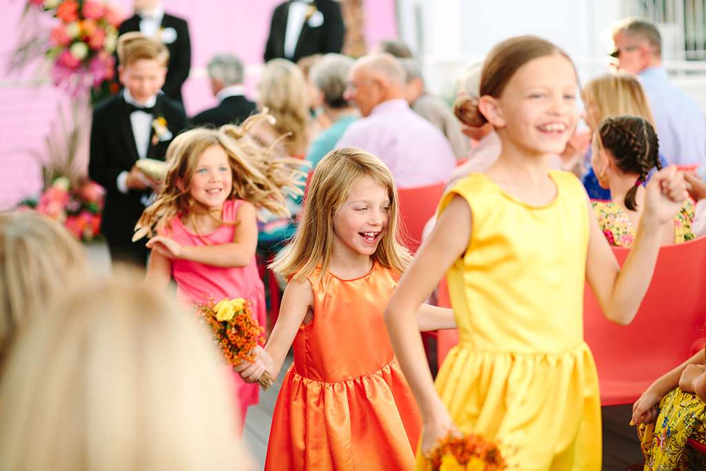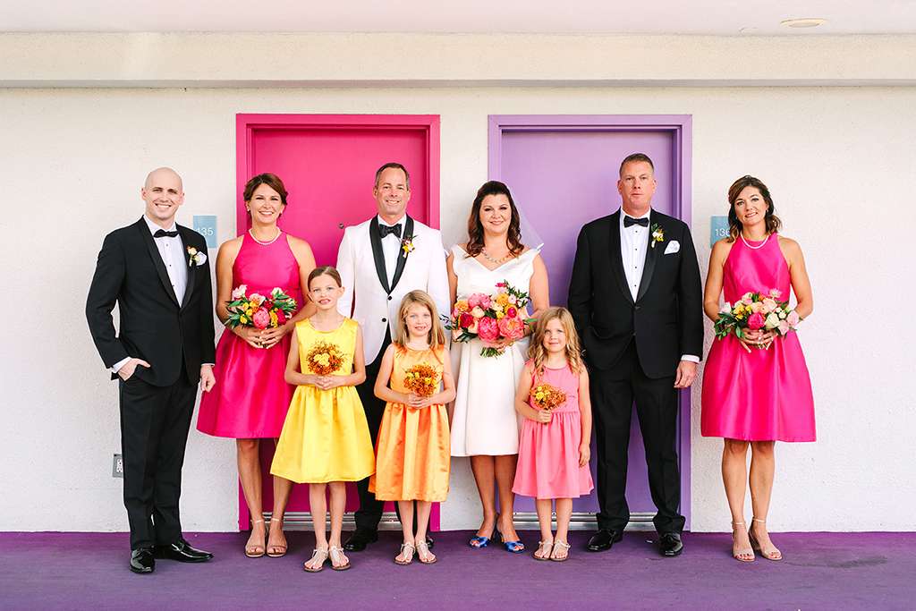 Mike paired a Hugo Boss tux with Ted Baker shirt and propellor cufflinks to celebrate his love of boating. The bridesmaids and flower girls wore Alfred Sung cocktail dresses in a tutti frutti array.