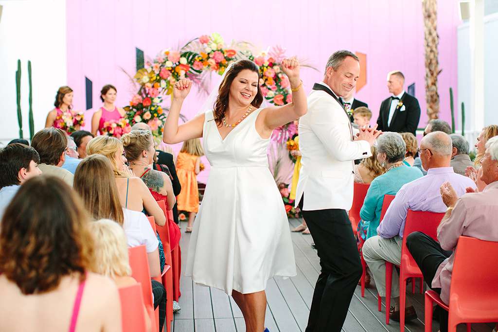 “Our officiant was a friend who has known us since before we got together. We didn’t give him much guidance and he did an amazing job planning the ceremony and keeping the mood just right. When all was said and done, and it was time to get to the party, Mike and I danced down the aisle to You Make Me Feel Like Dancing, and had our wedding party grab their spouses and dance down themselves.”