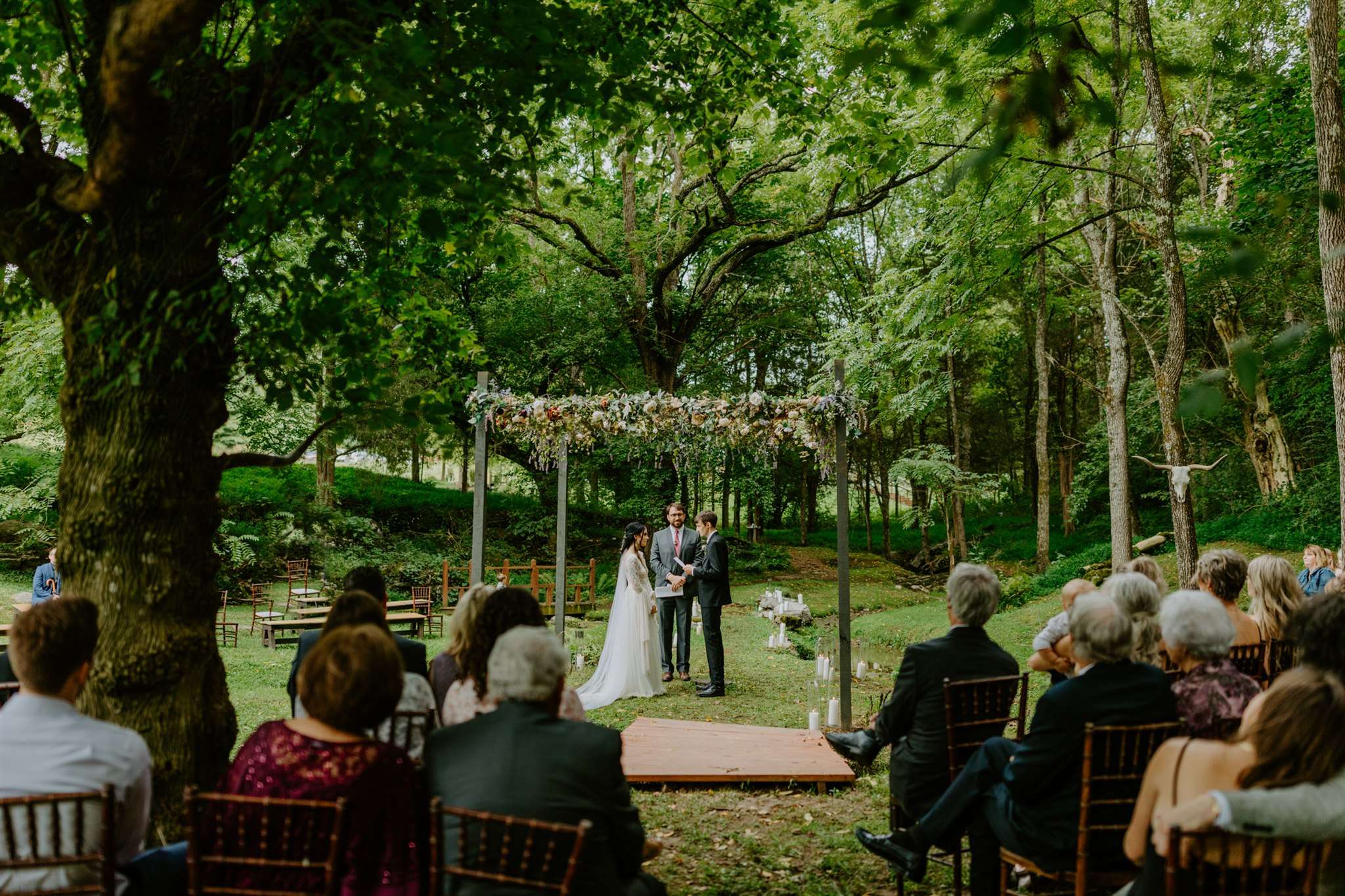 After a first look (their favourite moment of the day), their ceremony was held in the woods by a creek. The creek’s flow formed an island with a natural aisle leading to the spot where they were married. “When my parents bought the property in 2015, I knew that that spot was where I wanted to get married”, Sarah-Jane continued. “To save space on the island, our bridal party crossed a small bridge and then sat on the front row once they had walked down. We used minimal decoration for the ceremony, which included a floral arbour and various skulls hung on trees and let the natural beauty of the area be our focal point.”