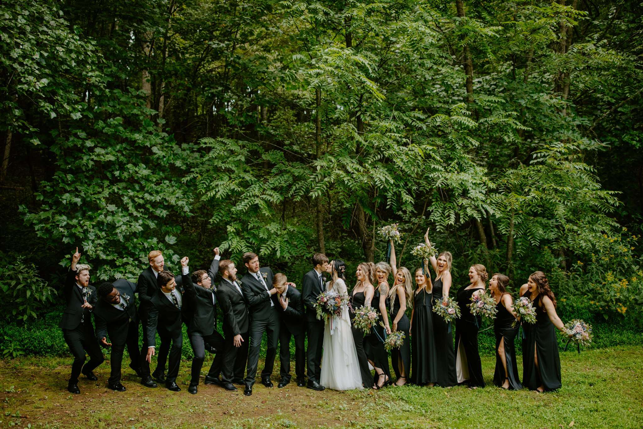 Sarah-Jane’s bohemian inspired wedding dress was by Anna Kara which she added flowing sleeves too. She wore it with bird skull pins and a hair vine, both from Etsy. One of the hardest decisions they had to make was actually what the bridesmaids and groomsmen would wear! “It took us months! It seems so simple, but that was probably the hardest decision in the whole planning process. It’s so hard to find something that everyone feels comfortable and beautiful in while still following the vision of the wedding.” In the end they lucked out with a mixture of ASOS and Windsor dresses for the girls, and H&M suits for the guys.