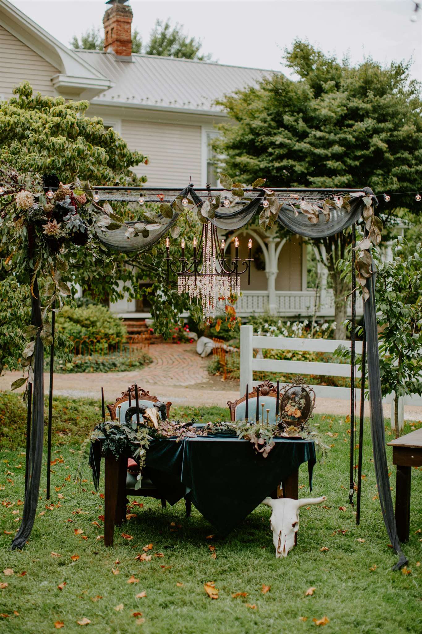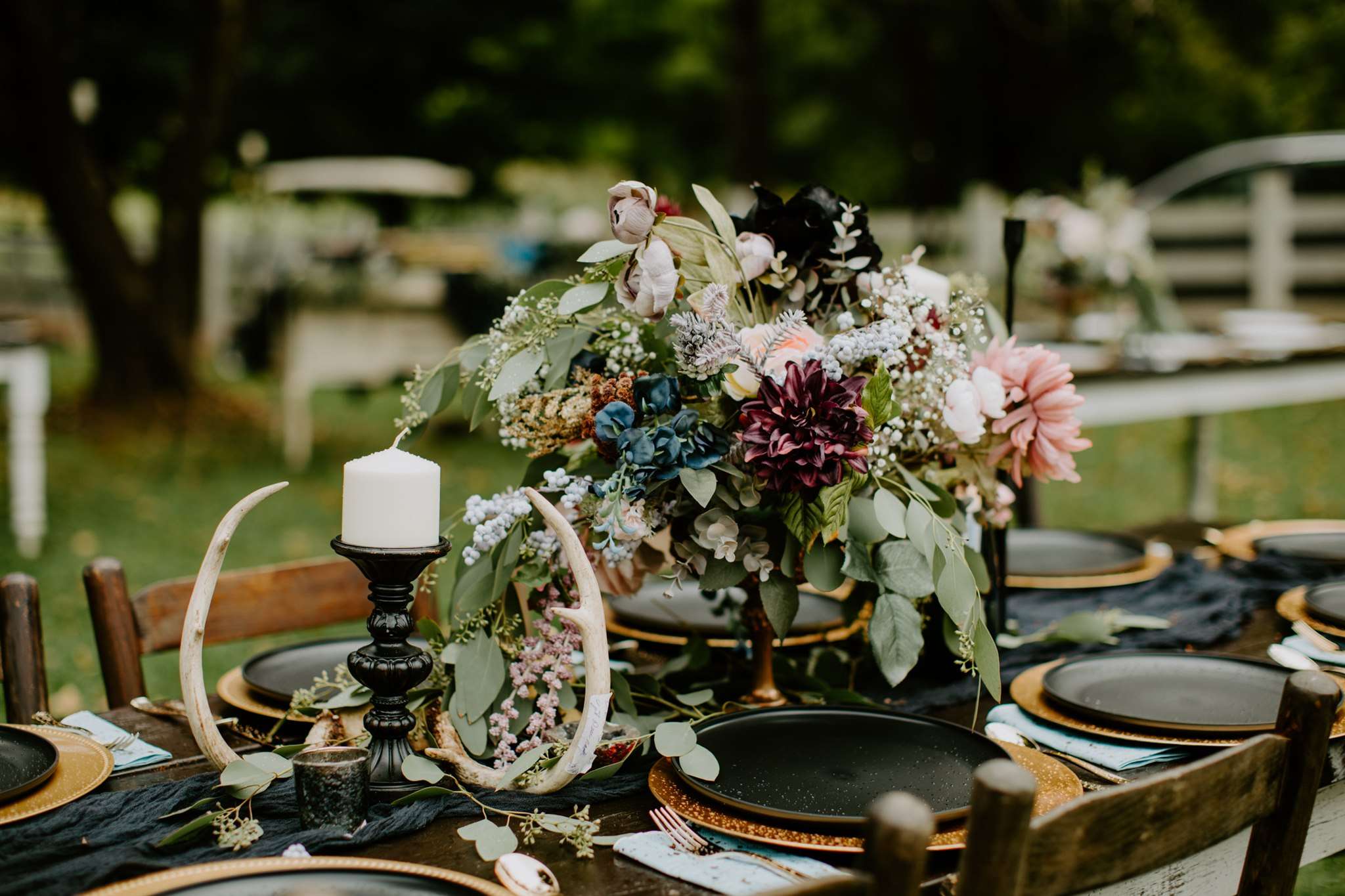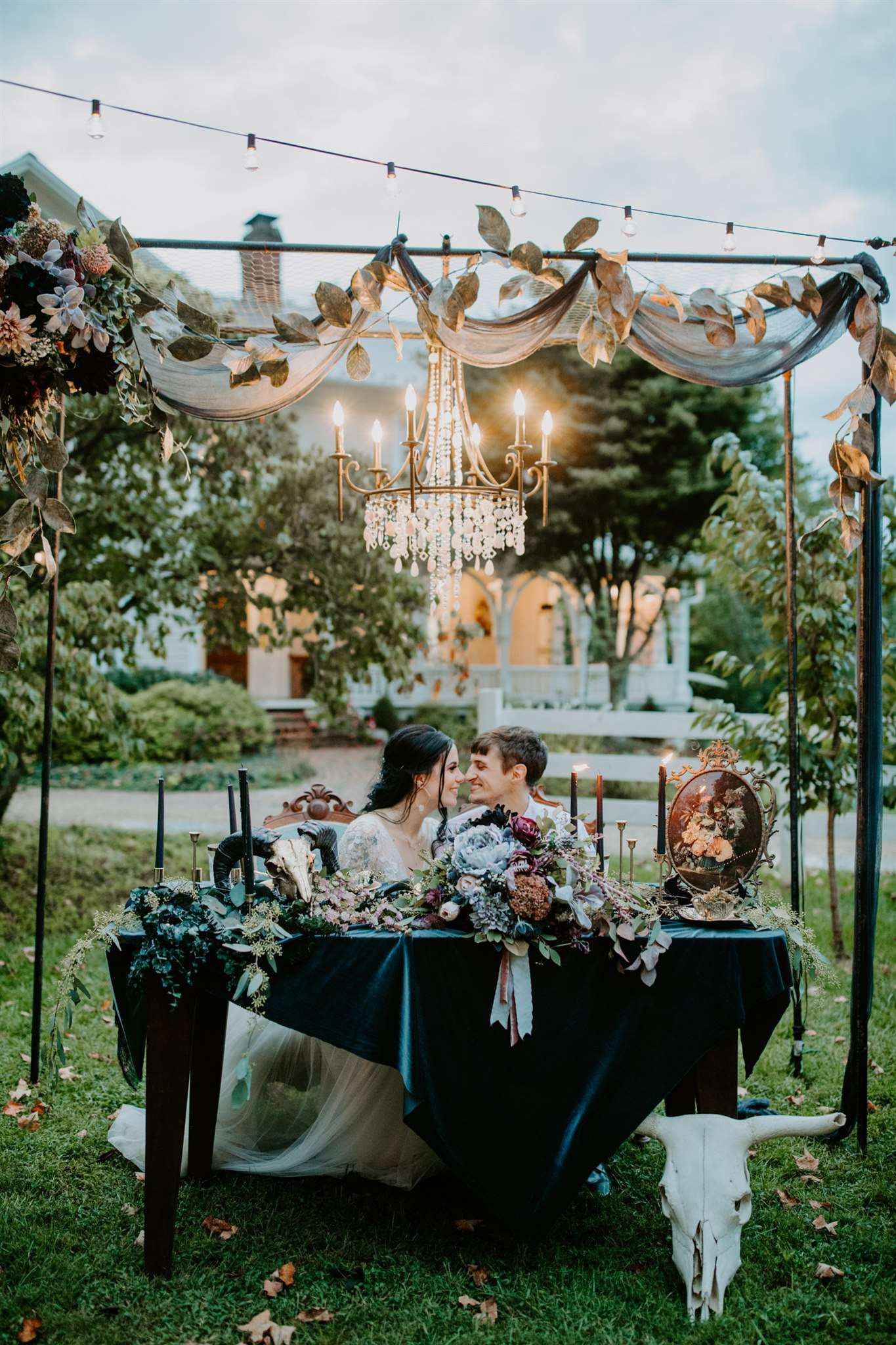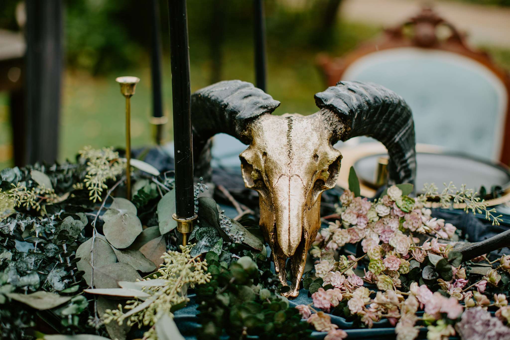 The décor they chose had a gothic boho vibe, two distinct themes that shouldn’t really work together but they totally do. Black plates, animal skulls and black candle sticks sat perfectly with flowing muted coloured floral displays, rustic wooden tables and gold silverware.