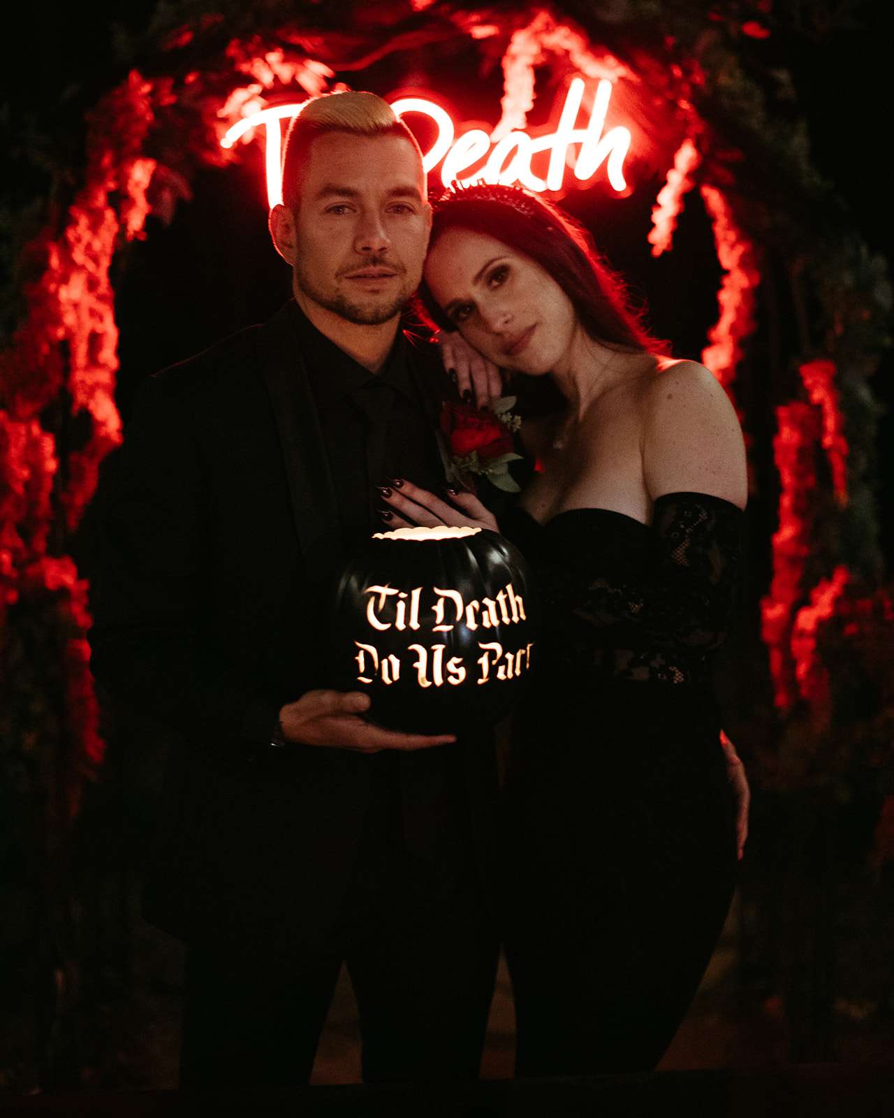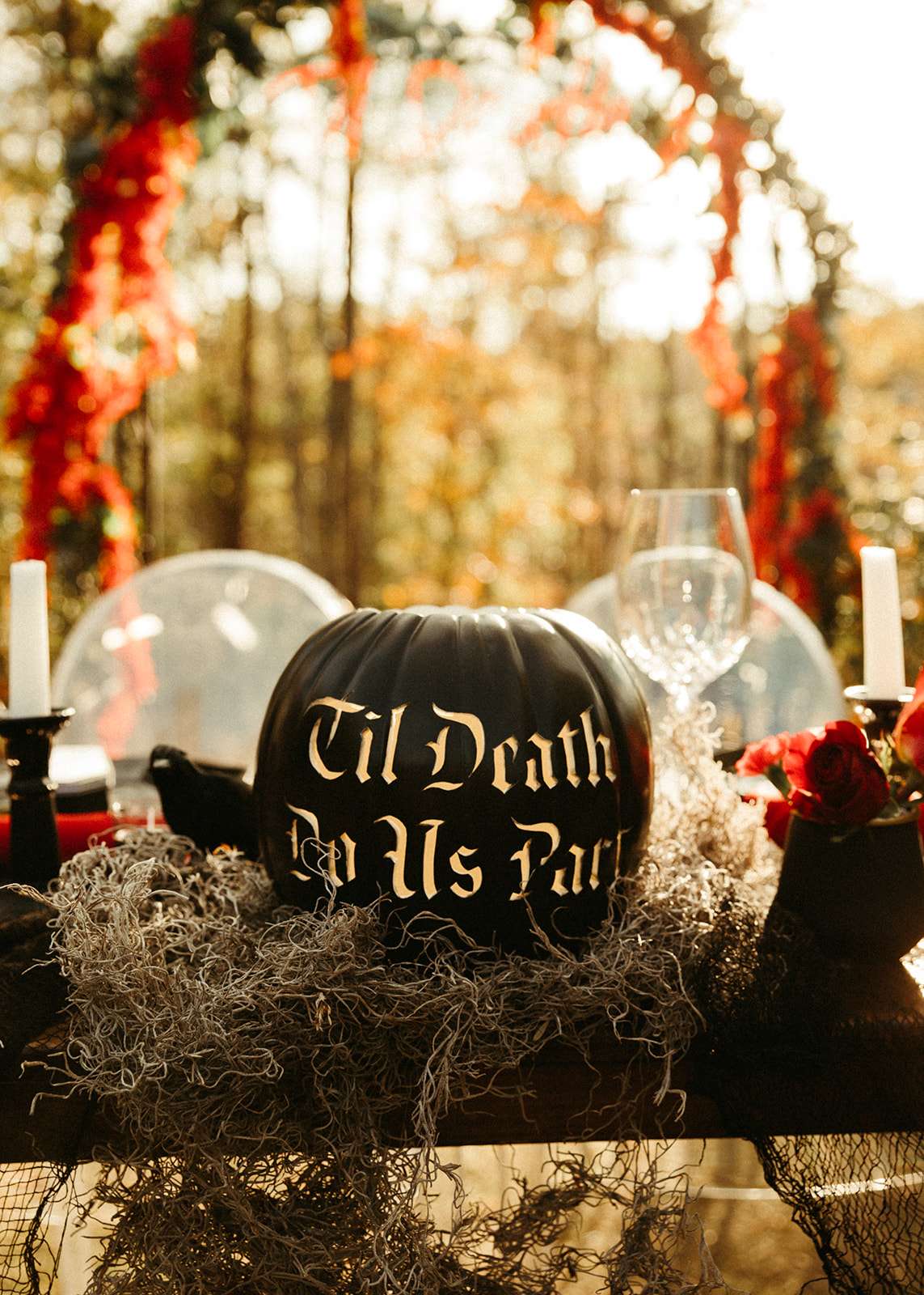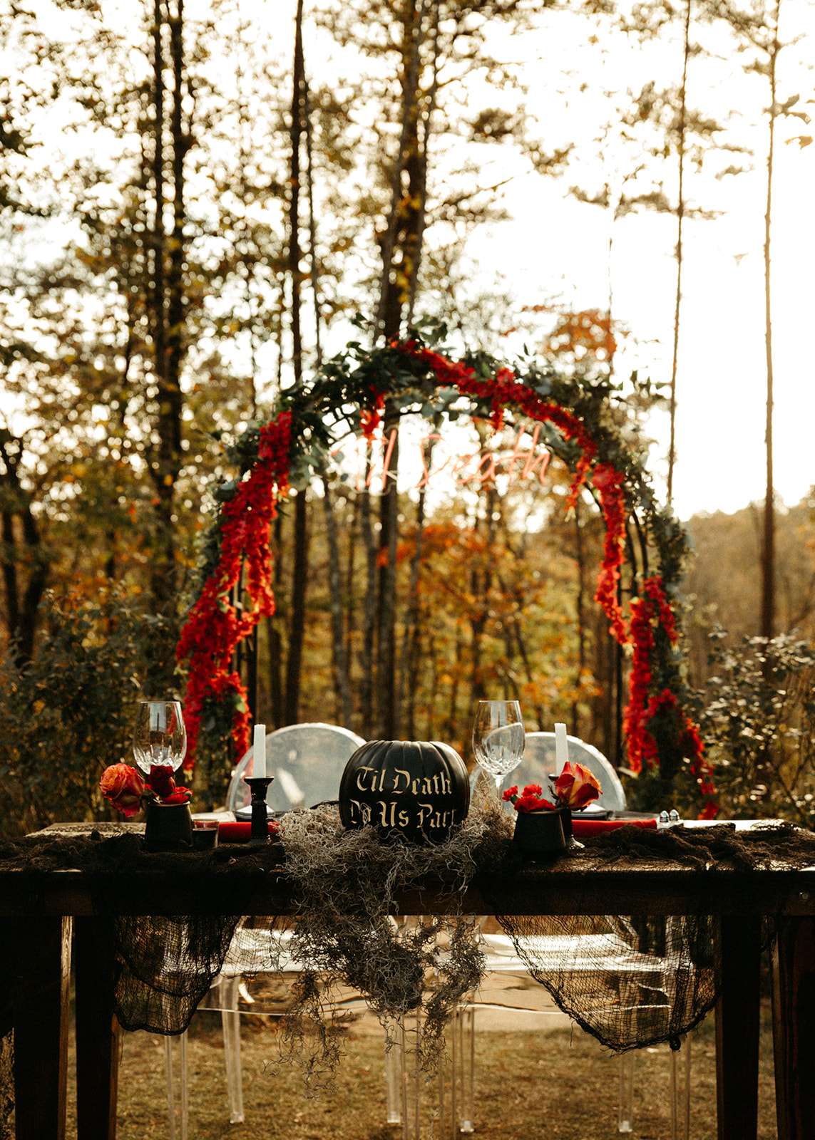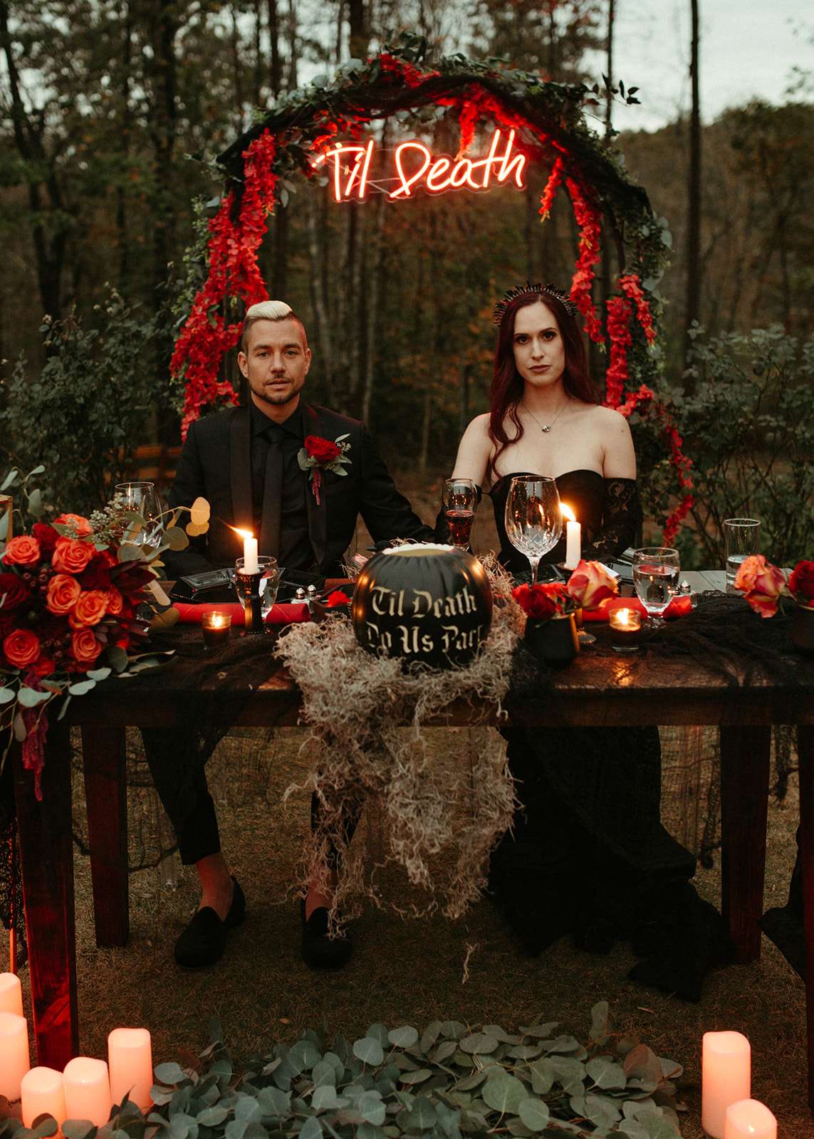 They went all out on the theme with décor such as a ‘Til l Death neon sign, custom coffin menu cards, black tree centrepieces with ravens, blood shots in vials (vodka and cranberry/grenadine), black chandeliers with real candles, a ceremony floor covered in eucalyptus and black cake pops with red velvet cake inside. For their rings they had a custom made a coffin with their wedding date on it.