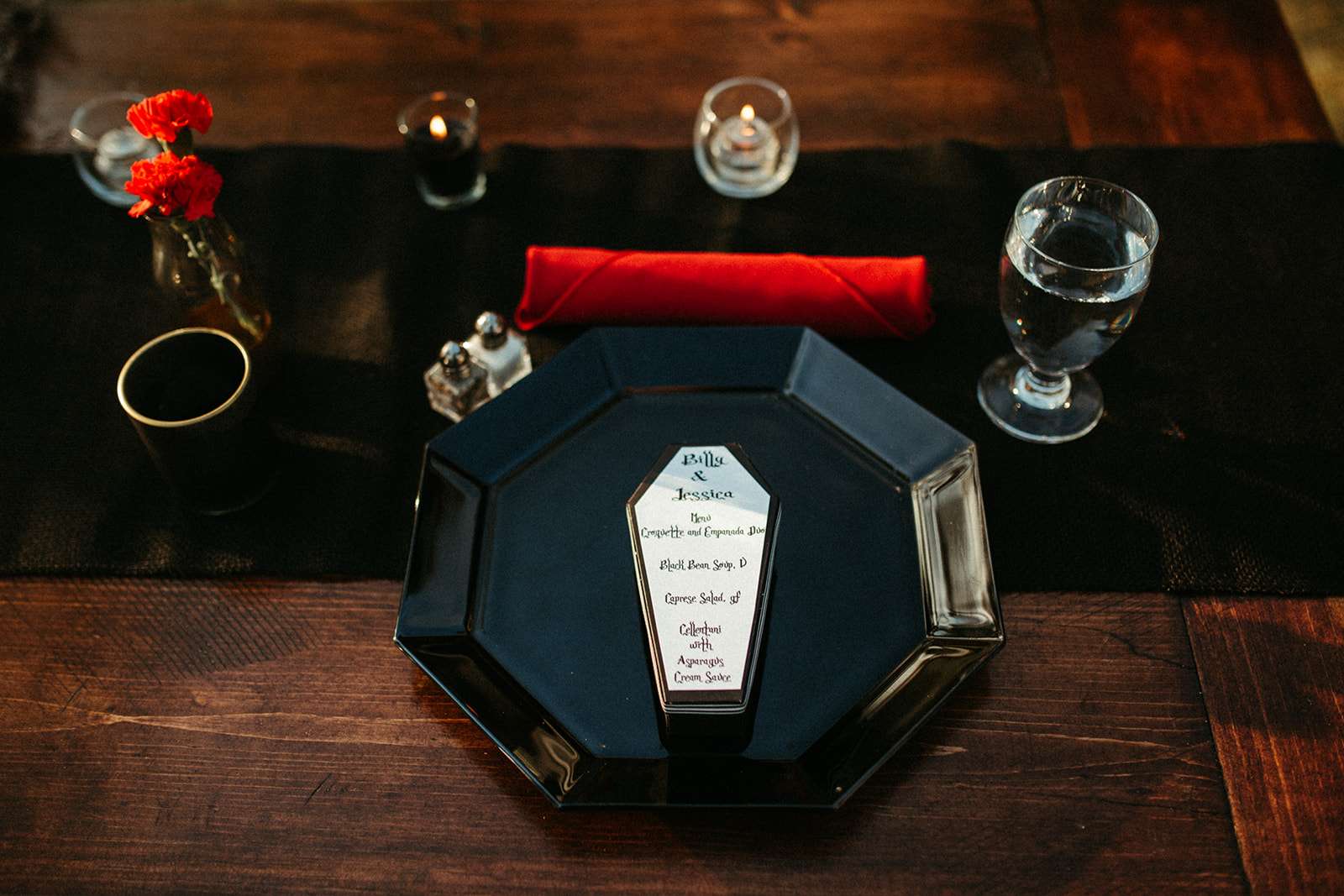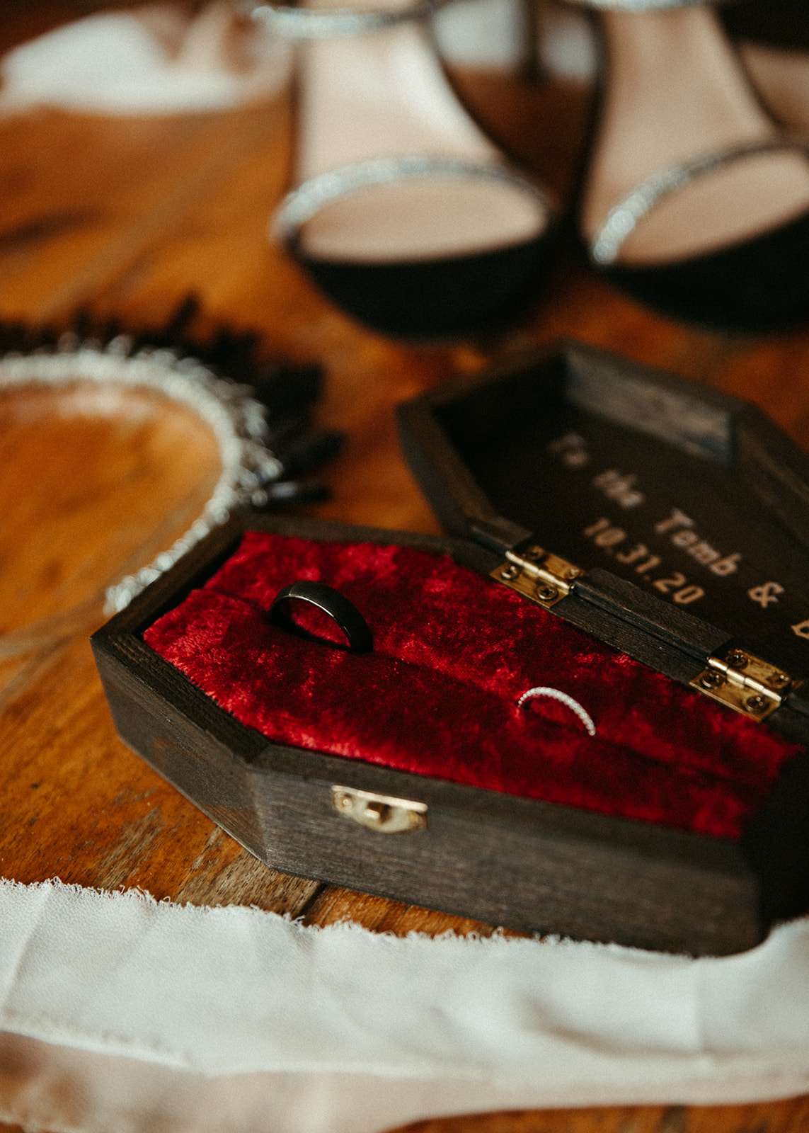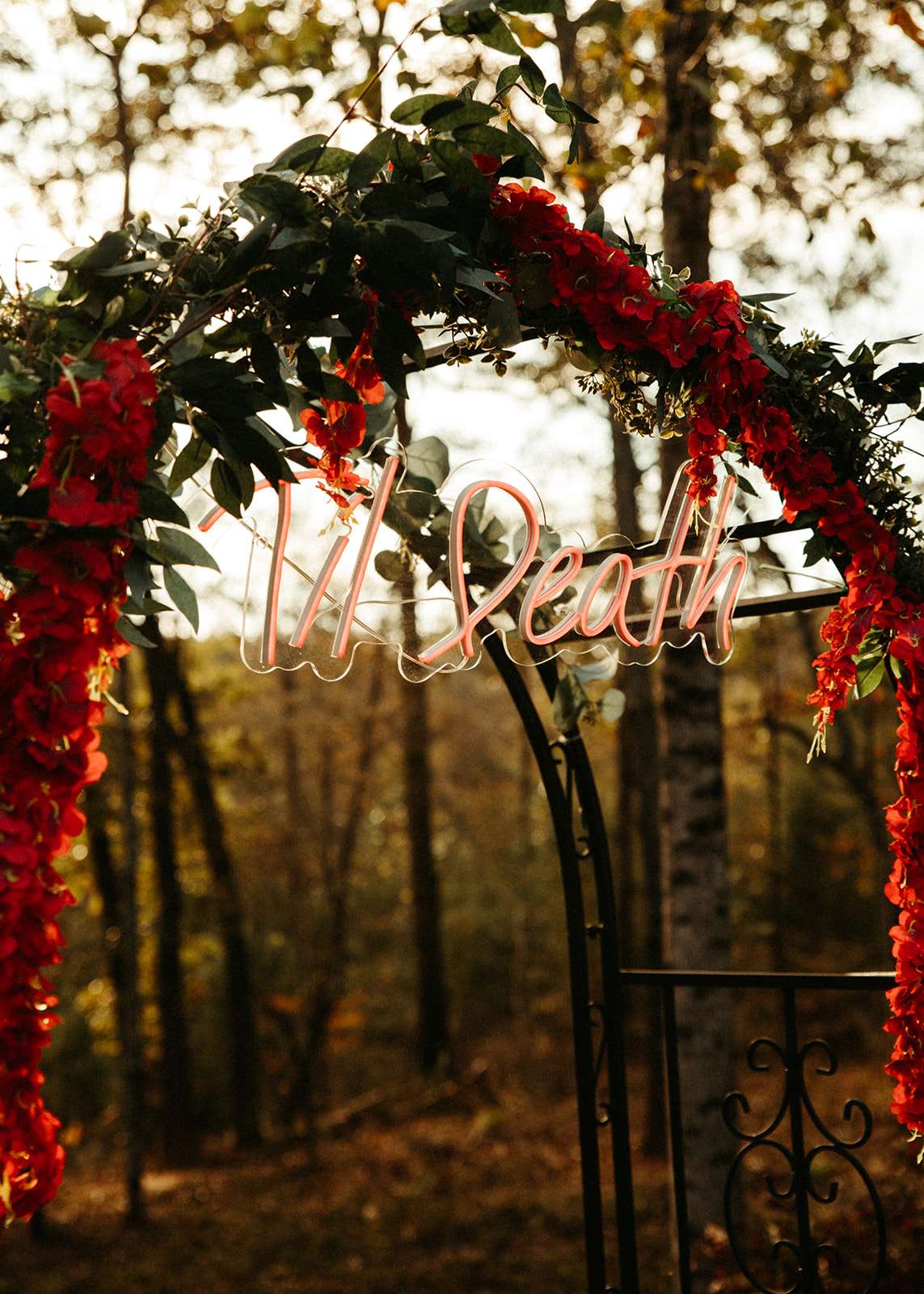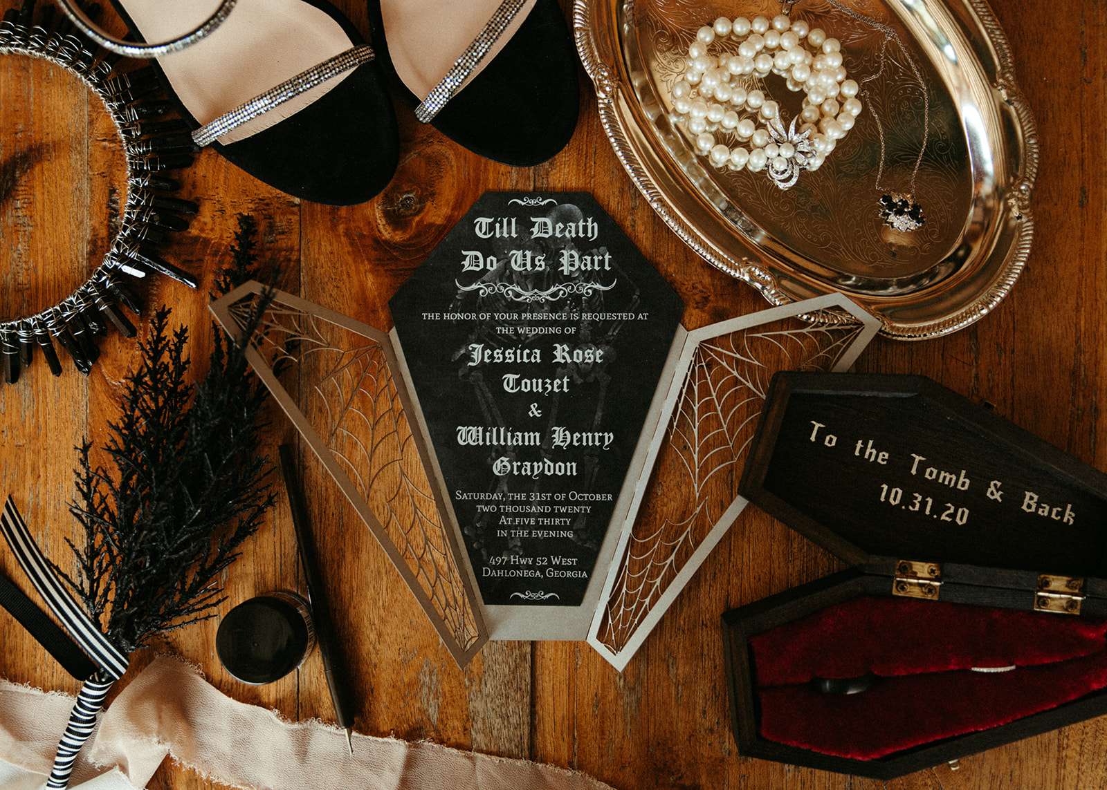 They went all out on the theme with décor such as a ‘Til l Death neon sign, custom coffin menu cards, black tree centrepieces with ravens, blood shots in vials (vodka and cranberry/grenadine), black chandeliers with real candles, a ceremony floor covered in eucalyptus and black cake pops with red velvet cake inside. For their rings they had a custom made a coffin with their wedding date on it.