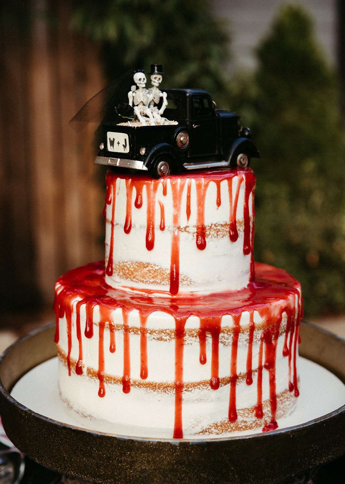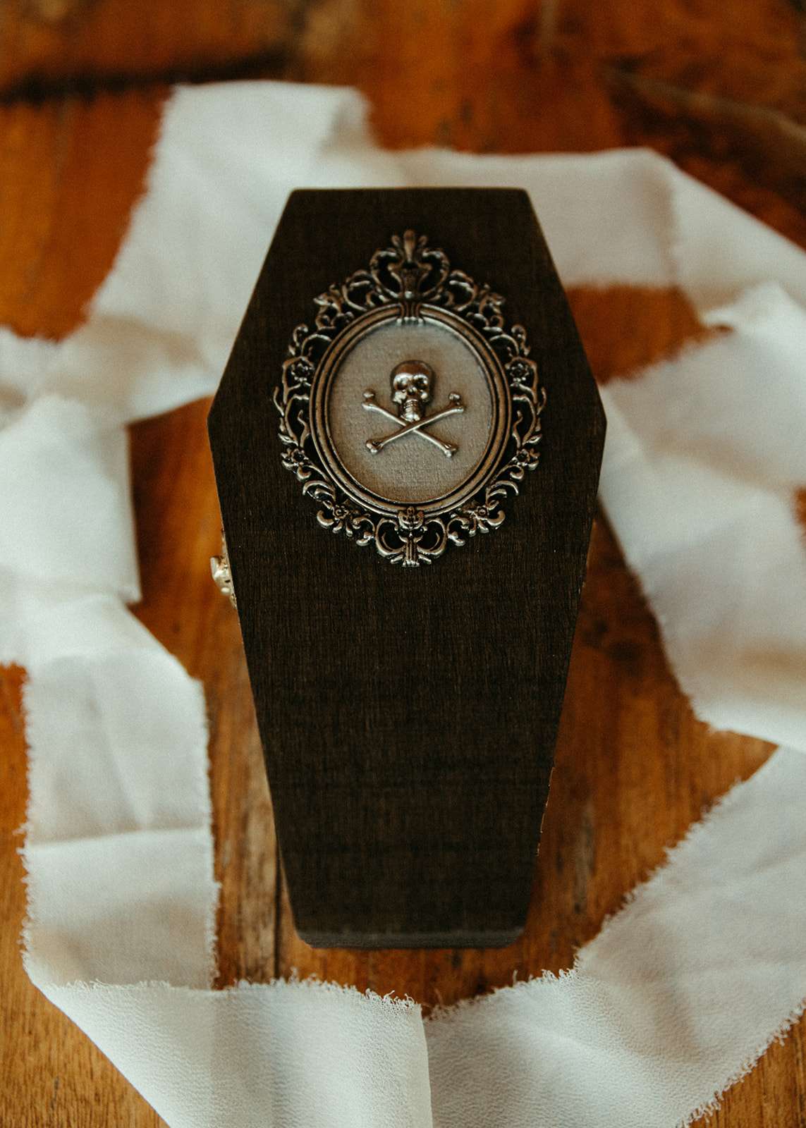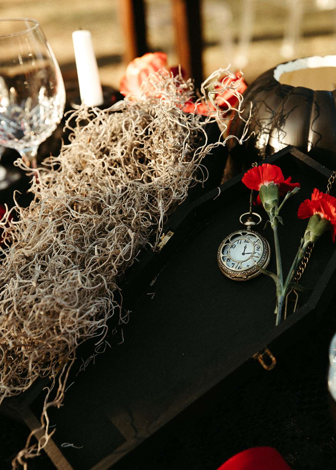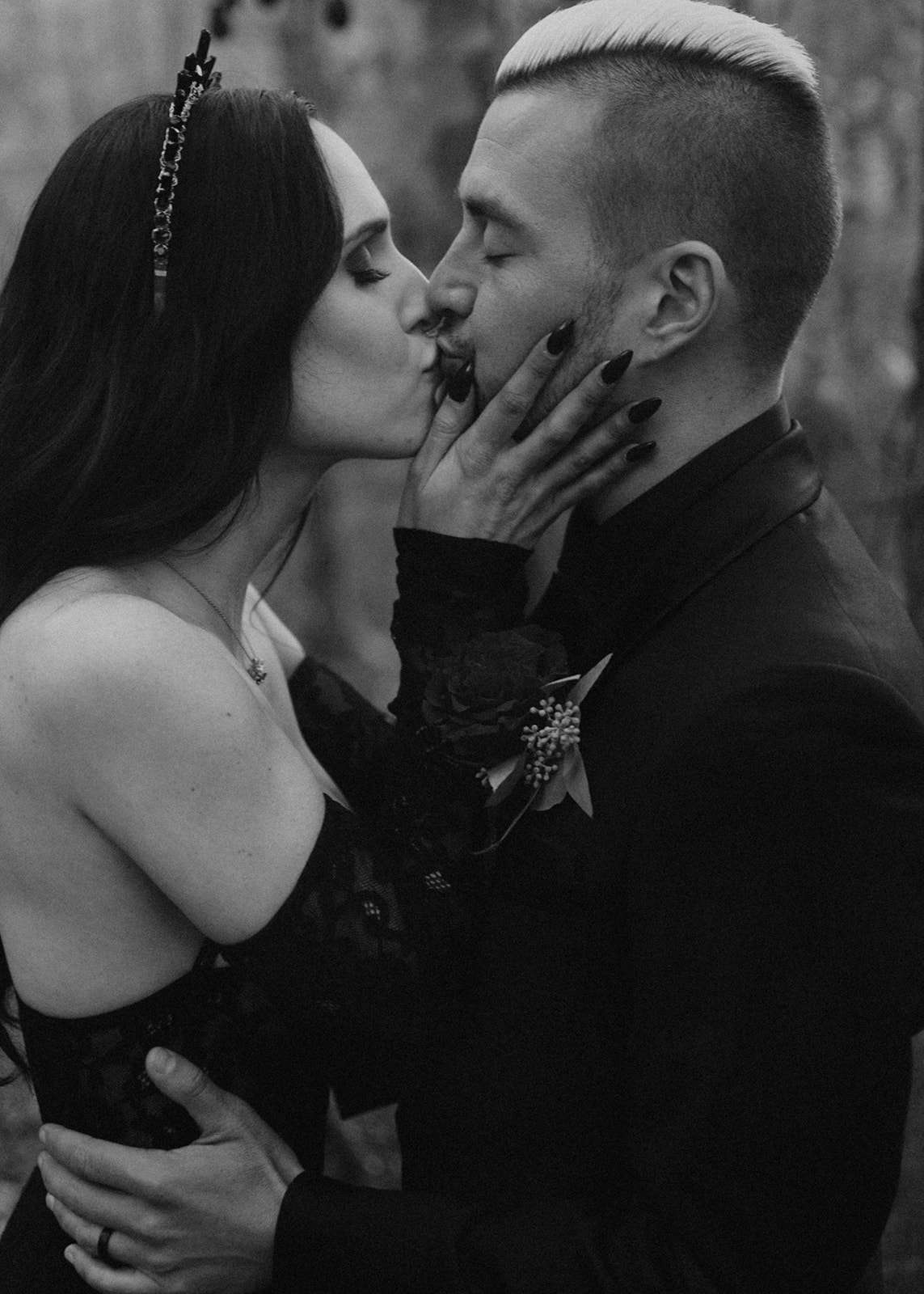 They went all out on the theme with décor such as a ‘Til l Death neon sign, custom coffin menu cards, black tree centrepieces with ravens, blood shots in vials (vodka and cranberry/grenadine), black chandeliers with real candles, a ceremony floor covered in eucalyptus and black cake pops with red velvet cake inside. For their rings they had a custom made a coffin with their wedding date on it.