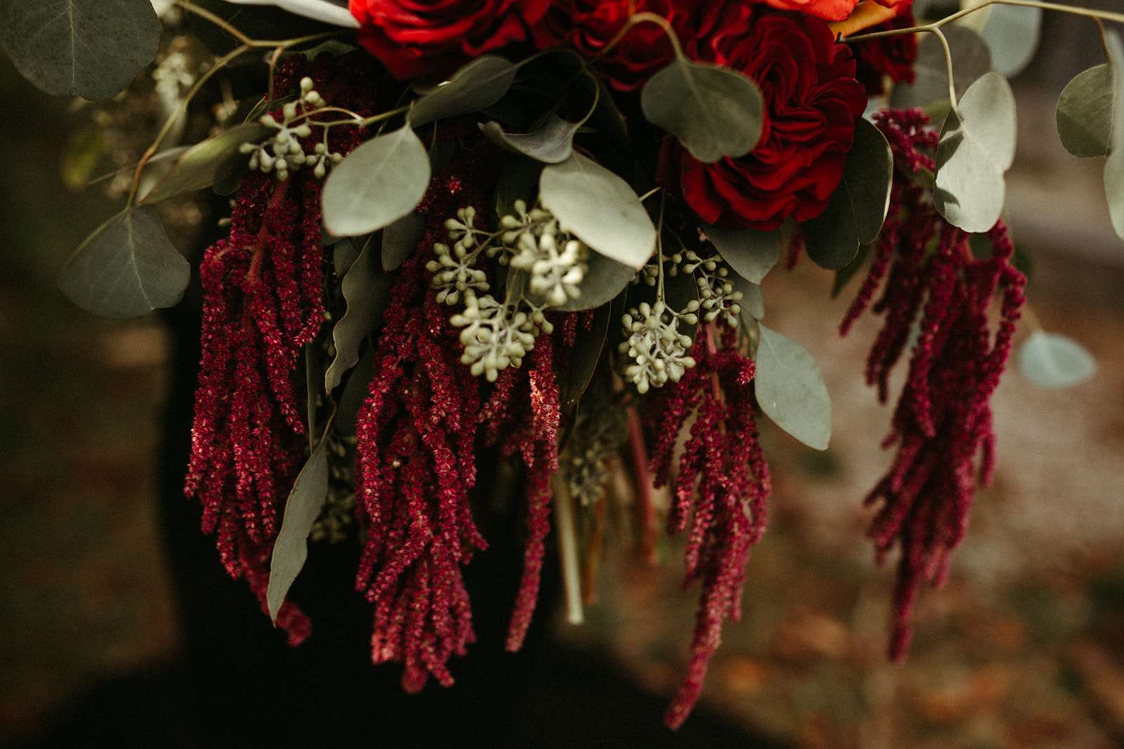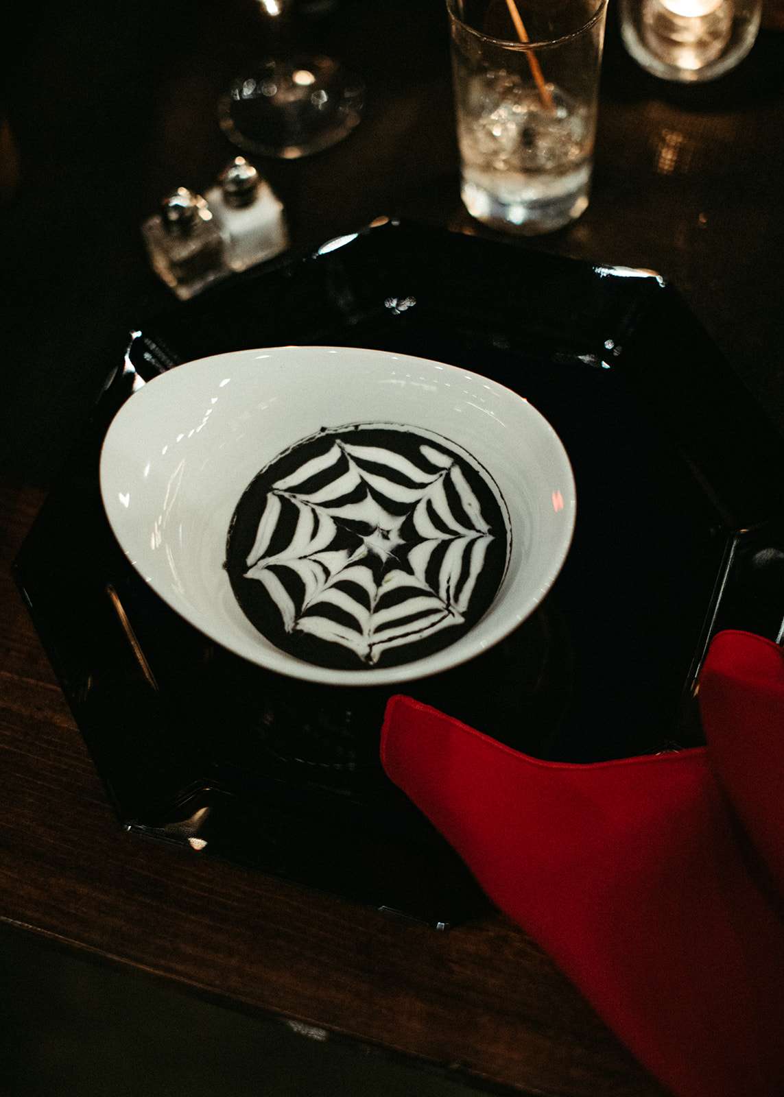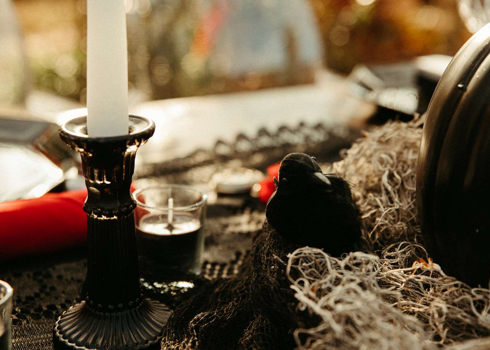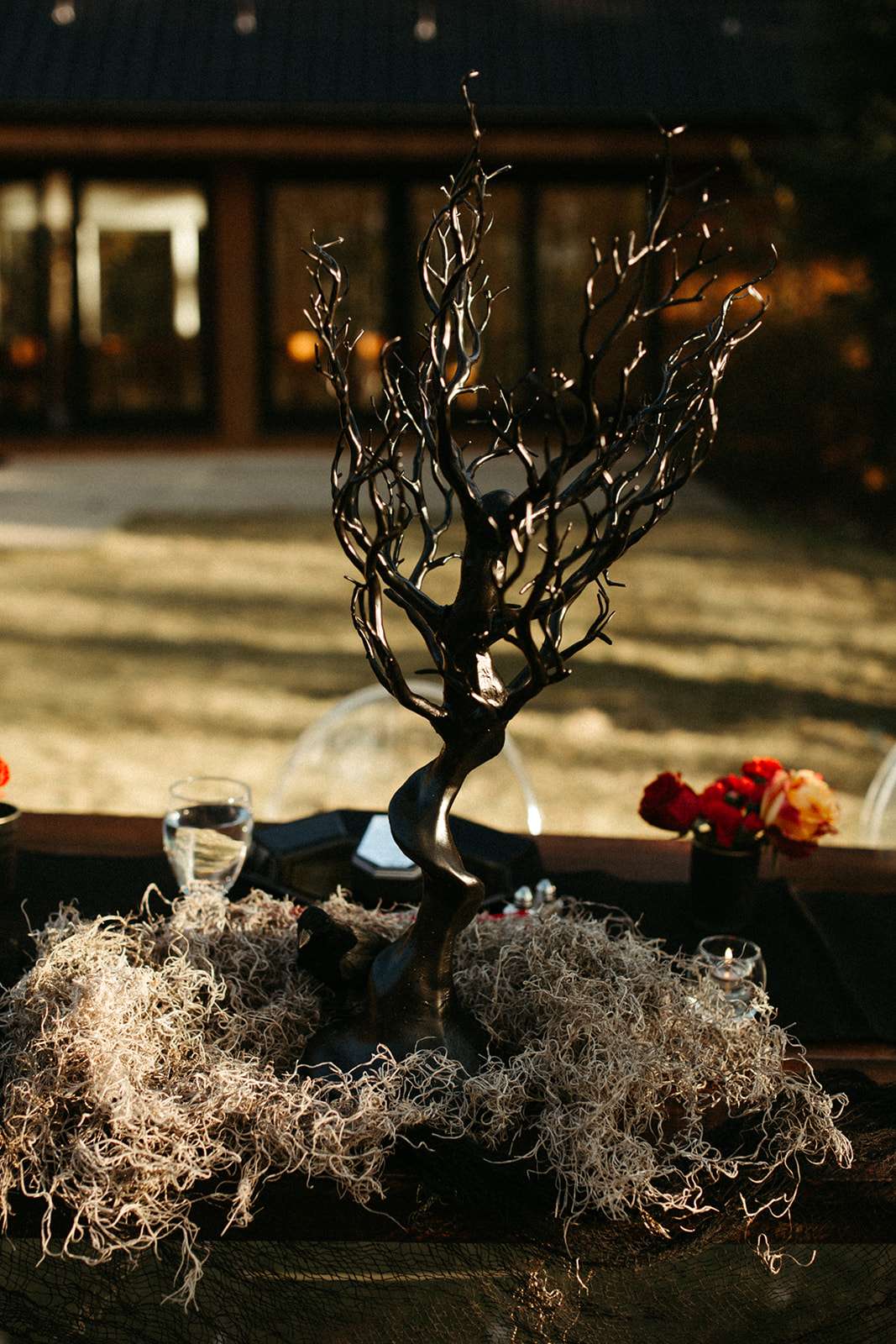 They went all out on the theme with décor such as a ‘Til l Death neon sign, custom coffin menu cards, black tree centrepieces with ravens, blood shots in vials (vodka and cranberry/grenadine), black chandeliers with real candles, a ceremony floor covered in eucalyptus and black cake pops with red velvet cake inside. For their rings they had a custom made a coffin with their wedding date on it.