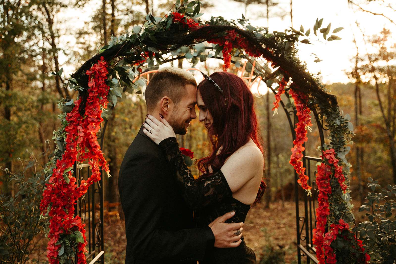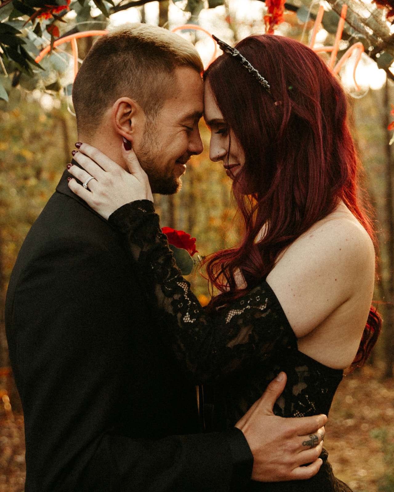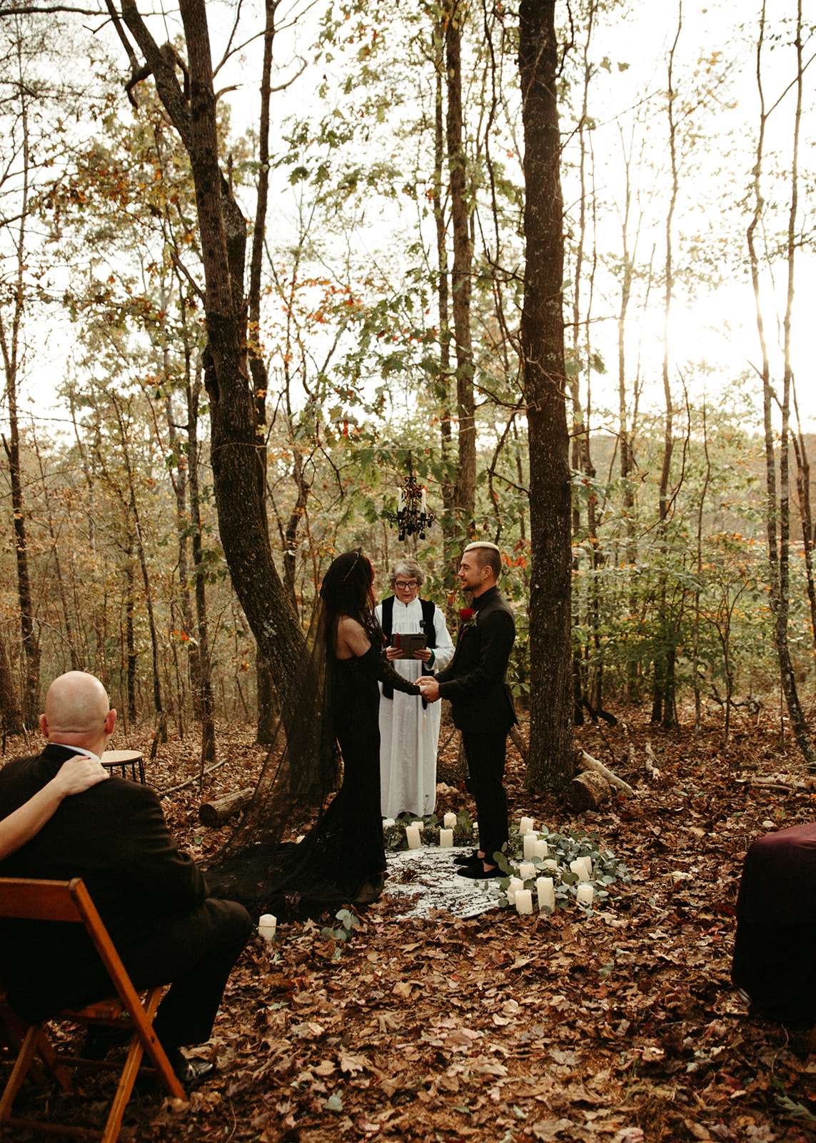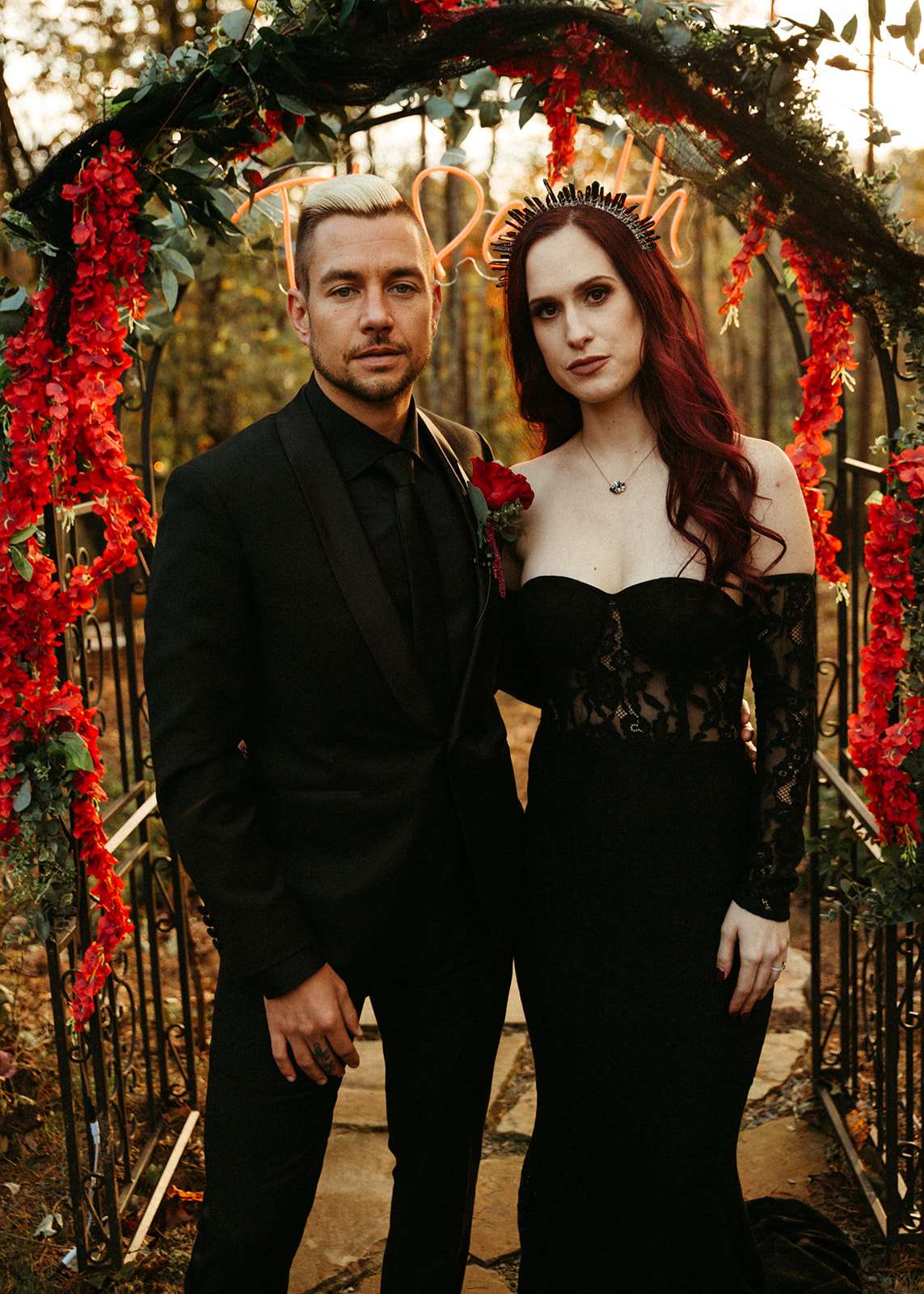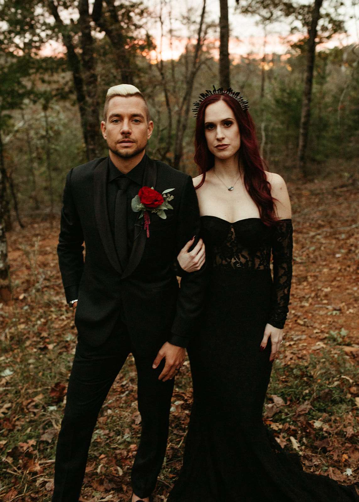 The pair were hitched last October 31st, in Dahlonega, GA at Juliette Chapel & Events Centre. They both love Halloween and the woods so it was the perfect date and setting for them. The bride wore a custom made black wedding dress with jewellery previously owned by her mother and grandmother.