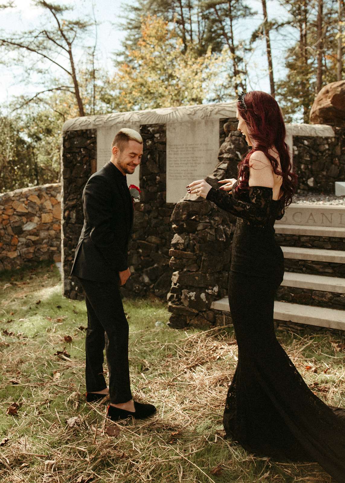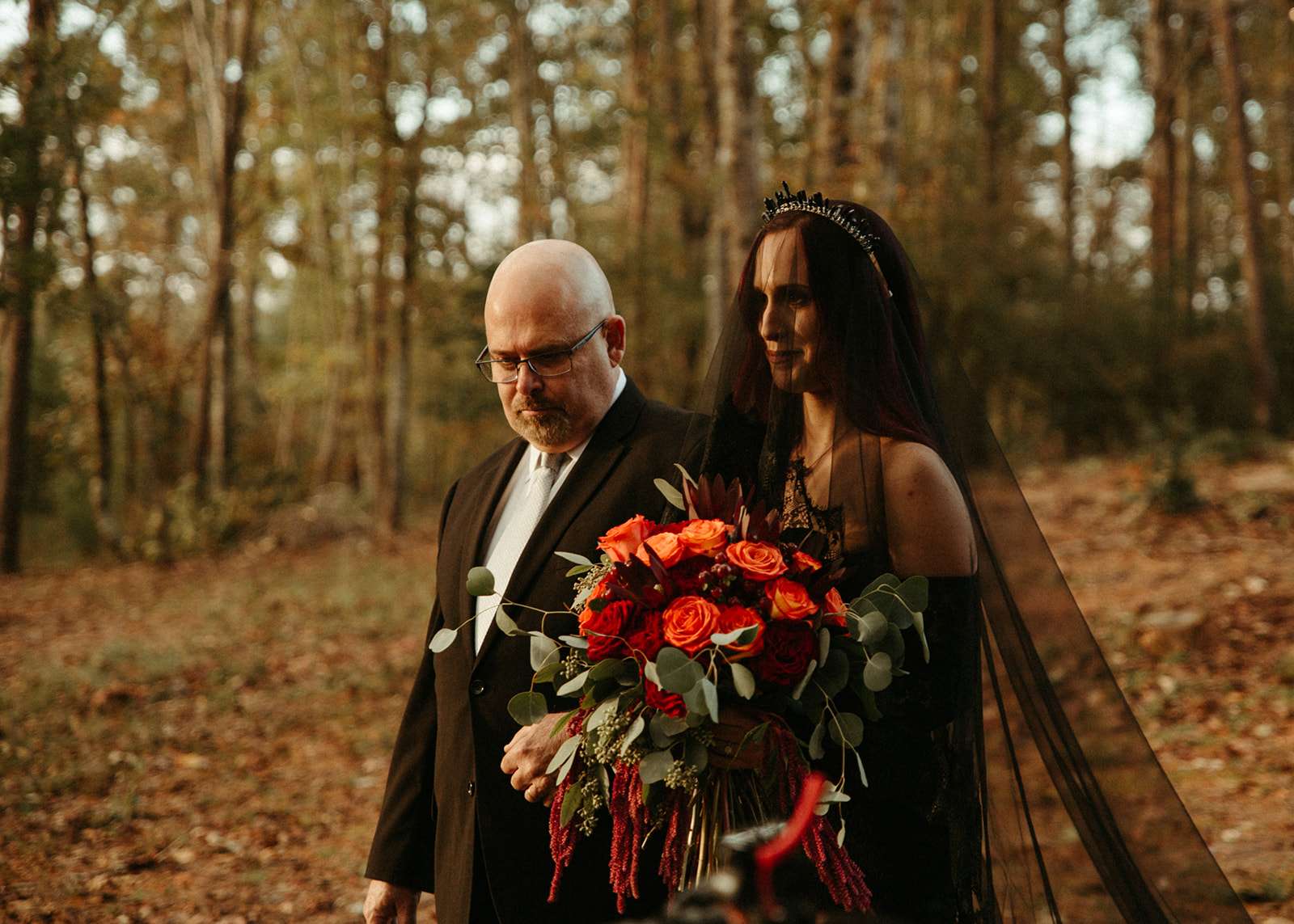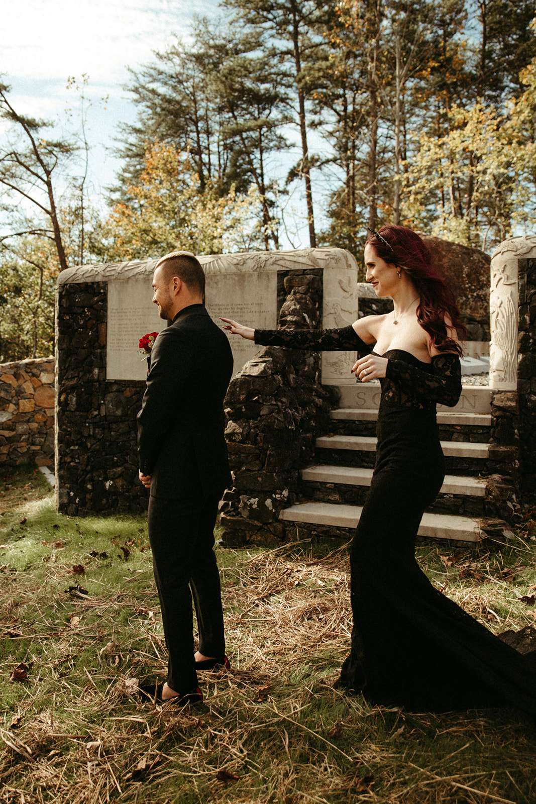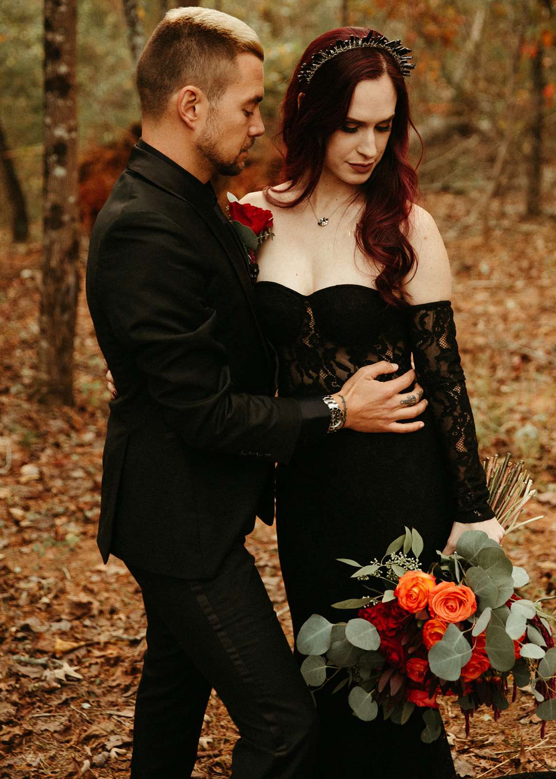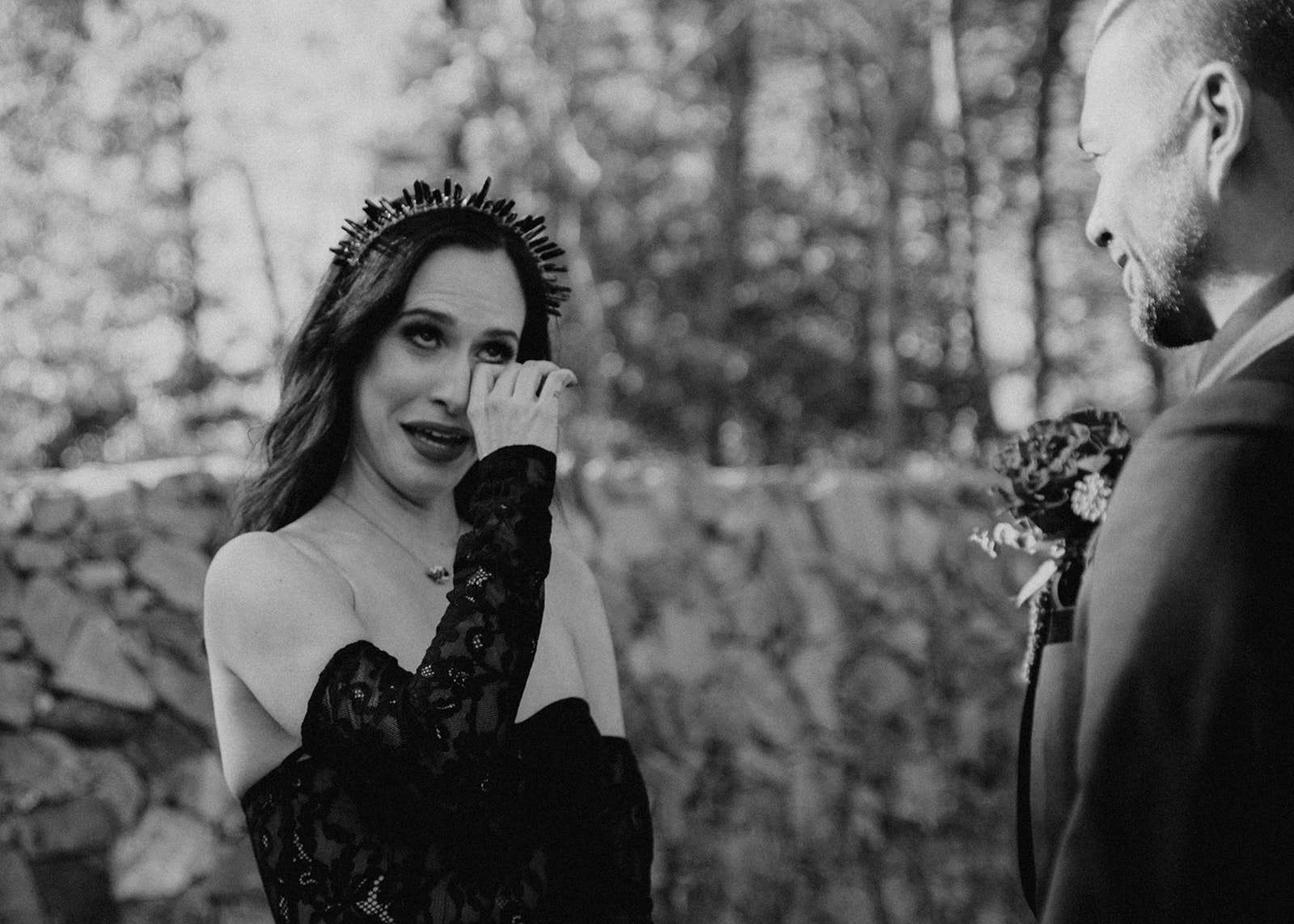 The pair were hitched last October 31st, in Dahlonega, GA at Juliette Chapel & Events Centre. They both love Halloween and the woods so it was the perfect date and setting for them. The bride wore a custom made black wedding dress with jewellery previously owned by her mother and grandmother.