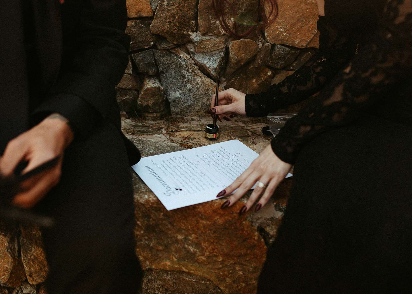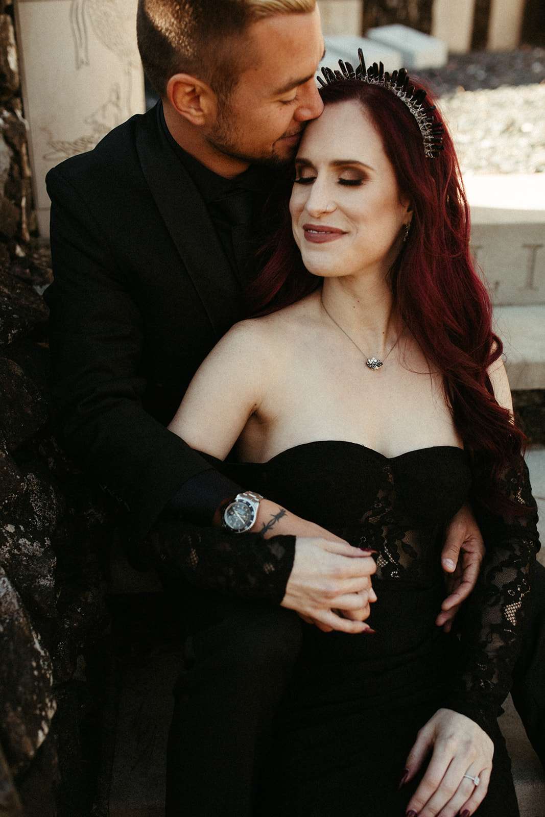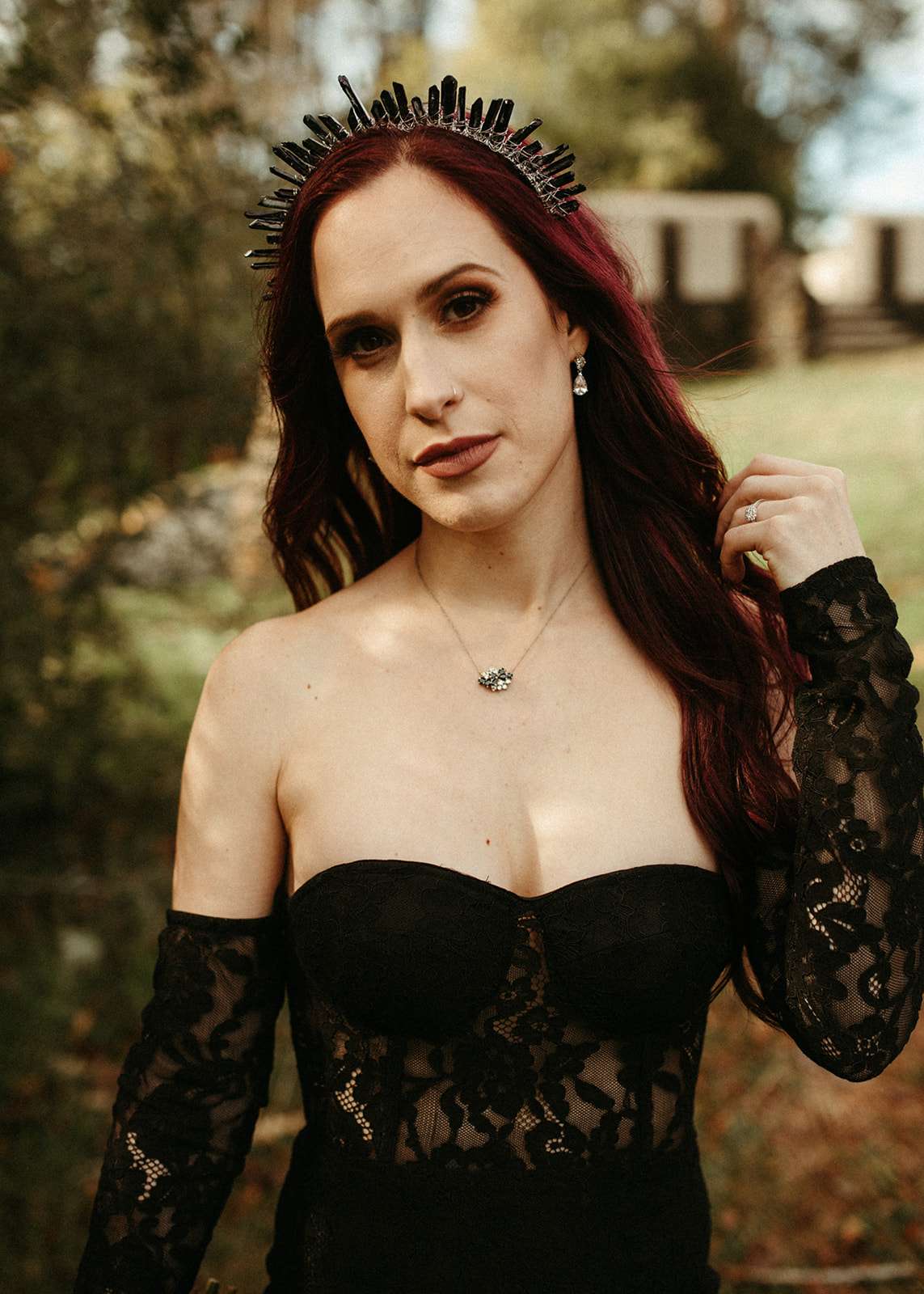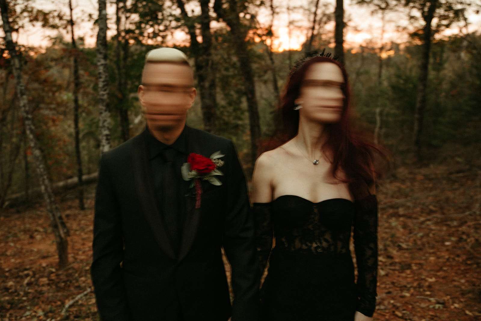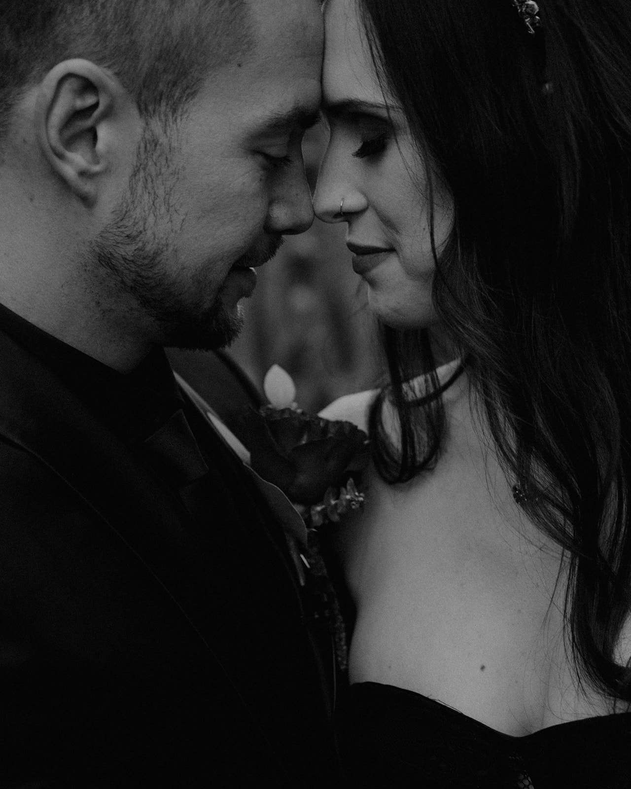 The pair were hitched last October 31st, in Dahlonega, GA at Juliette Chapel & Events Centre. They both love Halloween and the woods so it was the perfect date and setting for them. The bride wore a custom made black wedding dress with jewellery previously owned by her mother and grandmother.