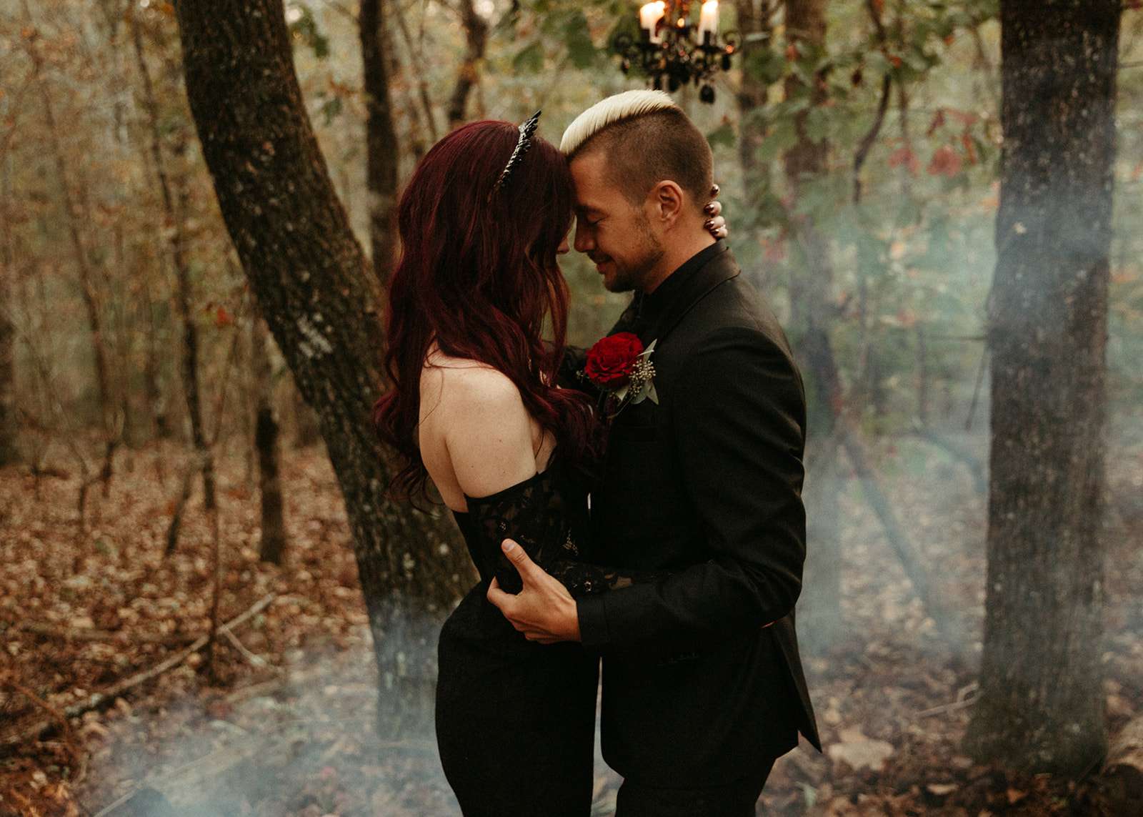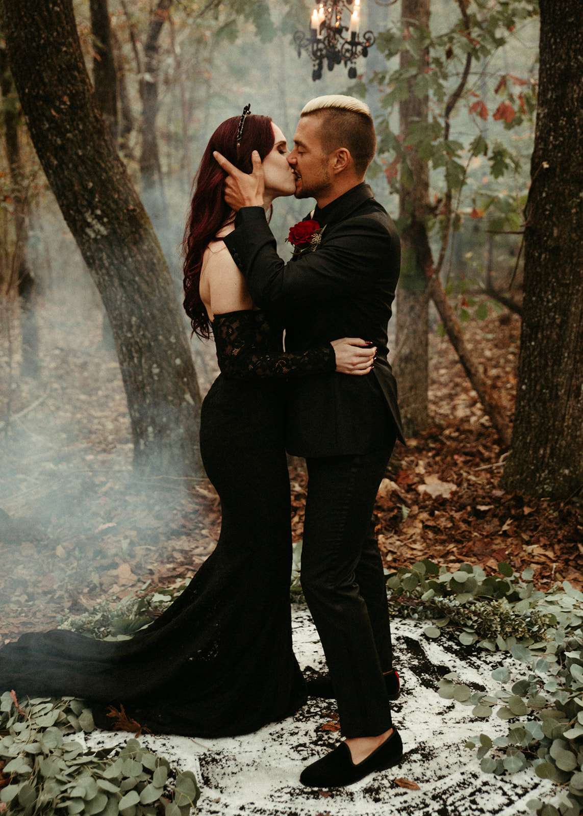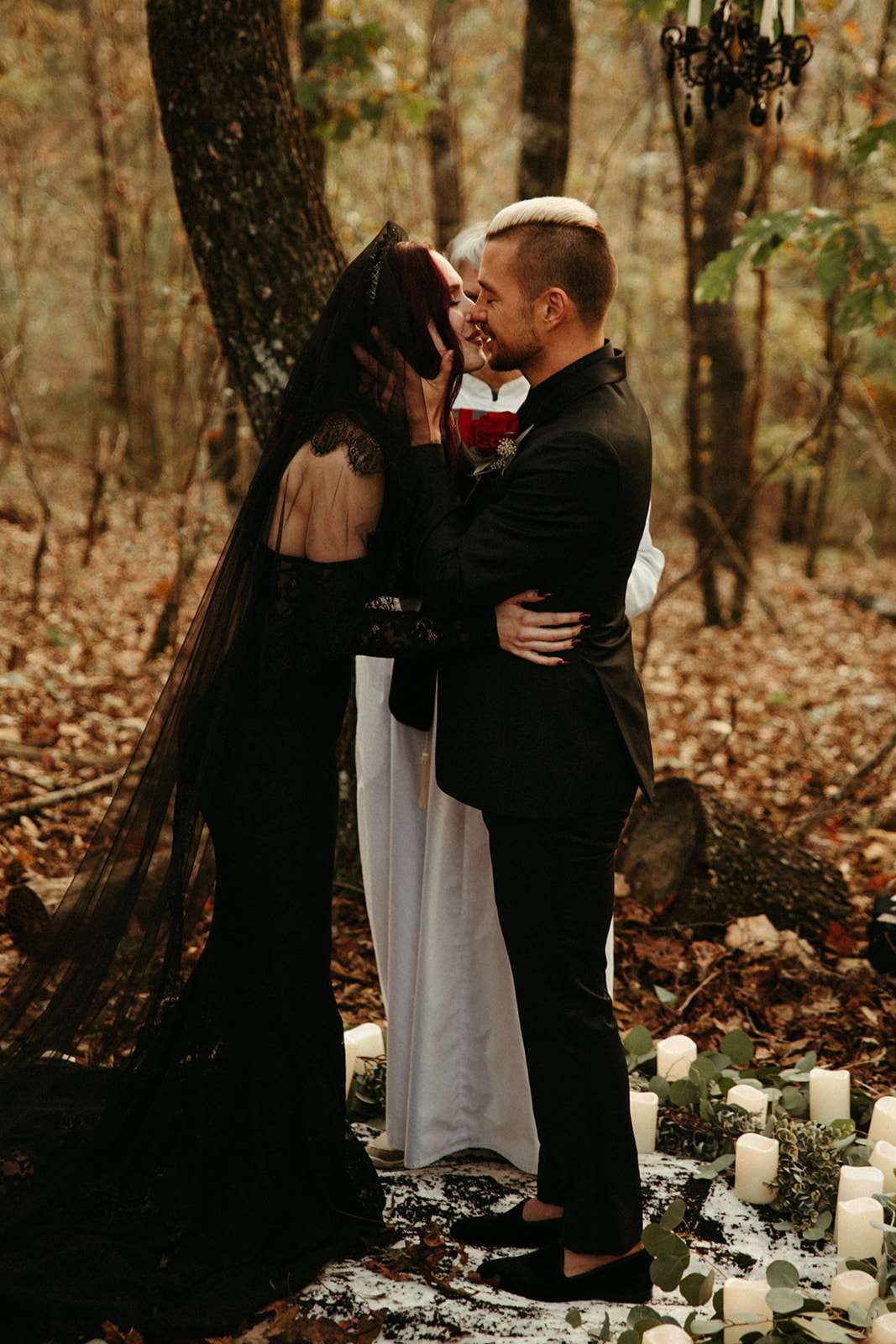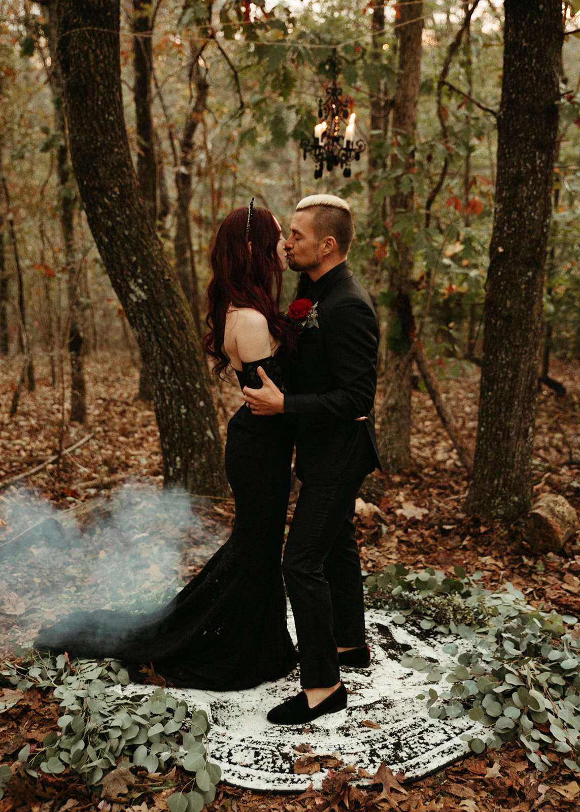 “As a violin played music for everyone in the woods close to sunset, we go married in the beautiful woods of Georgia”, Jessica explained. “We had black lit chandeliers and eucalyptus décor everywhere. We also did a blood ceremony during our vows.”
