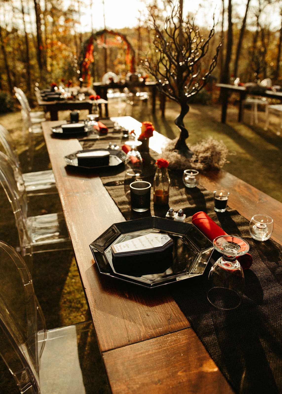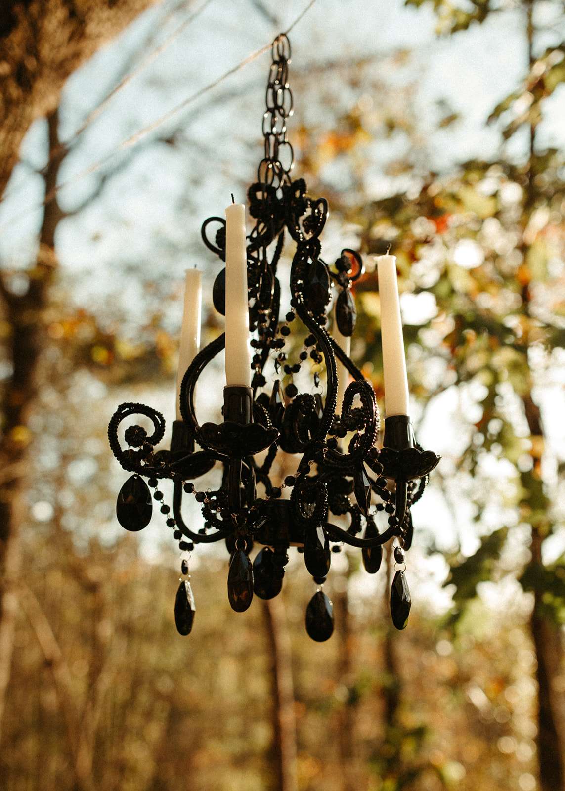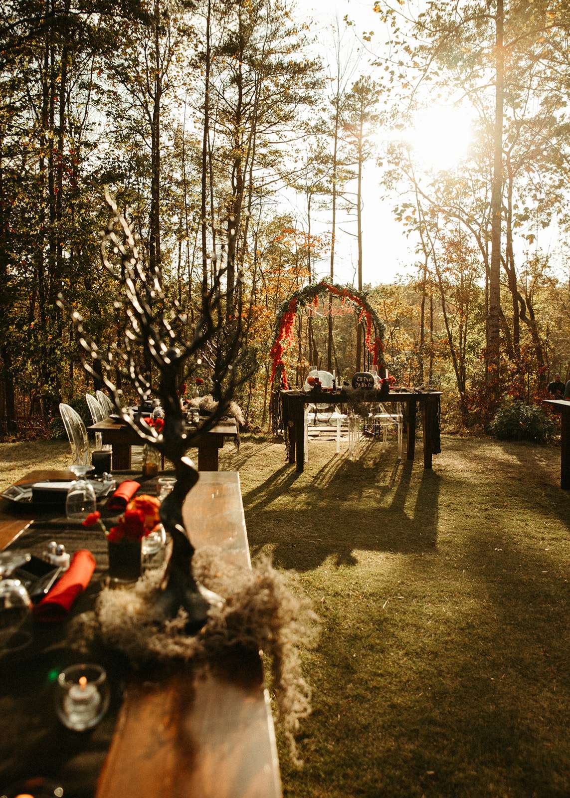 “As a violin played music for everyone in the woods close to sunset, we go married in the beautiful woods of Georgia”, Jessica explained. “We had black lit chandeliers and eucalyptus décor everywhere. We also did a blood ceremony during our vows.”
