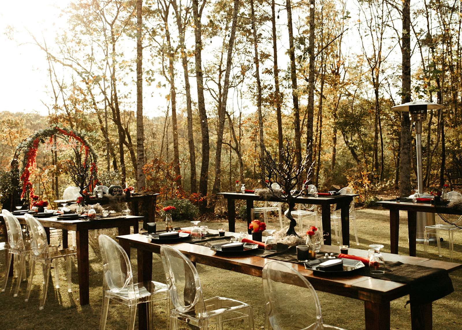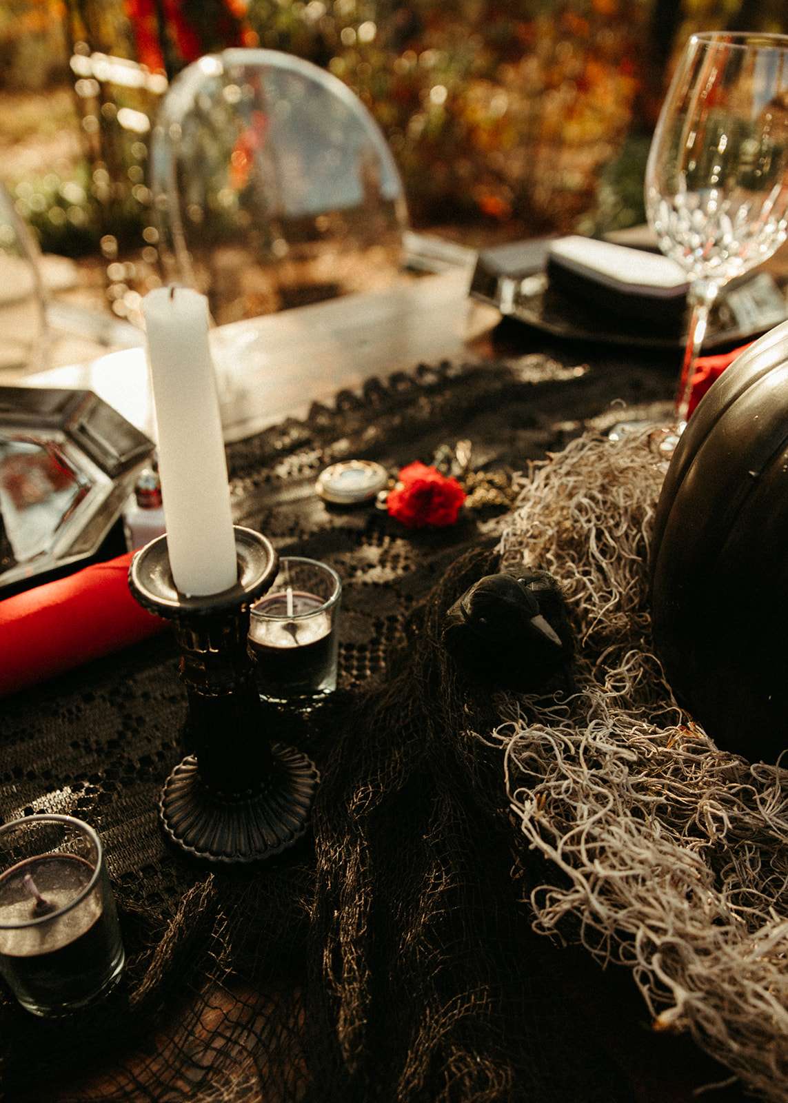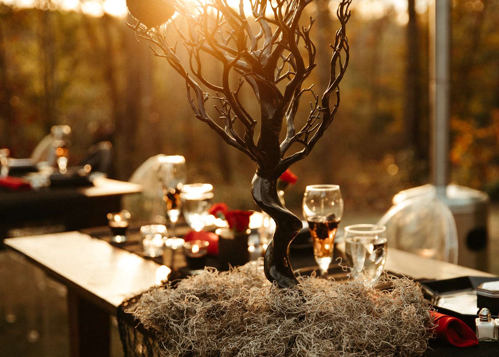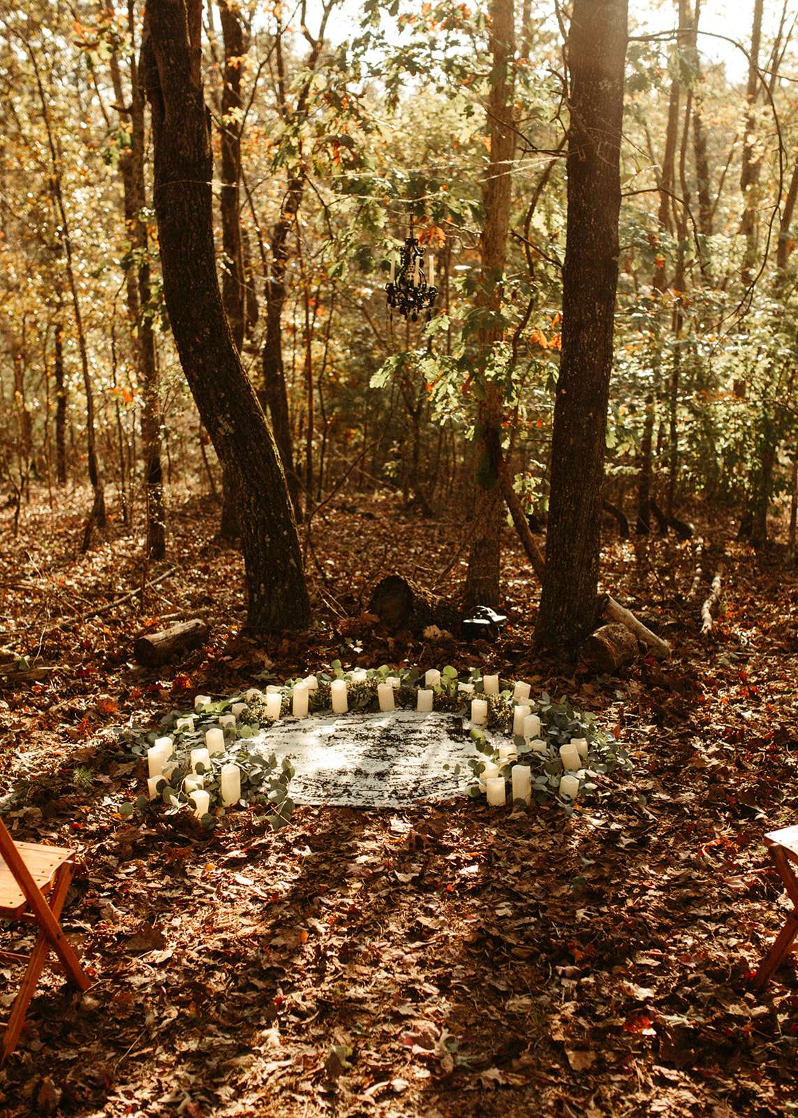 “As a violin played music for everyone in the woods close to sunset, we go married in the beautiful woods of Georgia”, Jessica explained. “We had black lit chandeliers and eucalyptus décor everywhere. We also did a blood ceremony during our vows.”