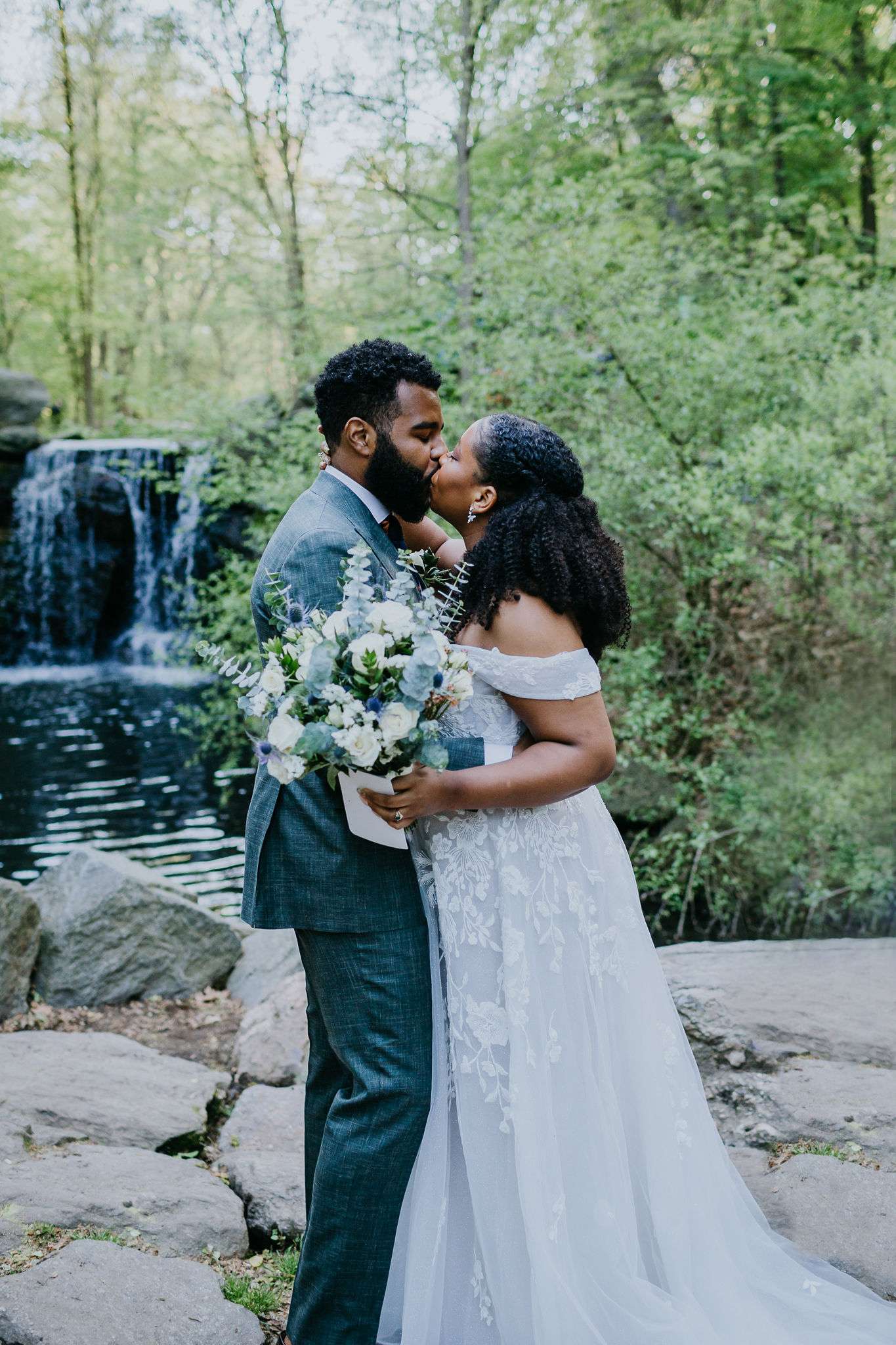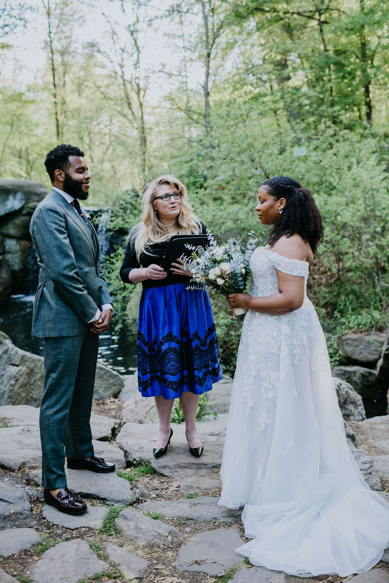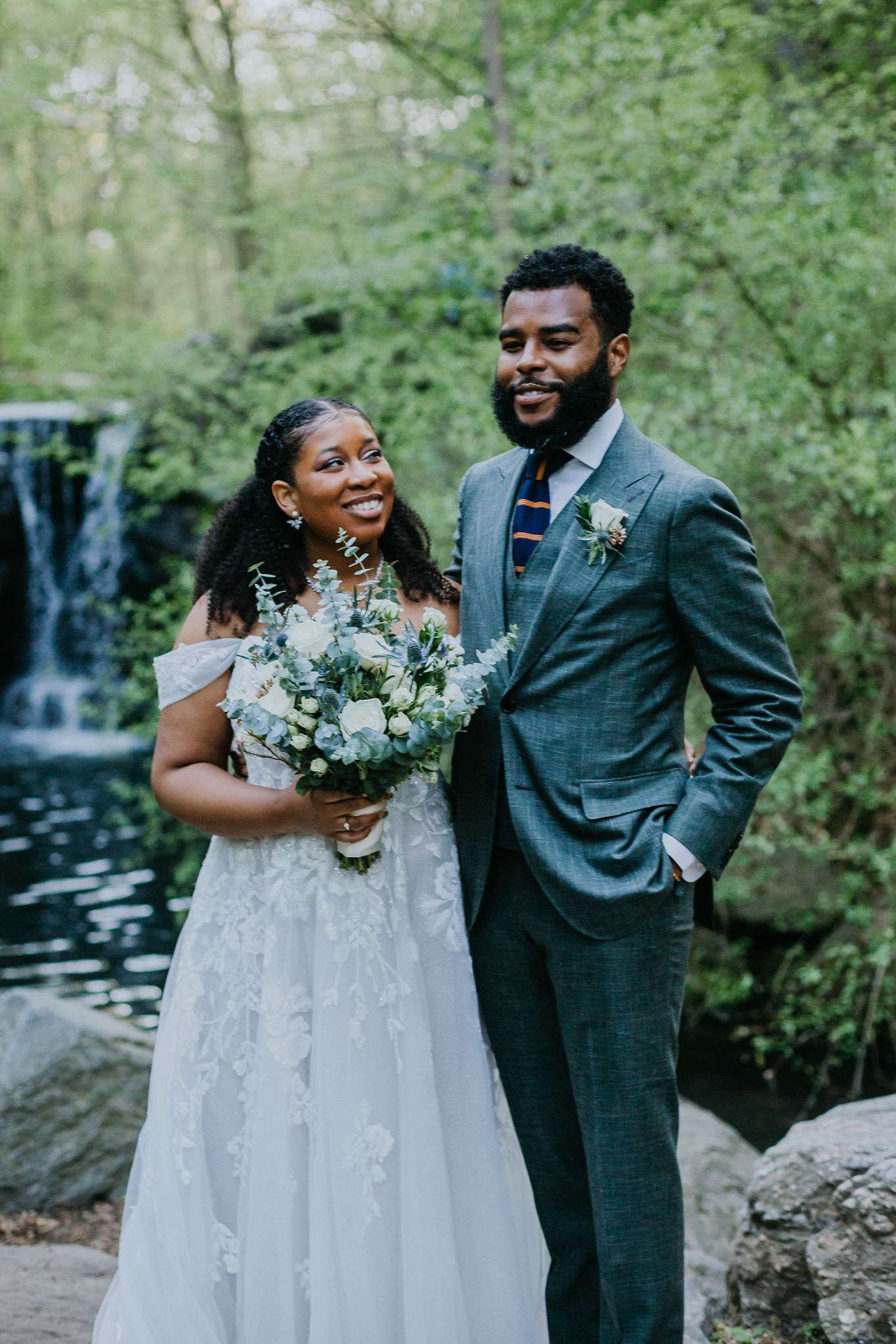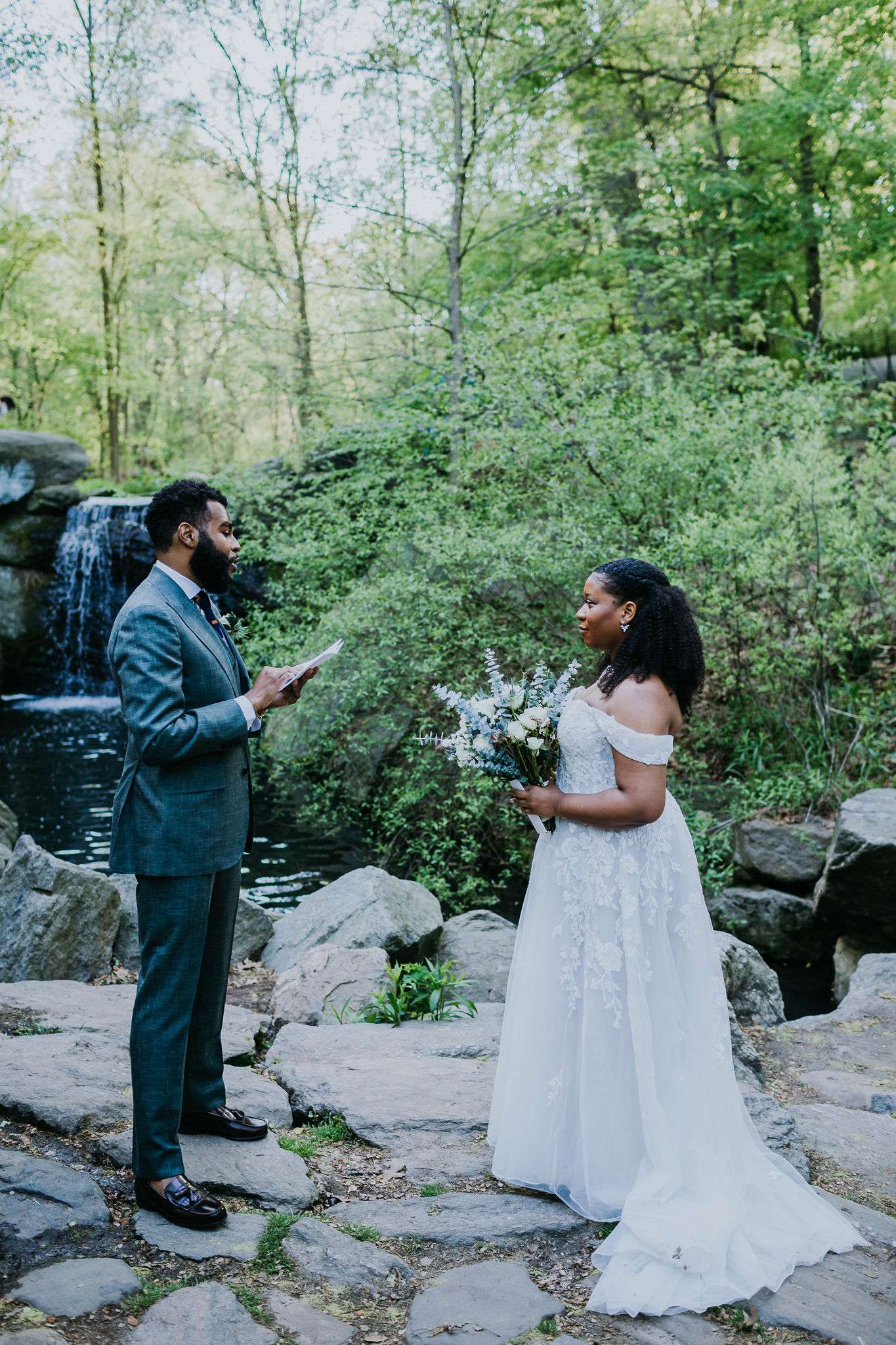 Spring was the biggest inspiration for Chris and Karyn’s Central Park elopement. “We were initially planning on getting married on the Spring Solstice,” she told us, “but it is very cold in March in NYC so we decided against it.” Instead, they focused on creating a serene atmosphere, by choosing to have their ceremony in front of a waterfall in North Woods, Central Park, and kept the details fun and boho.