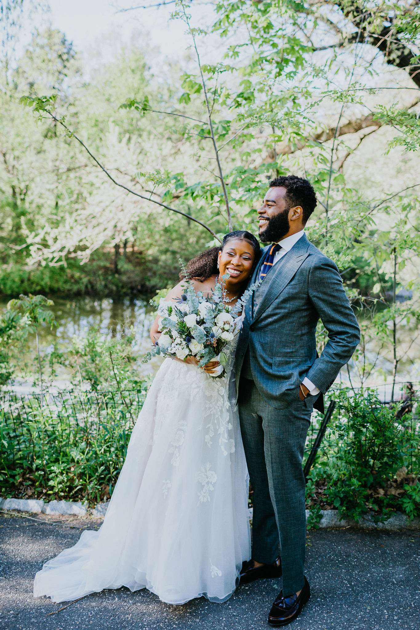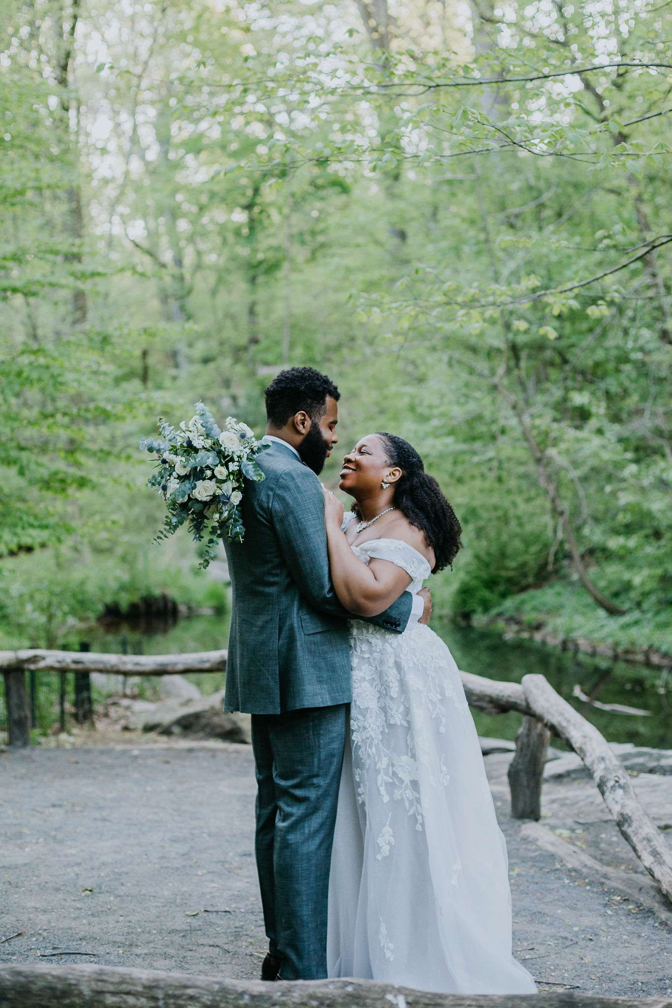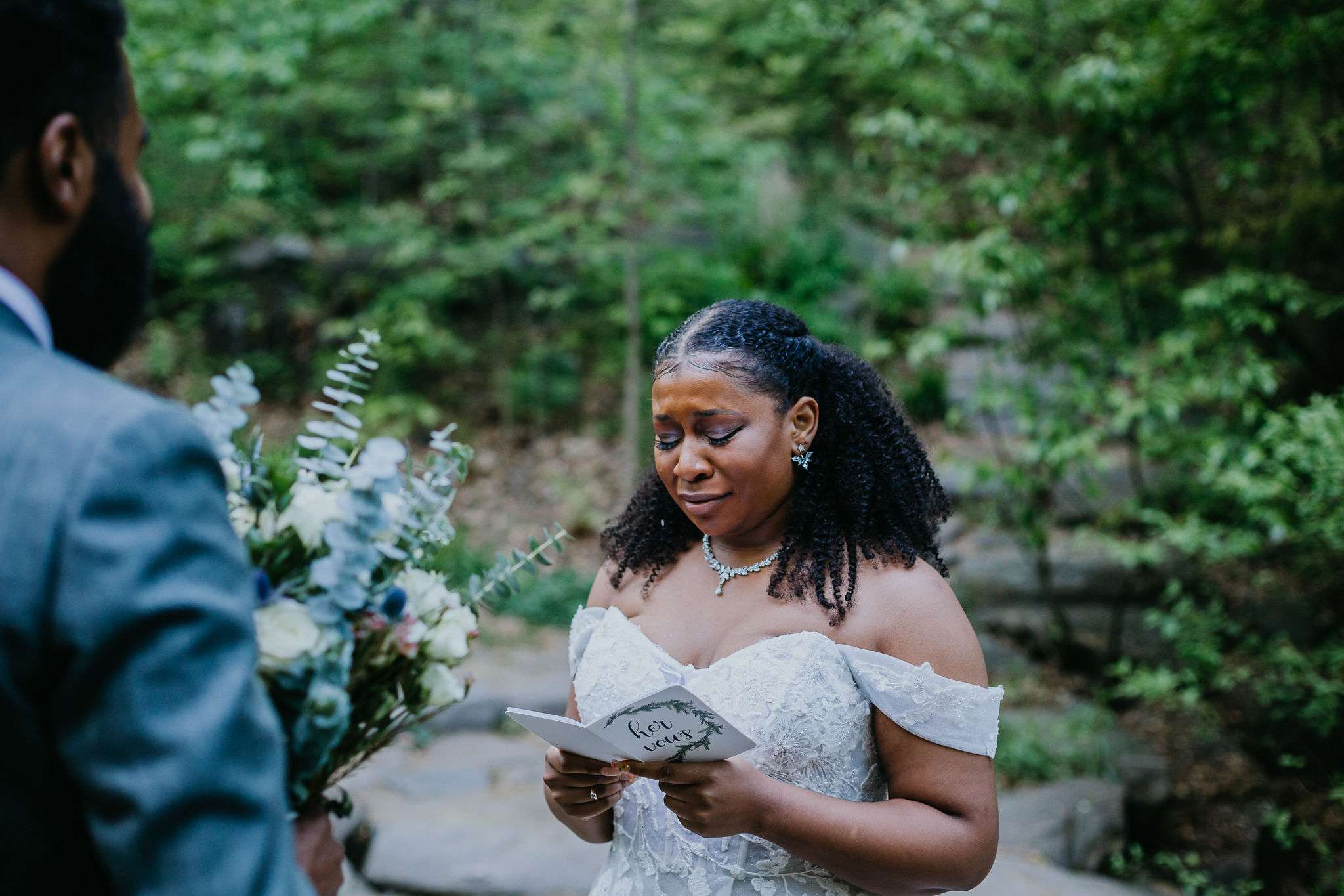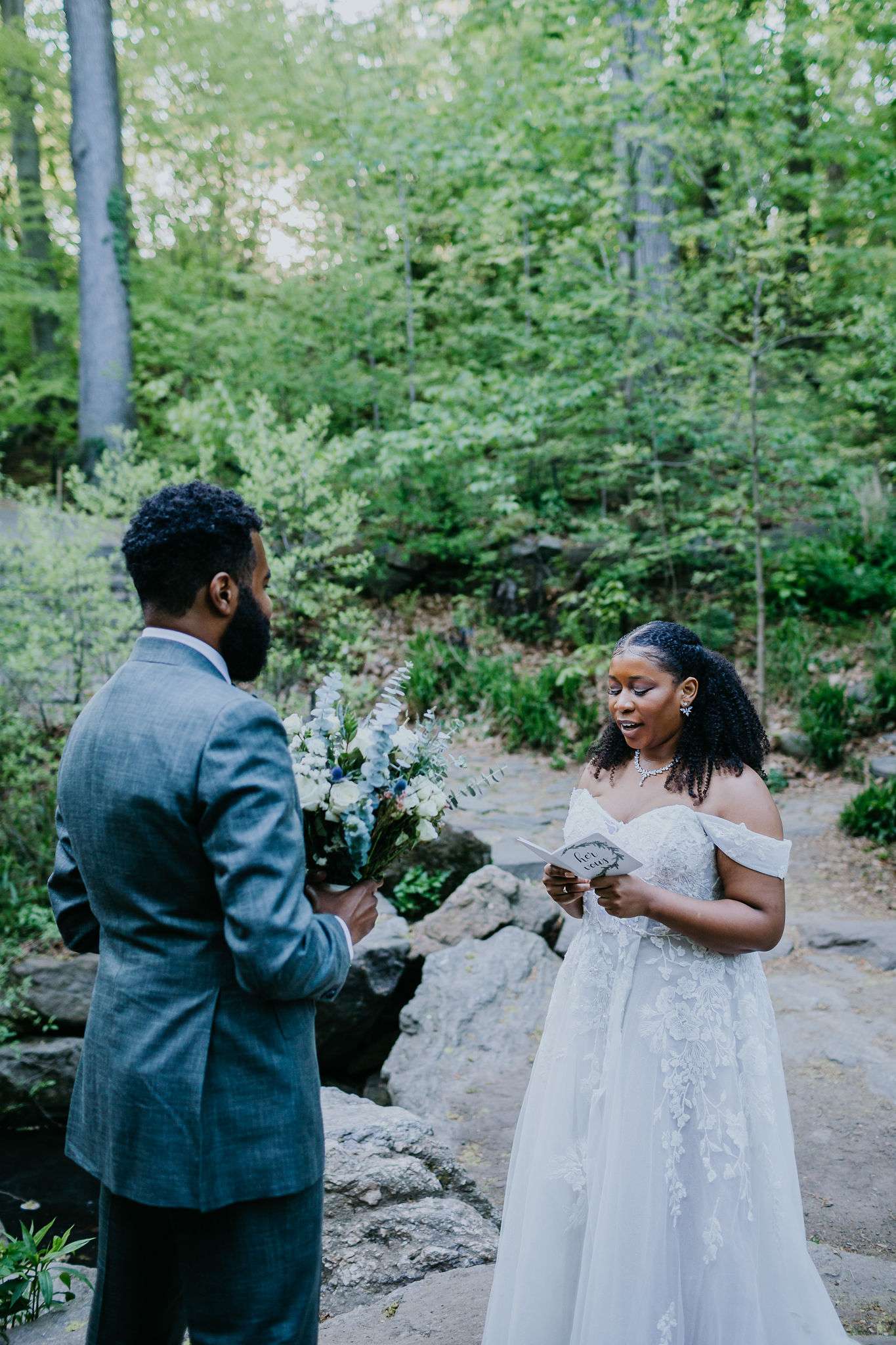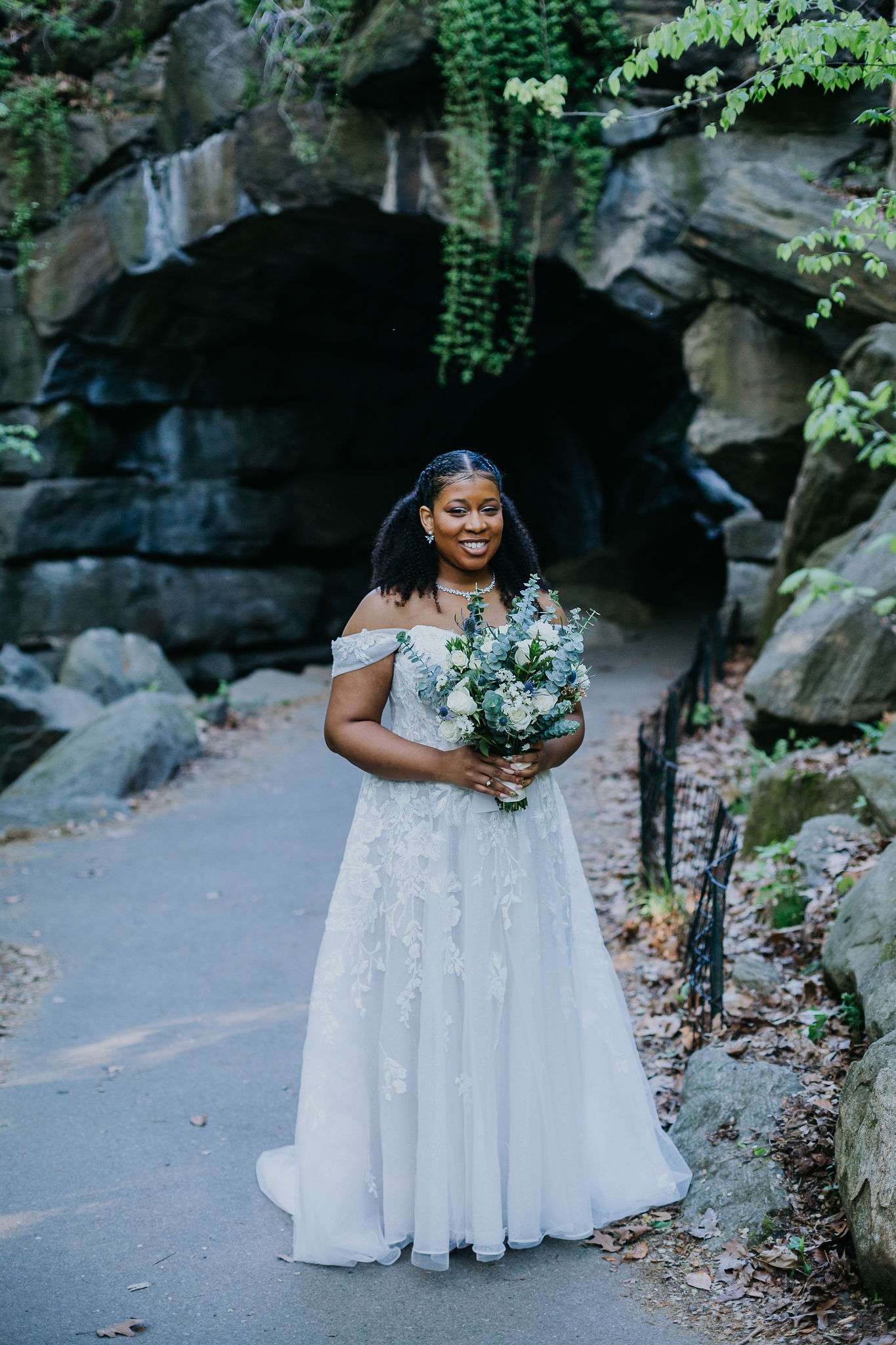 Spring was the biggest inspiration for Chris and Karyn’s Central Park elopement. “We were initially planning on getting married on the Spring Solstice,” she told us, “but it is very cold in March in NYC so we decided against it.” Instead, they focused on creating a serene atmosphere, by choosing to have their ceremony in front of a waterfall in North Woods, Central Park, and kept the details fun and boho.