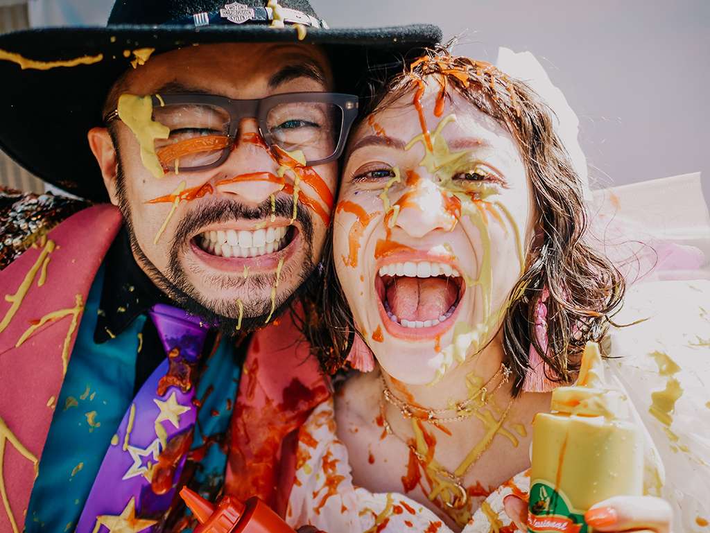 They chose Yokosuka, close to Tokyo, for the shoot location as there is an American base there and the culture surrounding it fitted the theme. They had fun getting portraits around town, before a pitstop of their favourite pizzas to fuel up for a very unique trash the dress session with ketchup and mustard!