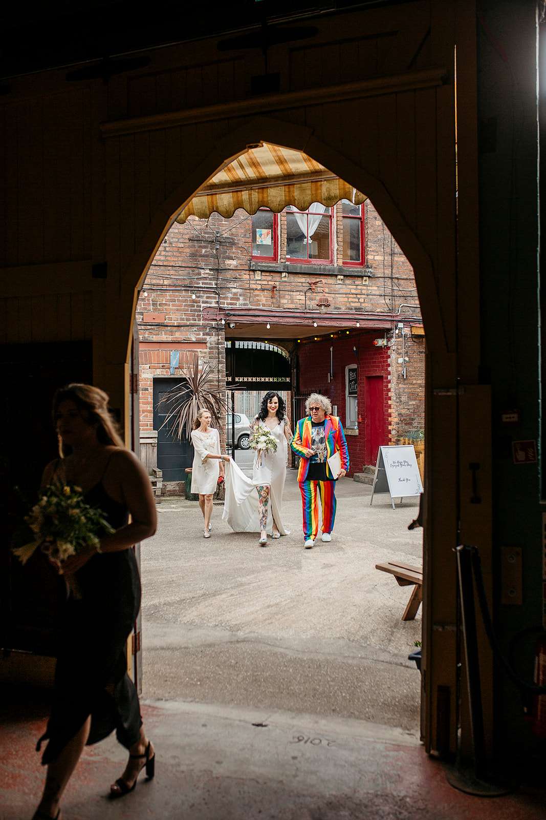 The bride arrived via VW camper with her parents and best friend and made her way through the courtyard to the warehouse space in the venue for their ceremony. Accompanied down the aisle by her dad in a rainbow suit and giraffe t-shirt (“I had explicitly told him he could do, wear and say anything he wanted to that day because he is unapologetically himself and I take my inspiration from him”) she walked in to Tuesday’s Gone by Lynyrd Skynyr.