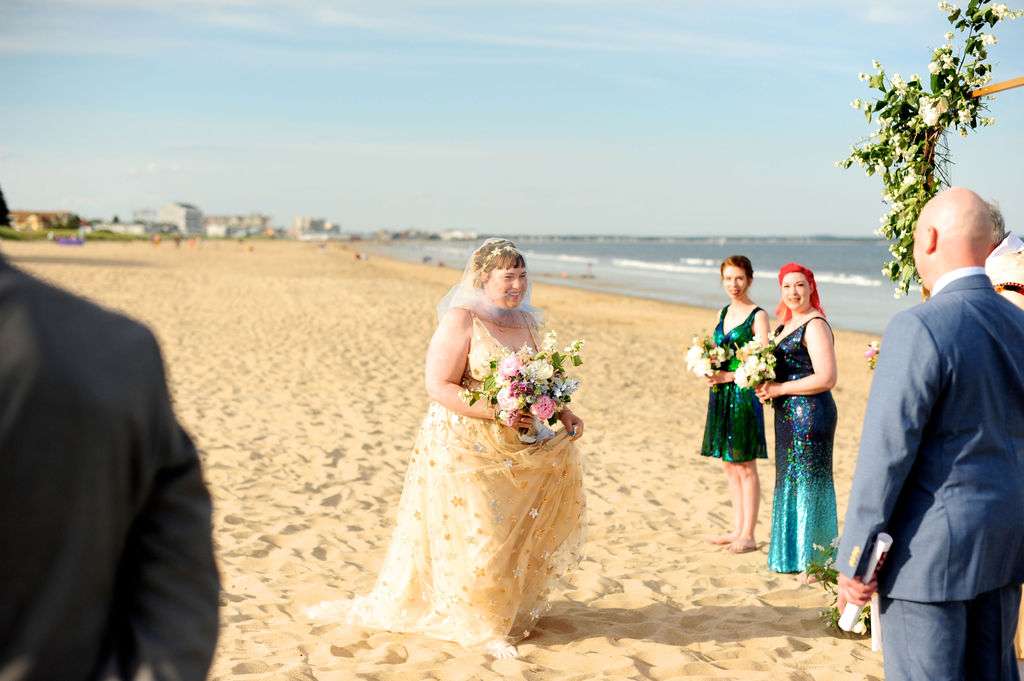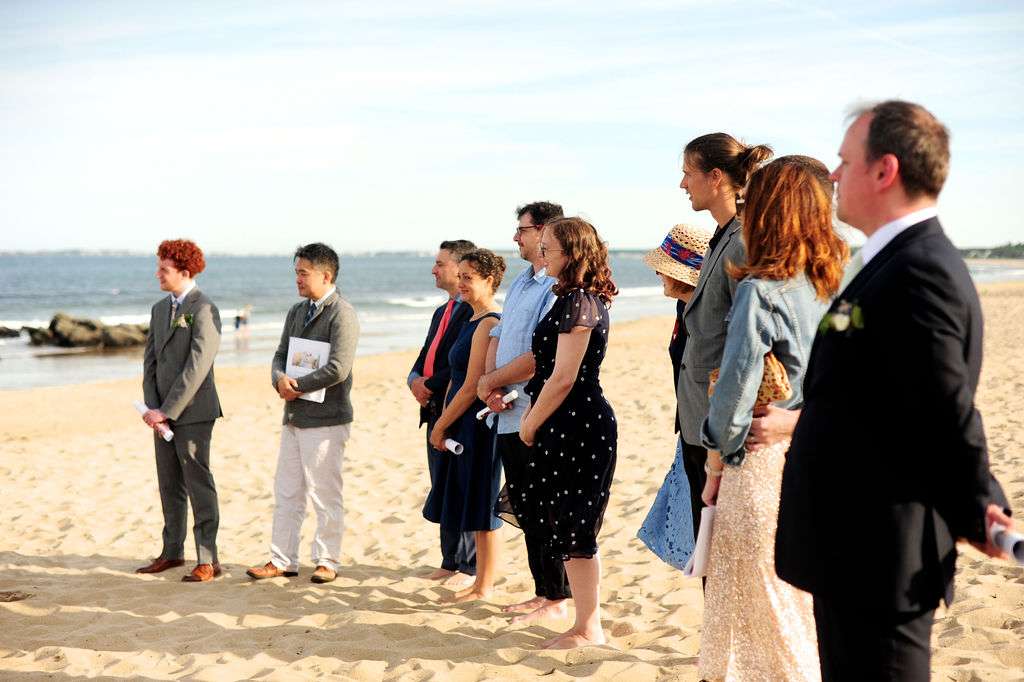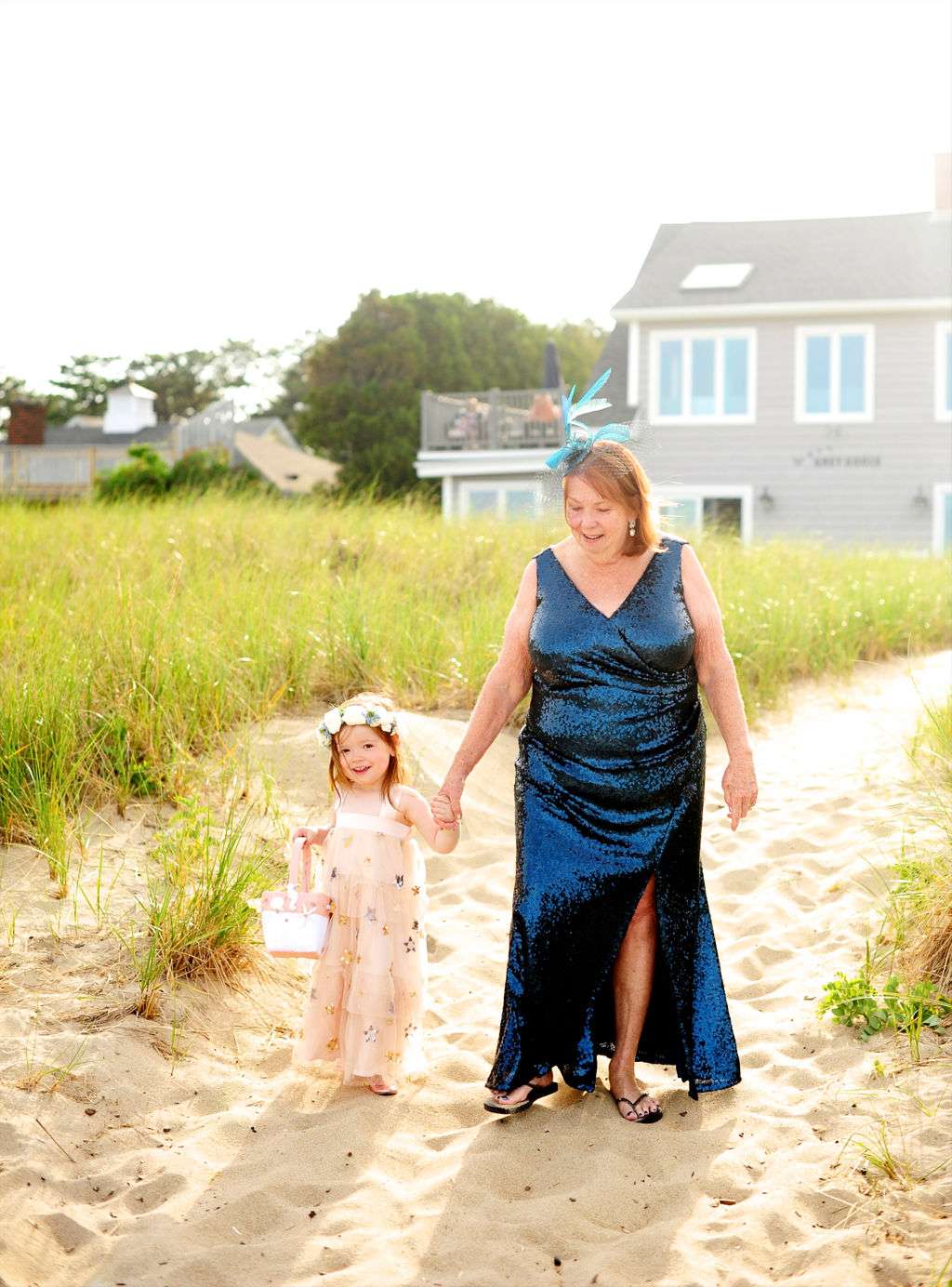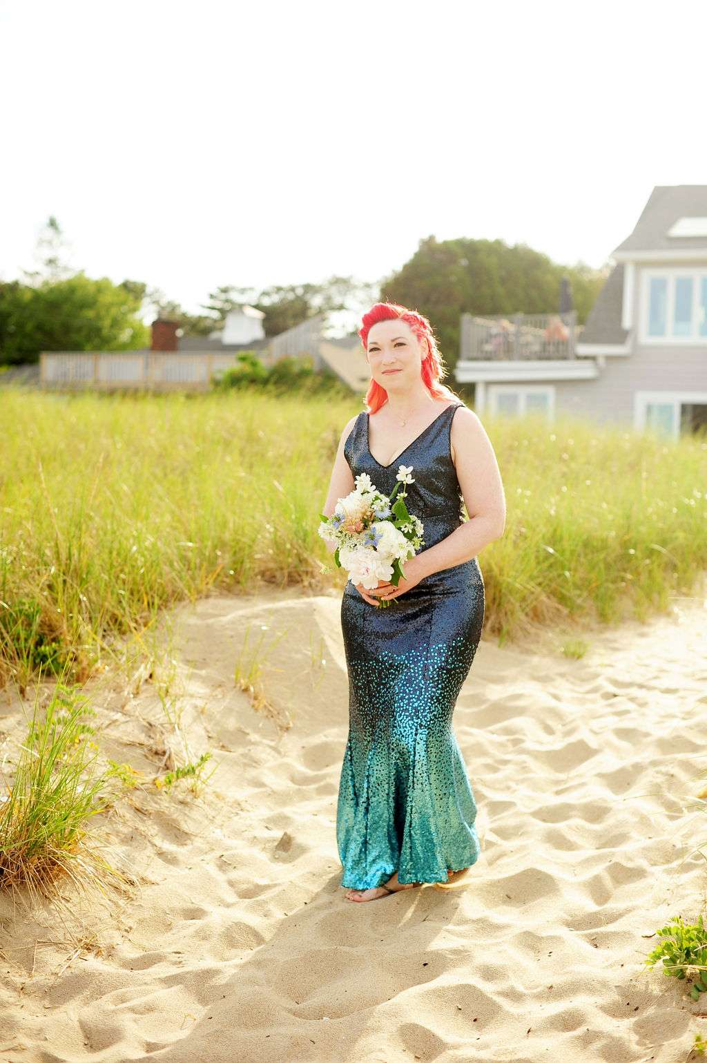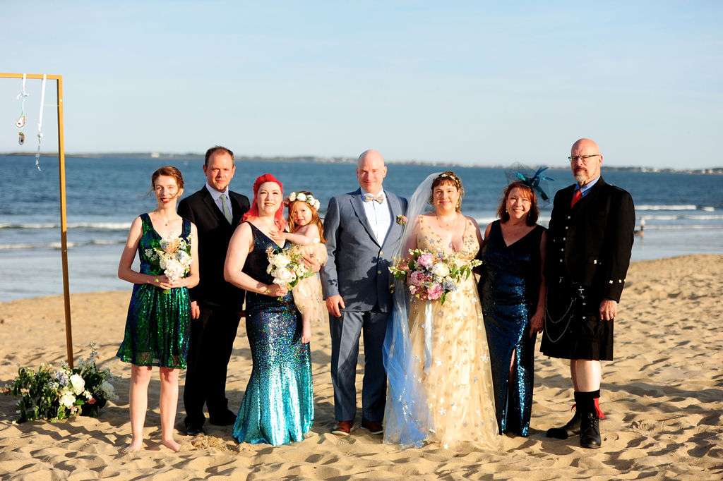 Emma and Will rented a house for their June wedding and the bride’s father married them on the beach. Their friends sang to them during ceremony, Emma’s niece was their flower girl and she choose sequin dresses for the bridal party because she wanted everybody to sparkle!