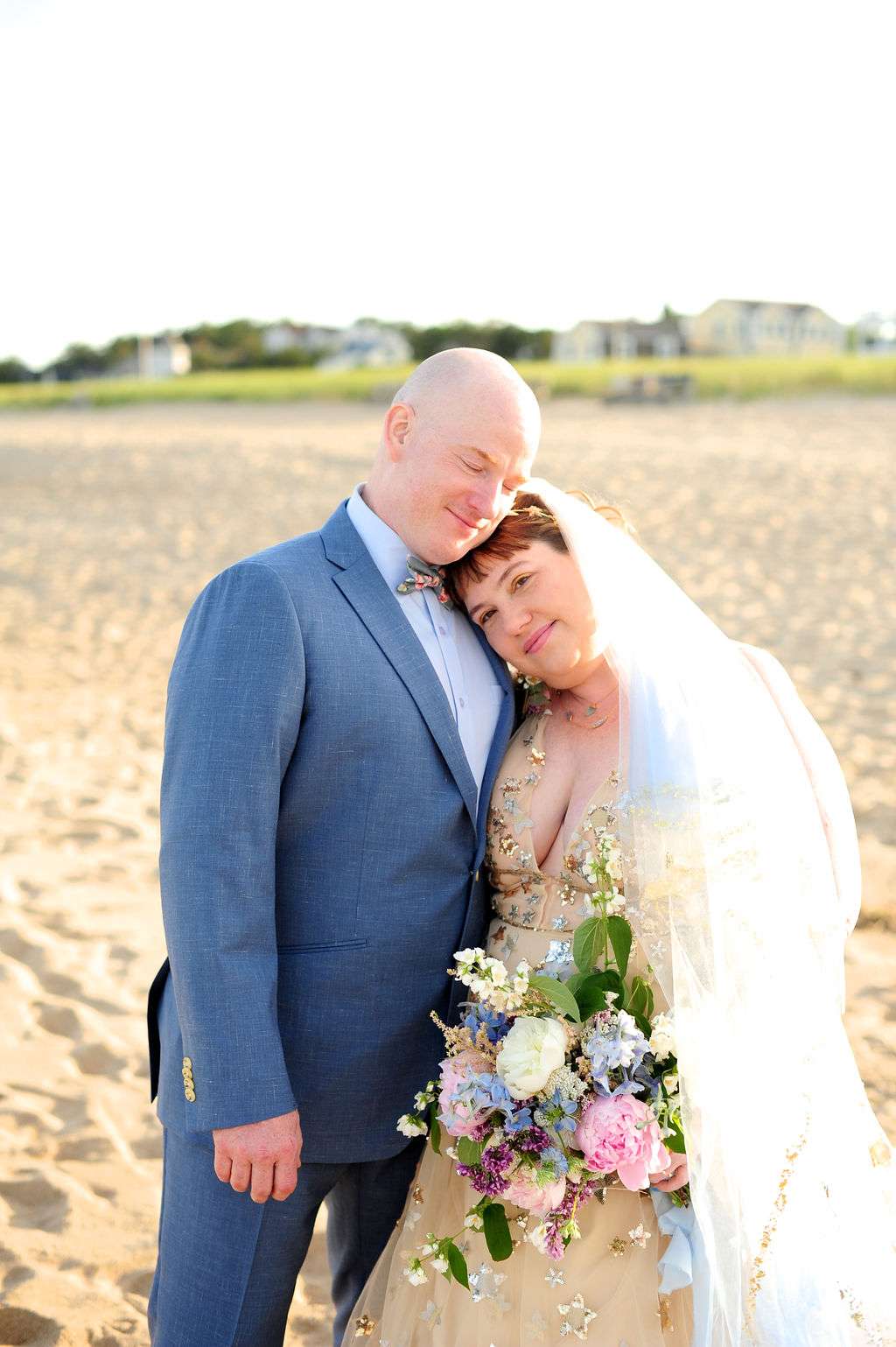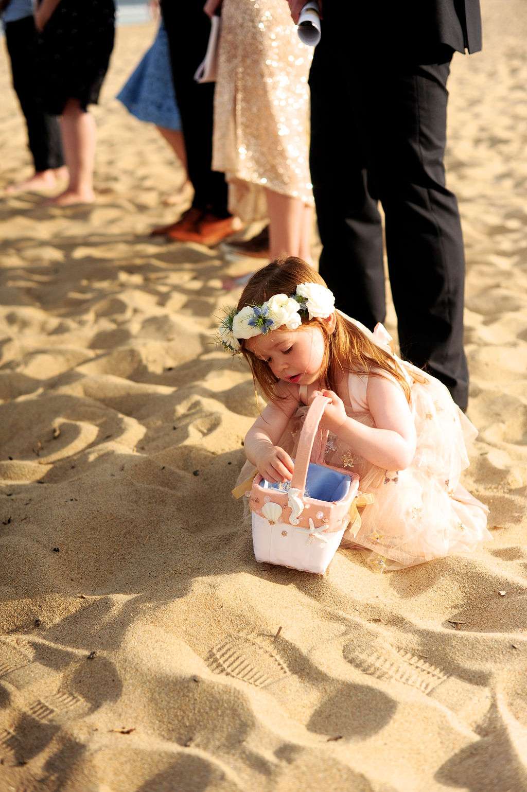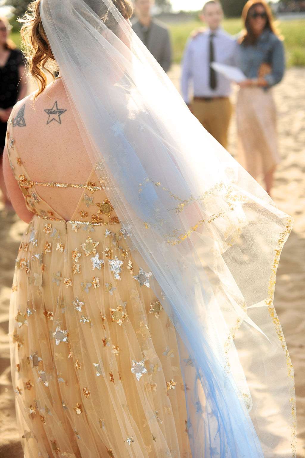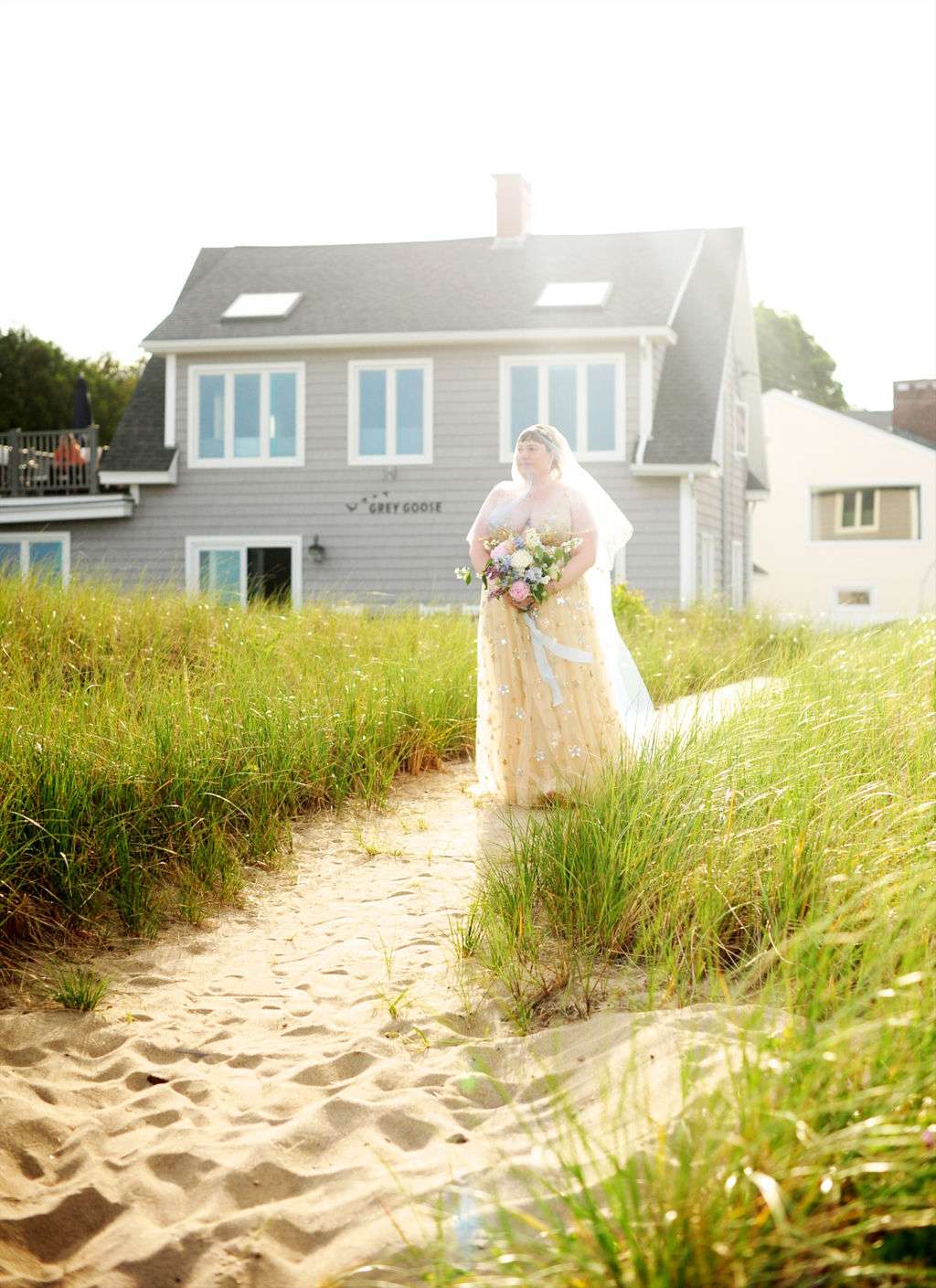Emma and Will rented a house for their June wedding and the bride’s father married them on the beach. Their friends sang to them during ceremony, Emma’s niece was their flower girl and she choose sequin dresses for the bridal party because she wanted everybody to sparkle!