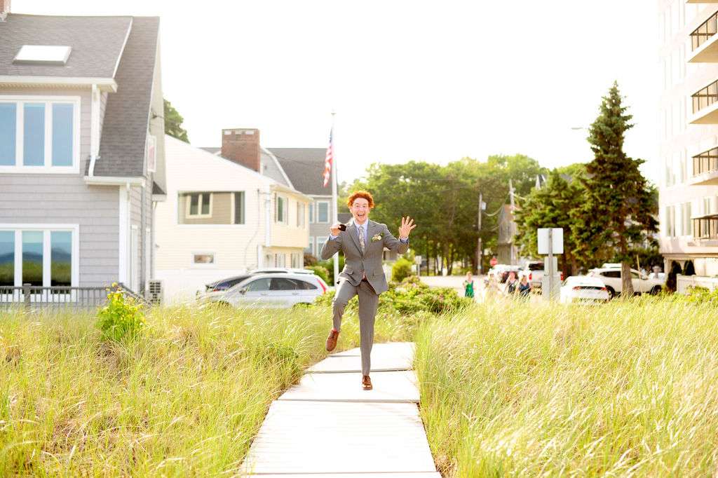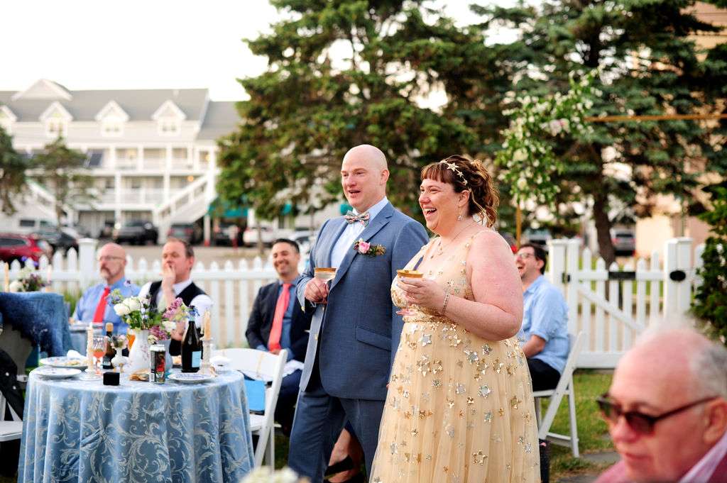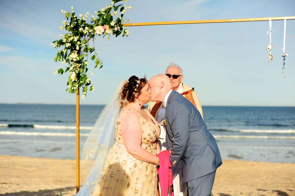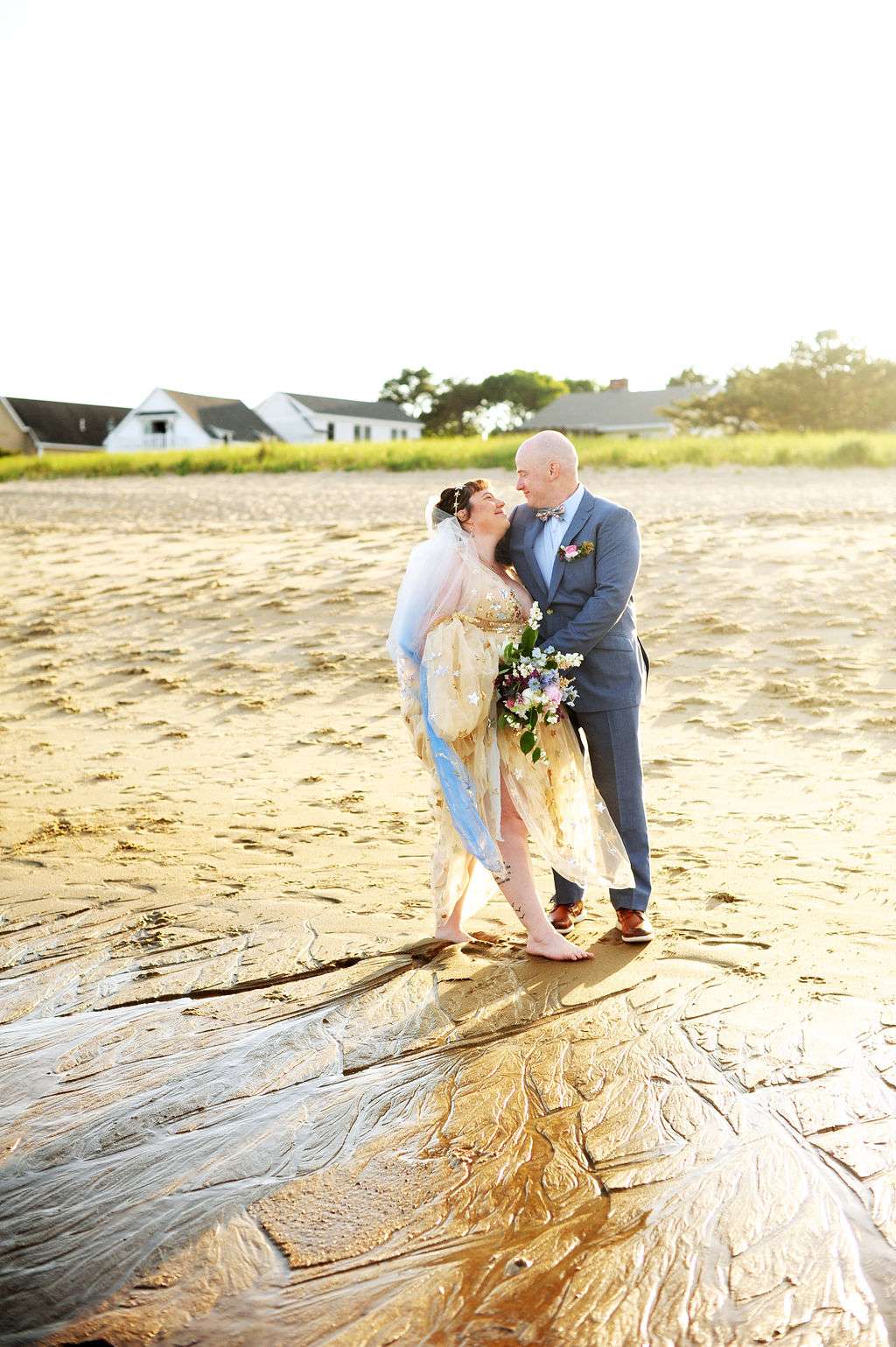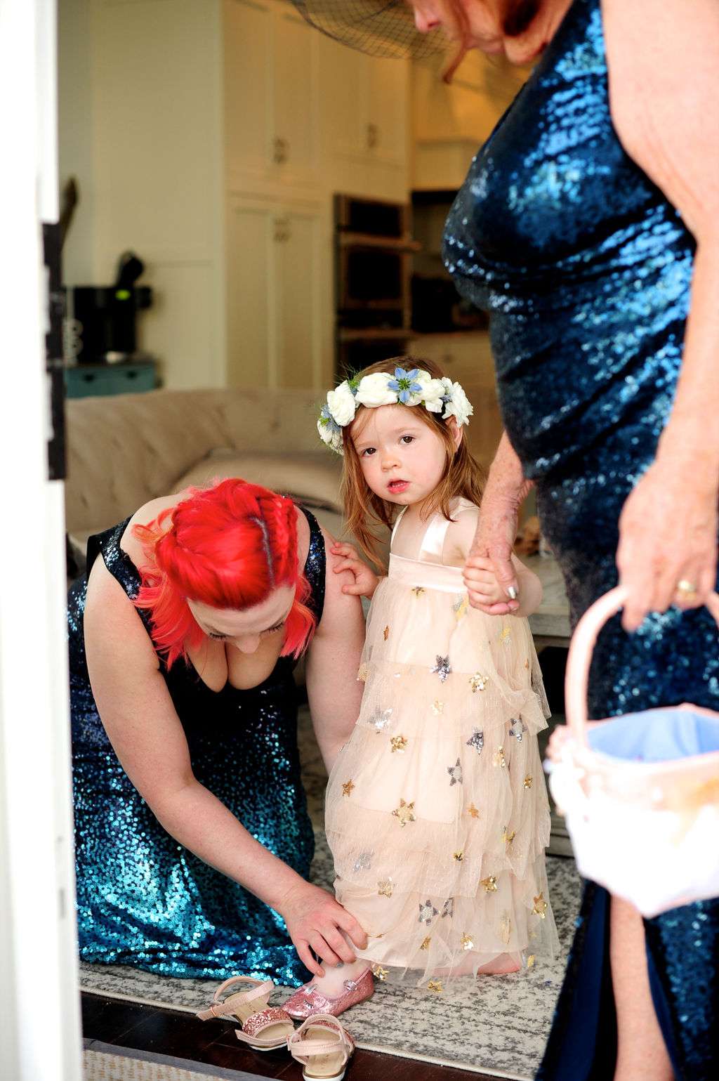 Emma and Will rented a house for their June wedding and the bride’s father married them on the beach. Their friends sang to them during ceremony, Emma’s niece was their flower girl and she choose sequin dresses for the bridal party because she wanted everybody to sparkle!
