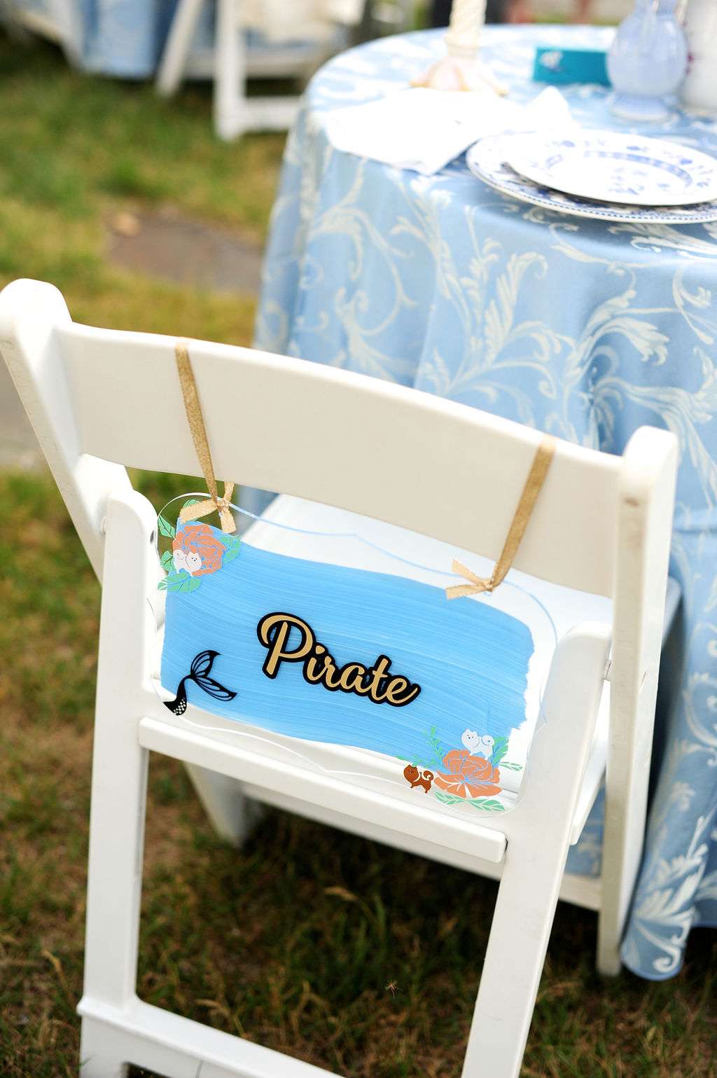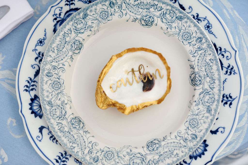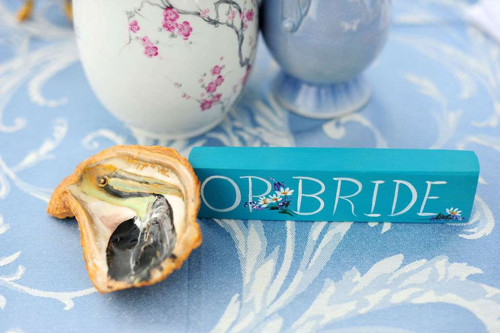 “We also incorporated kintsugi which is Japanese art of repairing a break with gold to make it more beautiful. We had special nods to our pets in our handmade signs and the custom cuff links I had made for Will. I wanted to bring in the ocean which we did with oyster shell place names, in the custom cookies, in the gift bags and the mermaid and pirate signs and cake forks.”