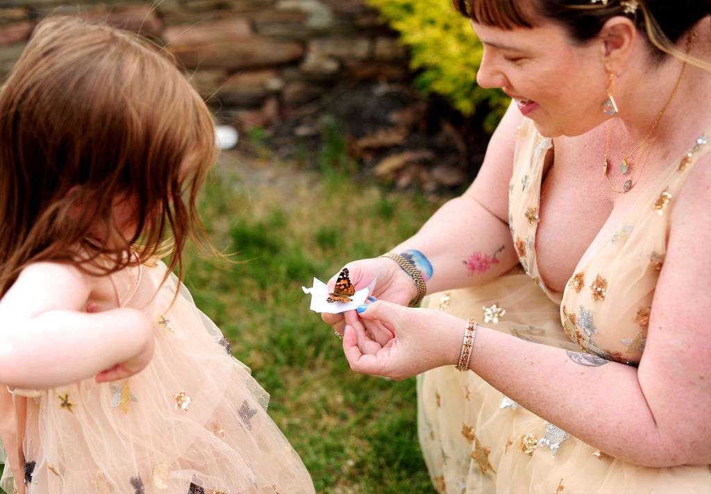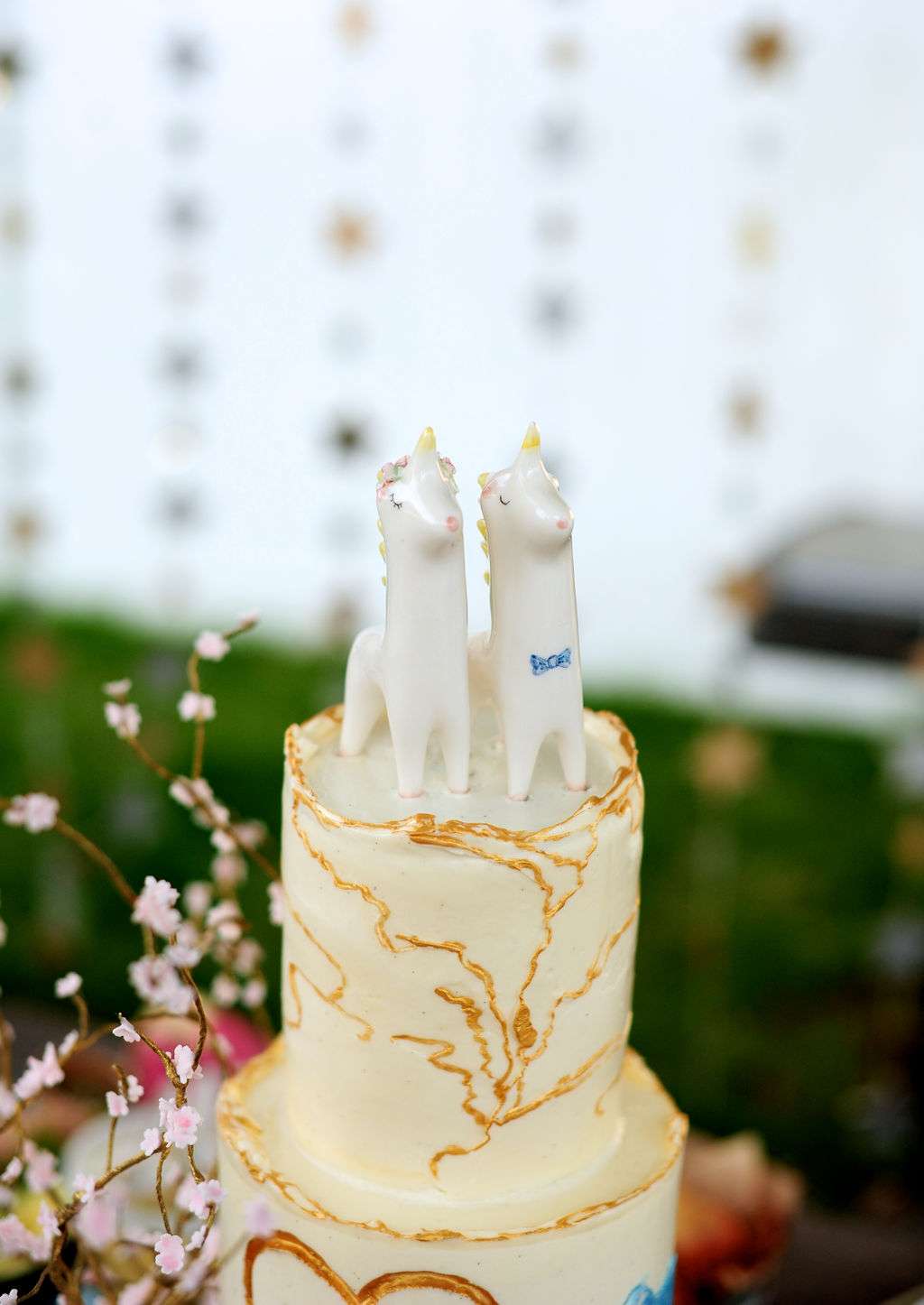 The cake, made by Hanami Cake Design, was based on the theme of unicorns, French percaline and gold. “I was very drawn to the Japanese influence in Martha’s cake decoration which made total sense once she told me she had lived in Japan”, Emma explained. “We combined a cherry blossom tree with our initials and gold kintsugi. We chose lemon with strawberry rhubarb jam, and chocolate salted caramel as the flavours. It tasted even better than we had hoped. I am amazed that she took all my ideas and hopes and created a piece of art with them.”